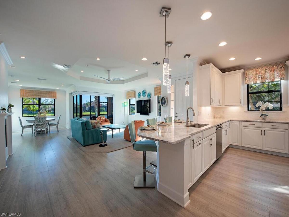 Beautiful 2/3 Bedroom Coach Home in Esplanade Golf & Country Club!This exceptional first-floor coach home offers an inviting open layout with 1,994 square feet of beautifully designed living space, ideal for everyday comfort and effortless entertaining. The highly sought-after, meticulously maintained end unit is being sold partially furnished and is nestled within a pristine golf, tennis, and pickleball community. Esplanade is also planning to add four new indoor pickleball courts within 1+ yrs. as part of the Capital Improvement Package (CIP) which also includes renovating the Bahama Bar, enlarging the golf range, etc.. The assessment is $8051 and the seller will be paying the assessment. Let's begin your mornings on the private screened lanai, coffee in hand, as you take in serene water views and stunning sunrises. The thoughtful floor plan flows effortlessly from room to room and lives even larger than its square footage suggests. Peaceful lake views can be enjoyed from the living room, dining area, and primary suite, while the lanai offers a tranquil retreat overlooking the water. The home features upgraded Mohawk Wood Plus laminate flooring throughout the main living areas and bedrooms, complemented by 24-inch ceramic tile in all bathrooms and the laundry room. Additional upgrades include crown molding, hurricane-impact windows and doors, quartz countertops, stainless steel GE appliances, white cabinetry, a wine fridge, fireplace, pantry, APCO UV light system in the HVAC, Everpure EF6000 kitchen water filtration system, and upgraded lighting throughout, including elegant shelf lighting flanking the feature wall in the main living area.The spacious primary suite includes dual sinks, a walk-in shower, and a large walk-in closet. The guest bedroom offers its own private bathroom with a dual-showerhead system and direct access to a charming outdoor courtyard perfect for enjoying sunsets. Both bedrooms are equipped with quality shade systems for comfort and privacy. The den/office is partially enclosed and can easily be converted into a third bedroom by adding barn doors that were previously installed in the doorway. A sports/social membership is included with the home and provides limited golf opportunities throughout the year. As a resident of Esplanade, you'll enjoy an unmatched lifestyle with access to world-class amenities, including a championship golf course, state-of-the-art clubhouse, resort-style pool with food and beverage service, private cabanas, tennis and pickleball courts, walking and biking trails, a dog park, fitness center, full-service salon and spa, wellness center, tiki bar, and more. Esplanade offers convenient access to I-75, the airport, top-rated restaurants, premier shopping, and the stunning beaches of the Gulf Coast. Known for its vibrant, active social scene, the community delivers the perfect blend of luxury, recreation, and lifestyle.