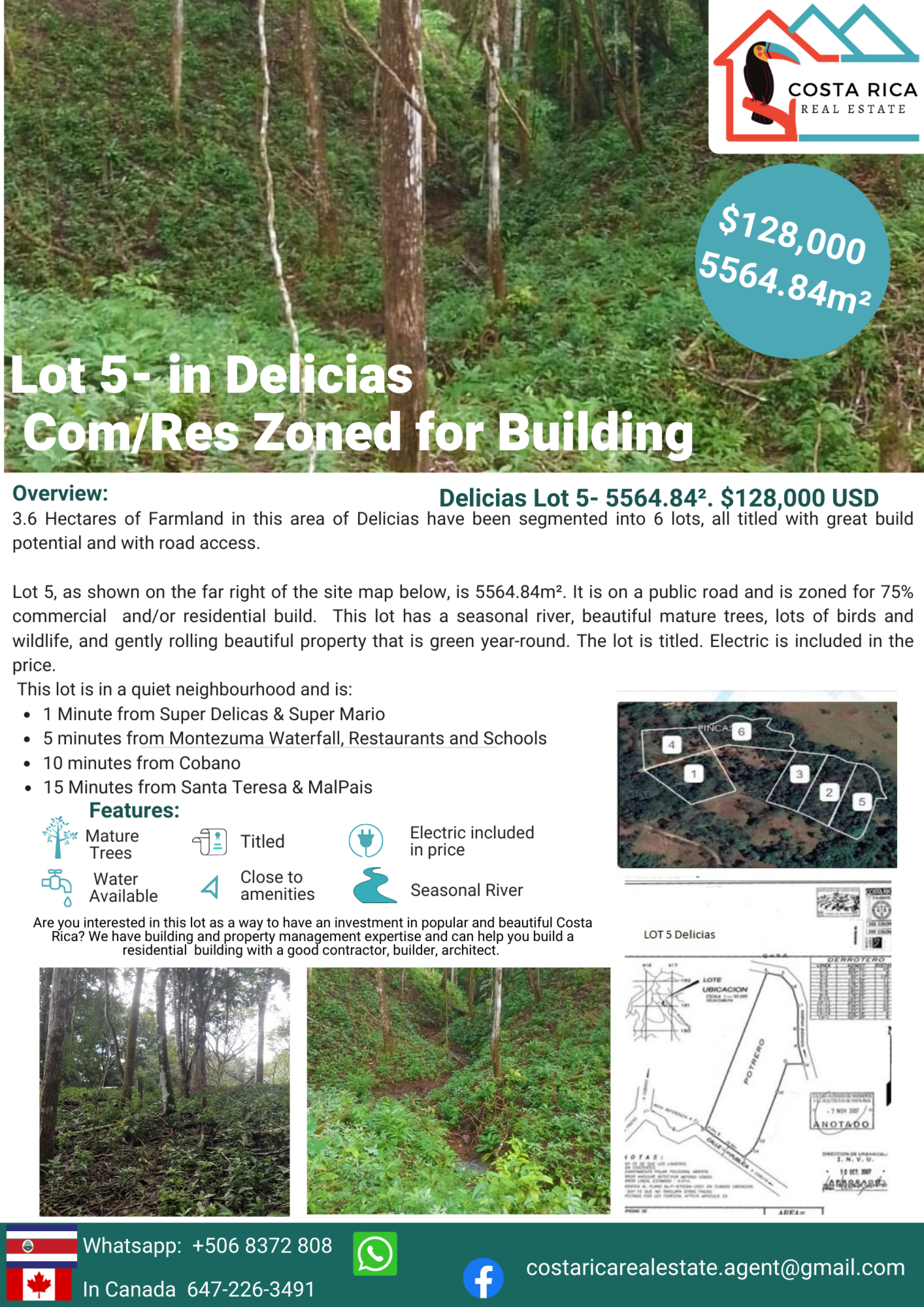 A perfect way to invest in Costa Rica and build your home or business. Lot 5 zoned Com/Res Zoned for Building - in Delicias in Nicoya Peninsula . A beautiful 3.6 Hectares of Farmland in this area of Delicias have been segmented into 6 lots, all titled with great build potential and with road access. Lot 5, as shown on the far right of the site map pictured, is 5564.84m². It is on a public road and is zoned for 75% commercial and/or residential build. This lot has a seasonal river, beautiful mature trees, lots of birds and wildlife, and gently rolling beautiful property that is green year-round. The lot is titled. Electric is included in the price. This lot is in a quiet neighbourhood and is: 1 Minute from Super Delicas & Super Mario, 5 minutes from Montezuma Waterfall, Restaurants and Schools, 10 minutes from Cobano , 15 Minutes from Santa Teresa & MalPais Contact us directly about this and other properties and how to build in Costa Rica. April has 30 years experience in Costa Rica and contacts in Costa Rica, Europe, US and Canada. . email: costaricarealestate.agent@gmail.com | Website https://www.costarica-realestate.co | WhatsApp +1 506 8372 8082 (April, located in Costa Rica). In Canada call or text Karen at 1-647-226-3491 (using WhatsApp or direct).