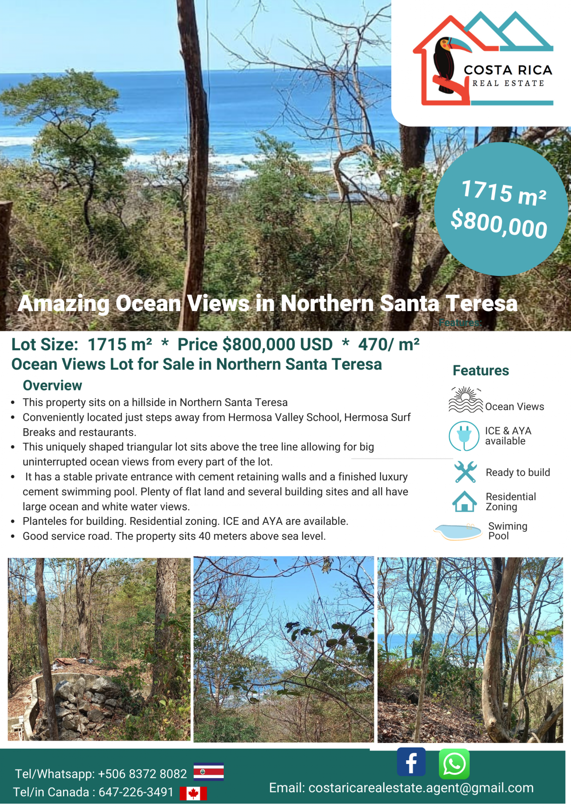 Amazing Ocean Views in Northern Santa Teresa This property sits on a hillside in N.S.T. Conveniently located just steps away from Hermosa Valley School, Hermosa Surf Breaks and restaurants. A perfect place to build your home in paradise. This uniquely shaped triangular lot sits above the tree line allowing for big uninterrupted ocean views from every part of this lot. It has a stable private entrance with cement retaining walls and a finished luxury cement swimming pool. There are several building sites and all have large ocean and white water views. Planteles for building. Residential zoning. ICE and AYA are available. Good service road. The property sits 40 meters above sea level. Lot size 1715 m². Price $800,000 USD, $470 usd / m² Contact us directly email: costaricarealestate.agent@gmail.com | Website https://www.costarica-realestate.co | WhatsApp +1 506 8372 8082 (April, located in Costa Rica, text or call). In Canada call or text Karen at 1-647-226-3491 (using WhatsApp or direct). April can also advise about building in Costa Rica. She has 30+ years living in Costa Rica and working in property management.