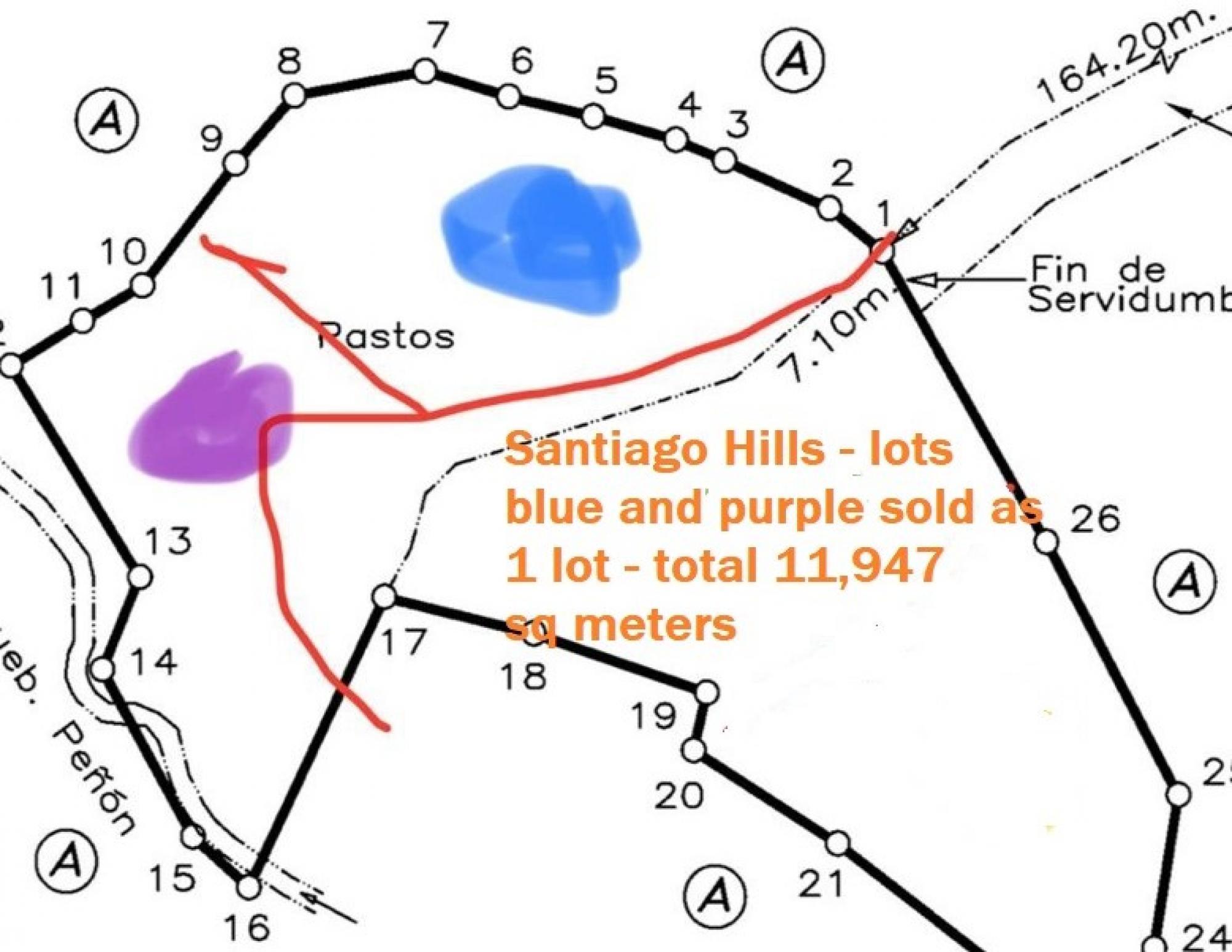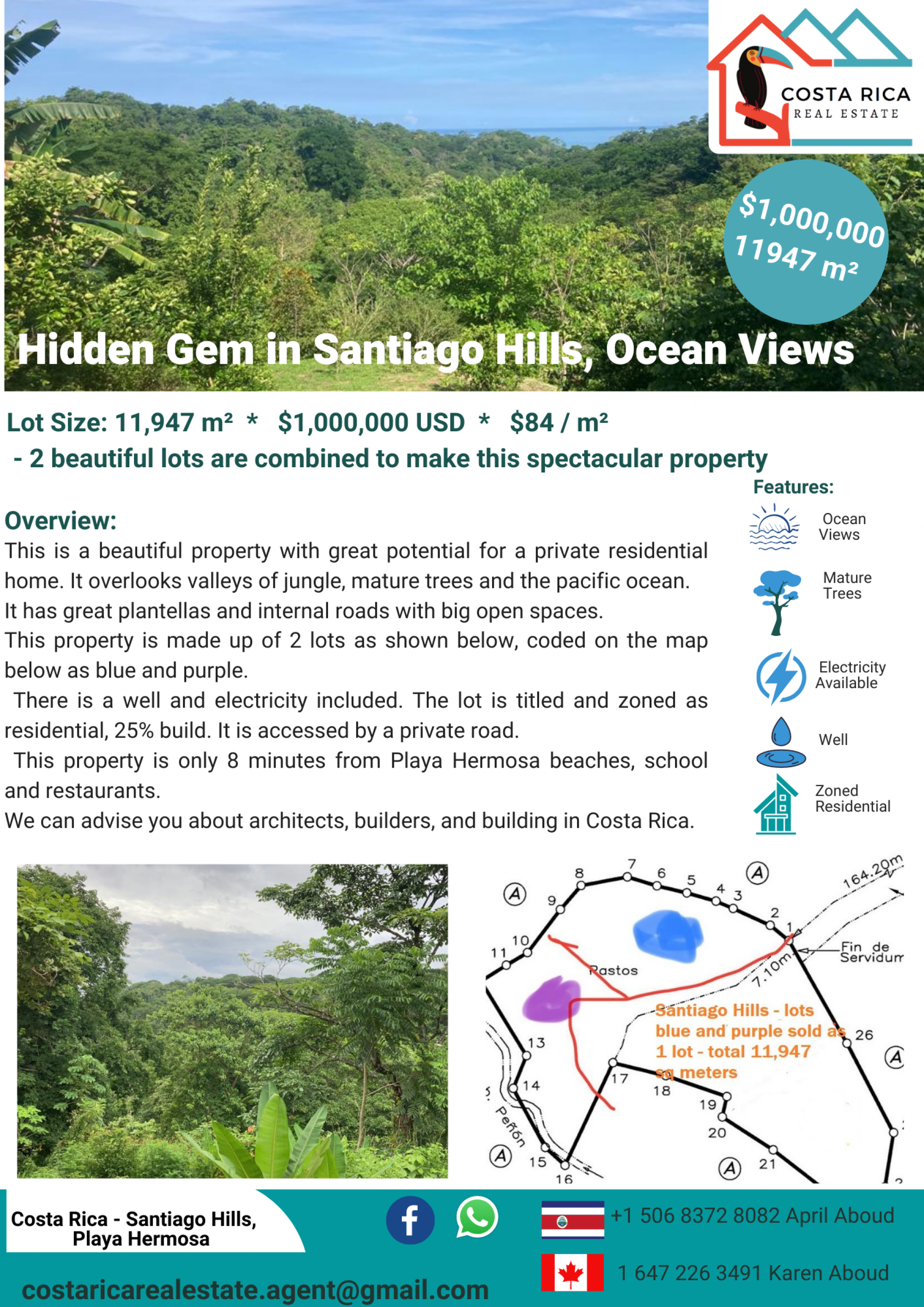 Hidden Gem in Santiago Hills, Ocean Views. Lot Size: 11,947 m² * $1,000,000 USD * $84 / m² - 2 beautiful lots are combined to make this spectacular property. This is a beautiful property with great potential for a private residential home. It overlooks valleys of jungle, mature trees and the pacific ocean. It has great plantellas, internal roads and big open spaces. This property is made up of 2 lots as shown in the picture provided with the lots coded on the map as blue and purple. There is a well and electricity included. The lot is titled and zoned as residential, 25% build. It is accessed by a private road. It is only 8 minutes from Playa Hermosa beaches, school and restaurants. We can advise you about architects, builders, and building in Costa Rica. April has 30+ years in Costa Rica and will help you with this property or find another one for you. Check out our website. Website https://www.costarica-realestate.co To contact us: email: costaricarealestate.agent@gmail.com WhatsApp +1 506 8372 8082 (April, located in Costa Rica). In Canada call or text Karen at 1-647-226-3491 (using WhatsApp or direct)