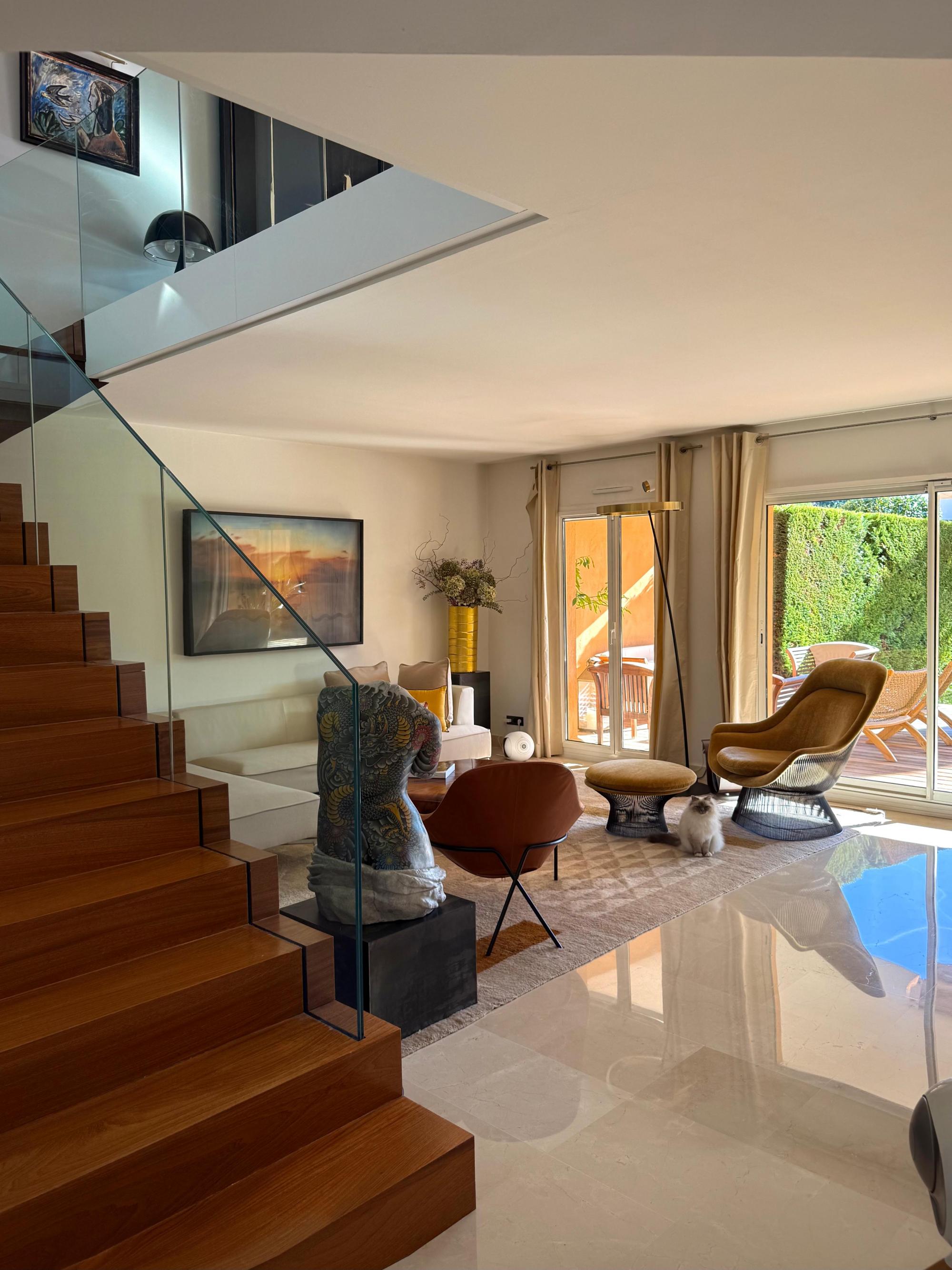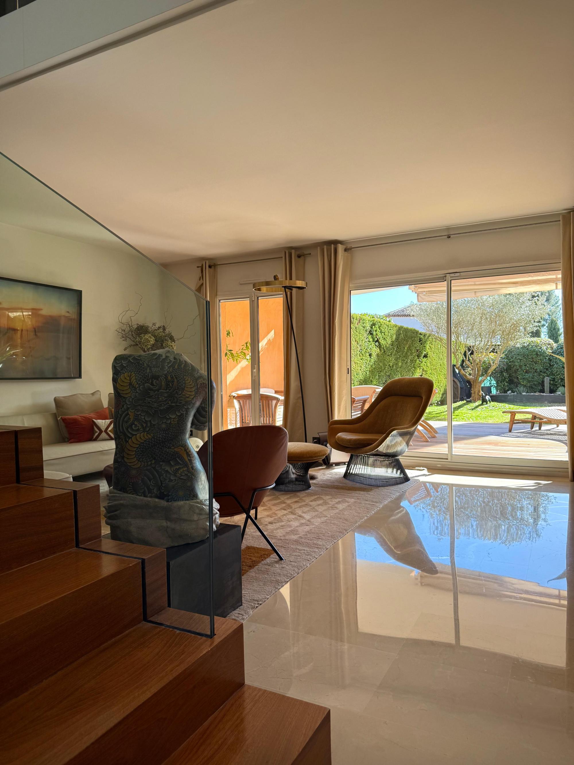 The ground floor features magnificent marble flooring, setting an elegant tone from the entrance. This level opens onto a spacious, light-filled living area extended by a refined TV lounge. Large openings create a seamless connection with the private garden, offering a calm and intimate atmosphere. The ground floor also includes a beautiful master suite with dressing room and bathroom, as well as a separate laundry room.
