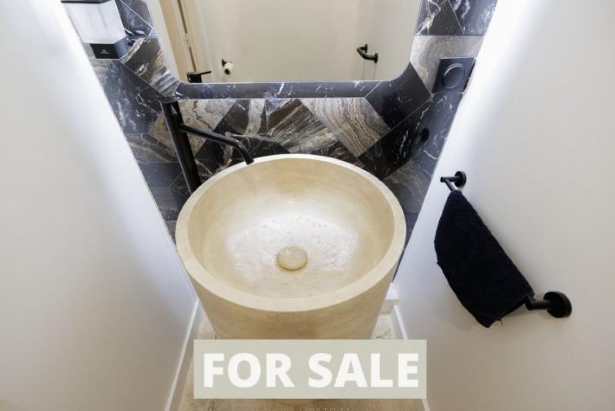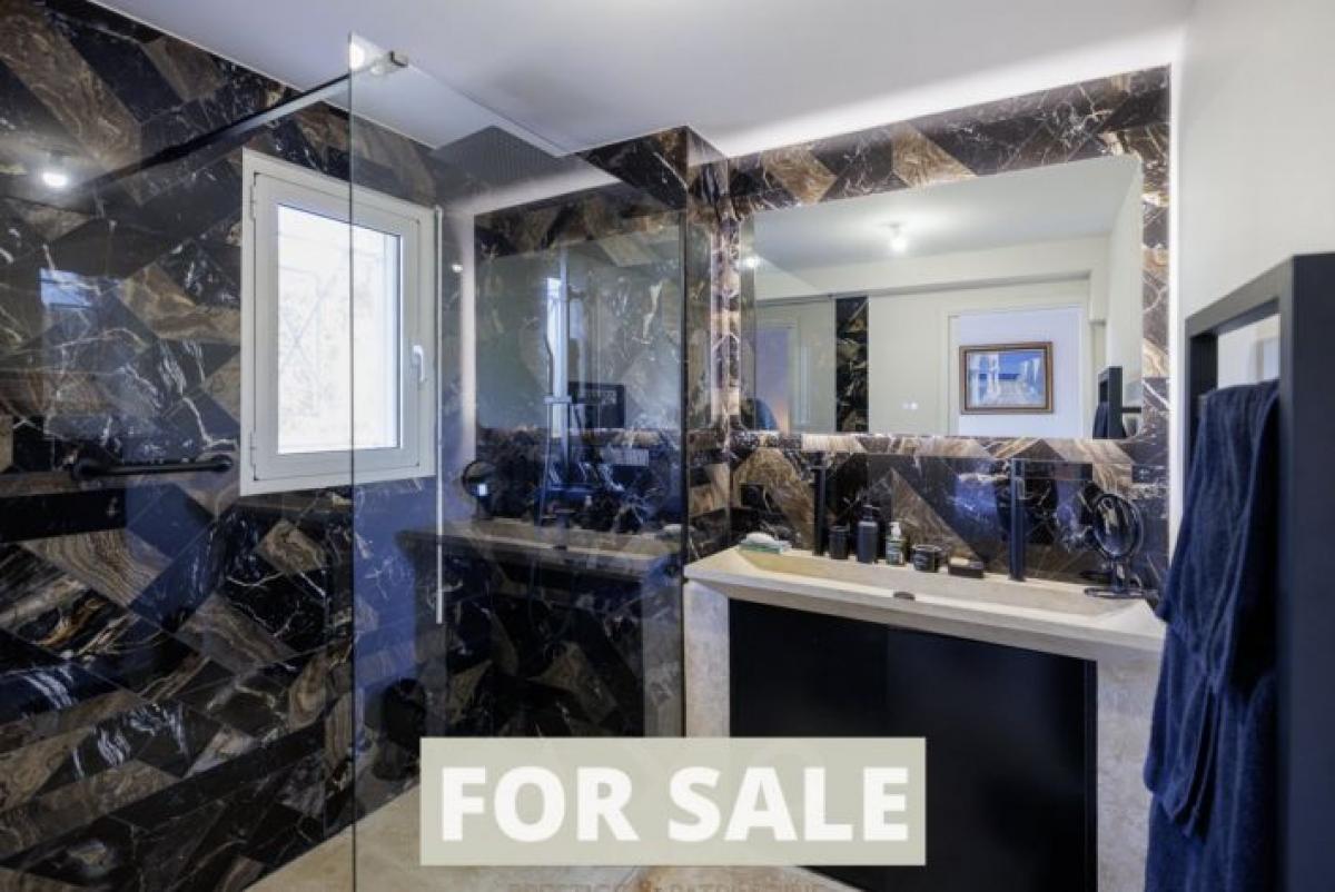 The decidedly high-end amenities underscore the exclusivity of the residence: travertine flooring, a custom-designed dressing room, a kitchen with marble countertops, a sculptural glass staircase, stone washbasins, reversible air conditioning, a reinforced front door, and an alarm system.