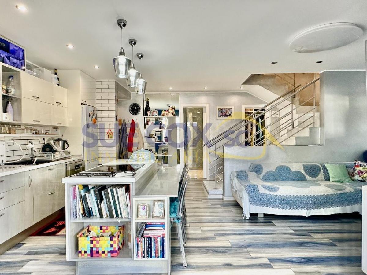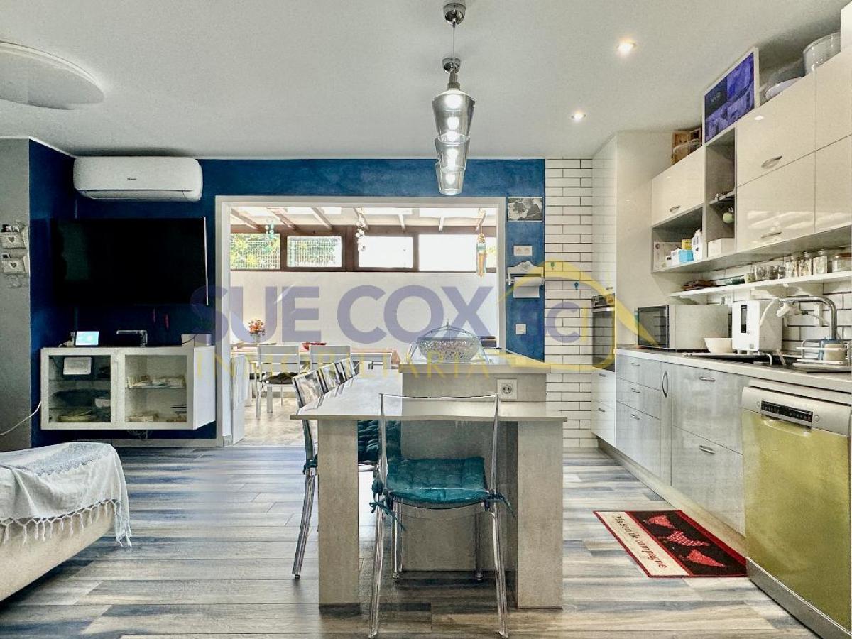 The front door leads into a spacious, modern open-plan kitchen and living area, finished to a high standard. This space flows directly into a large conservatory, currently arranged as a dining room, with doors opening onto the terrace perfect for entertaining or family gatherings. On the ground floor there is a stylish, contemporary bathroom with high-level windows, offering a full-size bathtub and a separate walk-in shower, twin wash basins set into a vanity unit, WC, and bidet. Additional features on this level include two under-stairs storage cupboards and a large integrated wardrobe, providing excellent practical storage.
