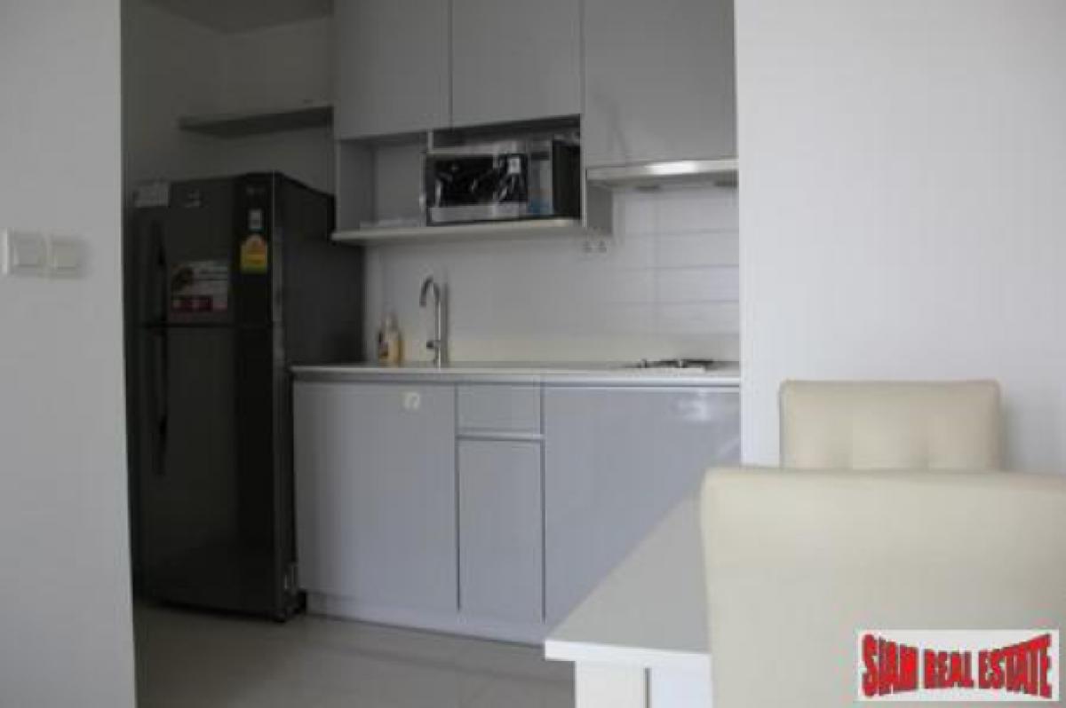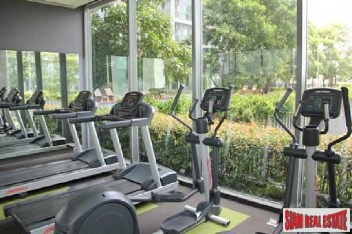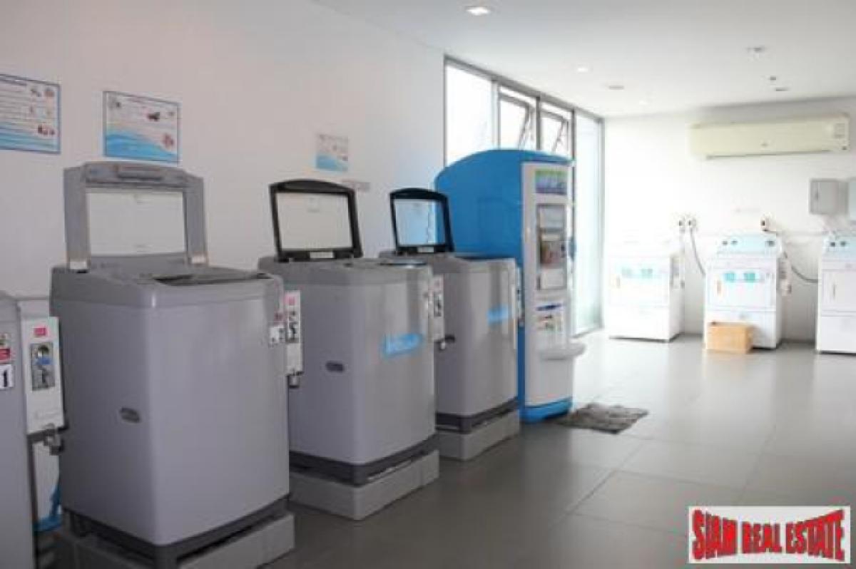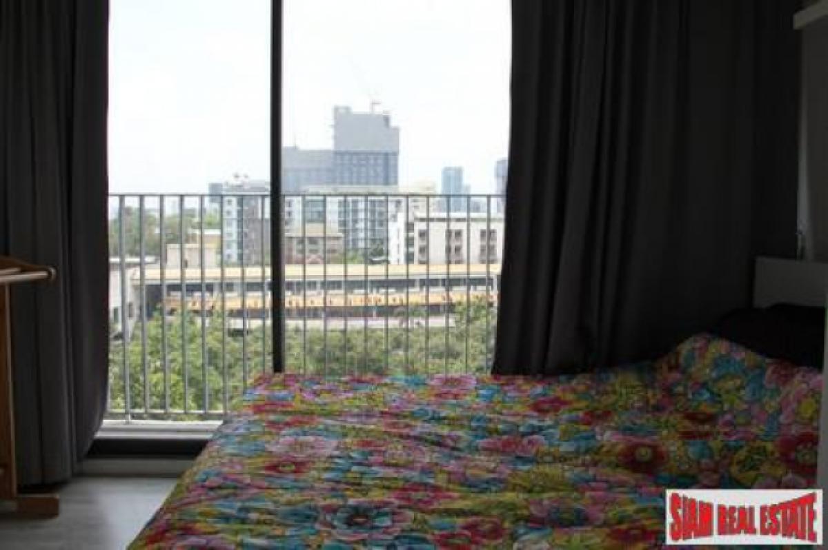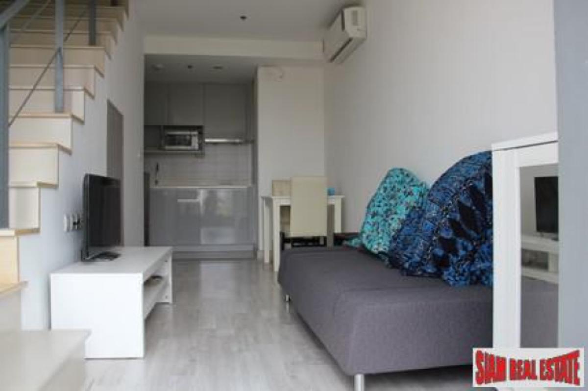 A comfortable one bedroom duplex is for sale in the ideo Mobi Sukhumvit 81. It is a very efficient duplex with the living area on the first floor and the bedroom on the second. The apartment is situated on Tower B and located on floor 4 and 5.The living area includes a sofa and TV, table and chairs for two and a small kitchen with a stovetop, refrigerator and microwave. Under the stairway there is a small washing machine for convenience. Upstairs there is a balcony off the bedroom with an open view of green trees and some buildings in a far distance.