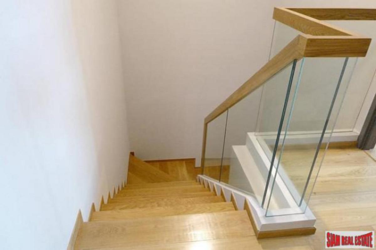 This is a two bedroom, two-storey duplex style condo for sale in popular Thong Lo. The unit has an open view and is nice, bright and light with 83 sqm of living space.There is an open living plan with living room, dining area and western kitchen. The kitchen is fully equipped with a stovetop, oven, microwave, refrigerator and washing machine. The unit has light wood flooring in all rooms and staircase.