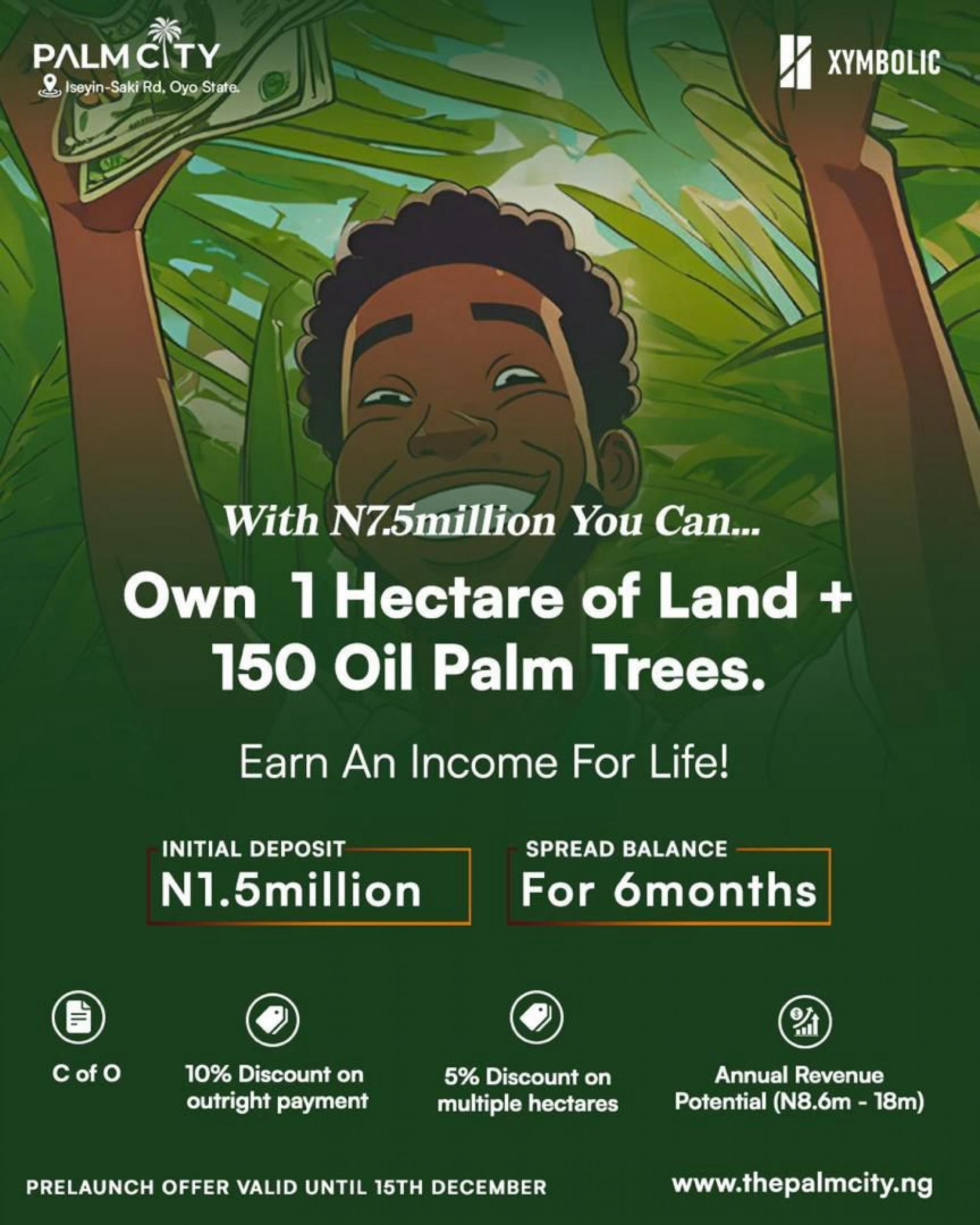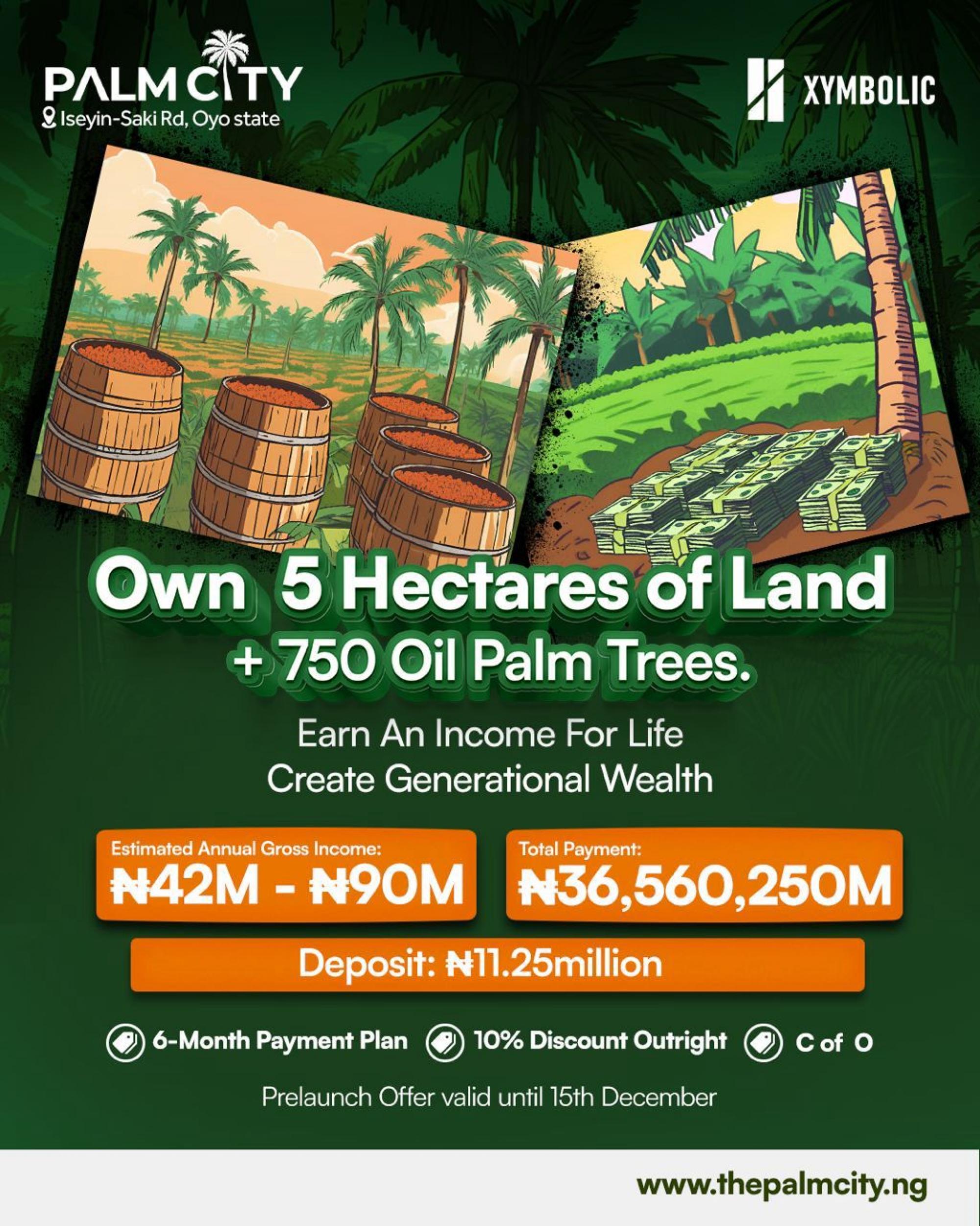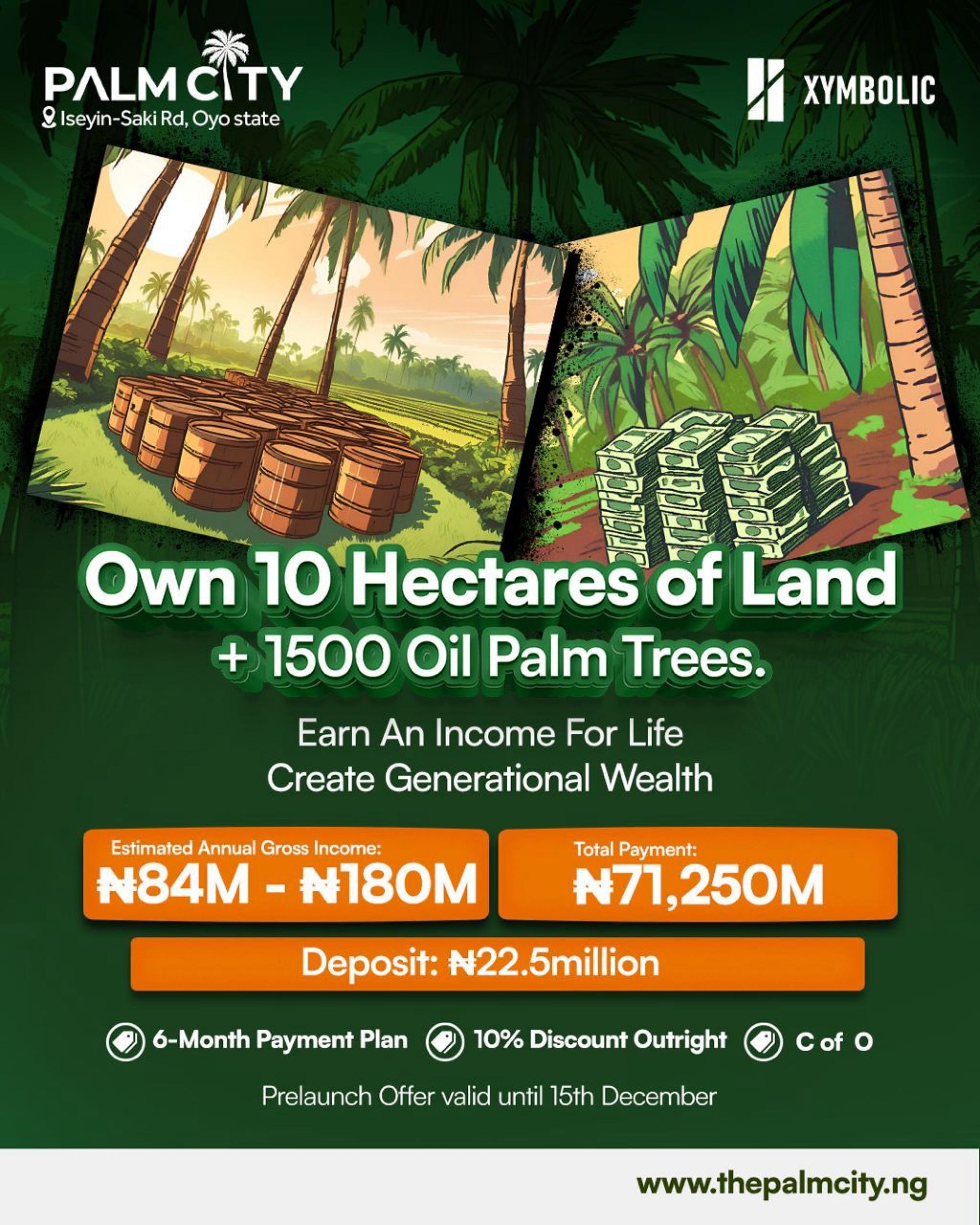 2025 UPDATED LISTING, THE PALM CITY. Palm City offers you an opportunity to own an asset that can give you consistent cashflow for up to 40 years. *PALM CITY PRICES *1 Acre (6 Plots): N3,200,000 with an initial deposit of N700,000 * *1 Hectare (15 Plots): N8,000,000 with an initial deposit of N1,500,000