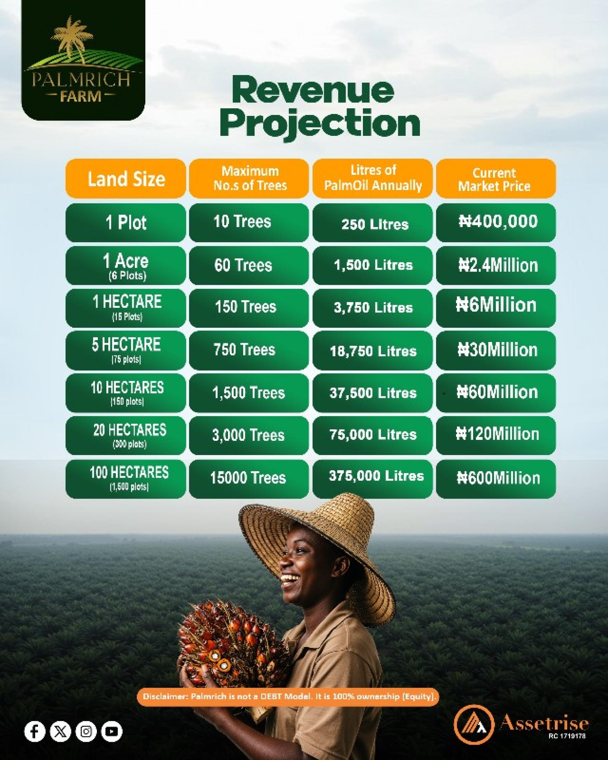 2026 UPDATED LISTING OnThe Palmrich Limited Subscribers Model SPV-LLC The Limited Subscribers Model empowers groups of individuals to collectively own land or shares in an SPV mapped mapped to specific hectares of oli Palm plantation. The model preserves direct ownership while enabling professional management by Assetrise. It's structured to be democratic, transparent and flexible subscribers can remain passive and receive recurring income, or transition to active management at harvest.This model creates a corporate vehicle (SPV) where members hold equity in both the farm and the entity, promoting accountability, transparency and shared prosperity Location: Odeda LGA, Abeokuta Title: Certificate of Occupancy (CofO) SPV Offer SPV Private (10 acres min) N69,100,000 SPV Family (30 acres min) N207,100,000 SPV Group (50 acres min) N345,100,000 Contact us directly on +2347069652227 for details on the SPV-LLC structure, and other information #RealEstate #RealExMarketplace #Property #BIOFarms