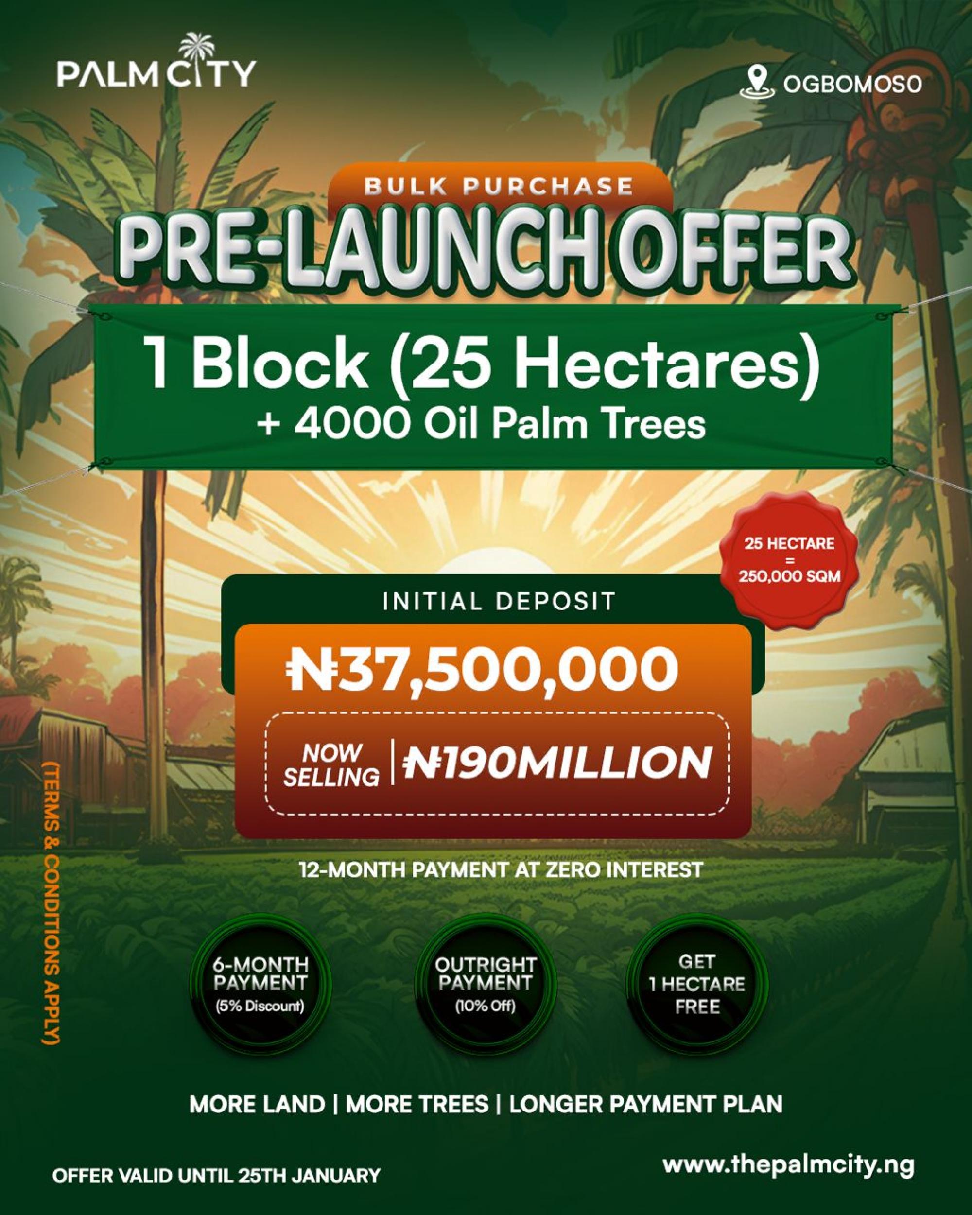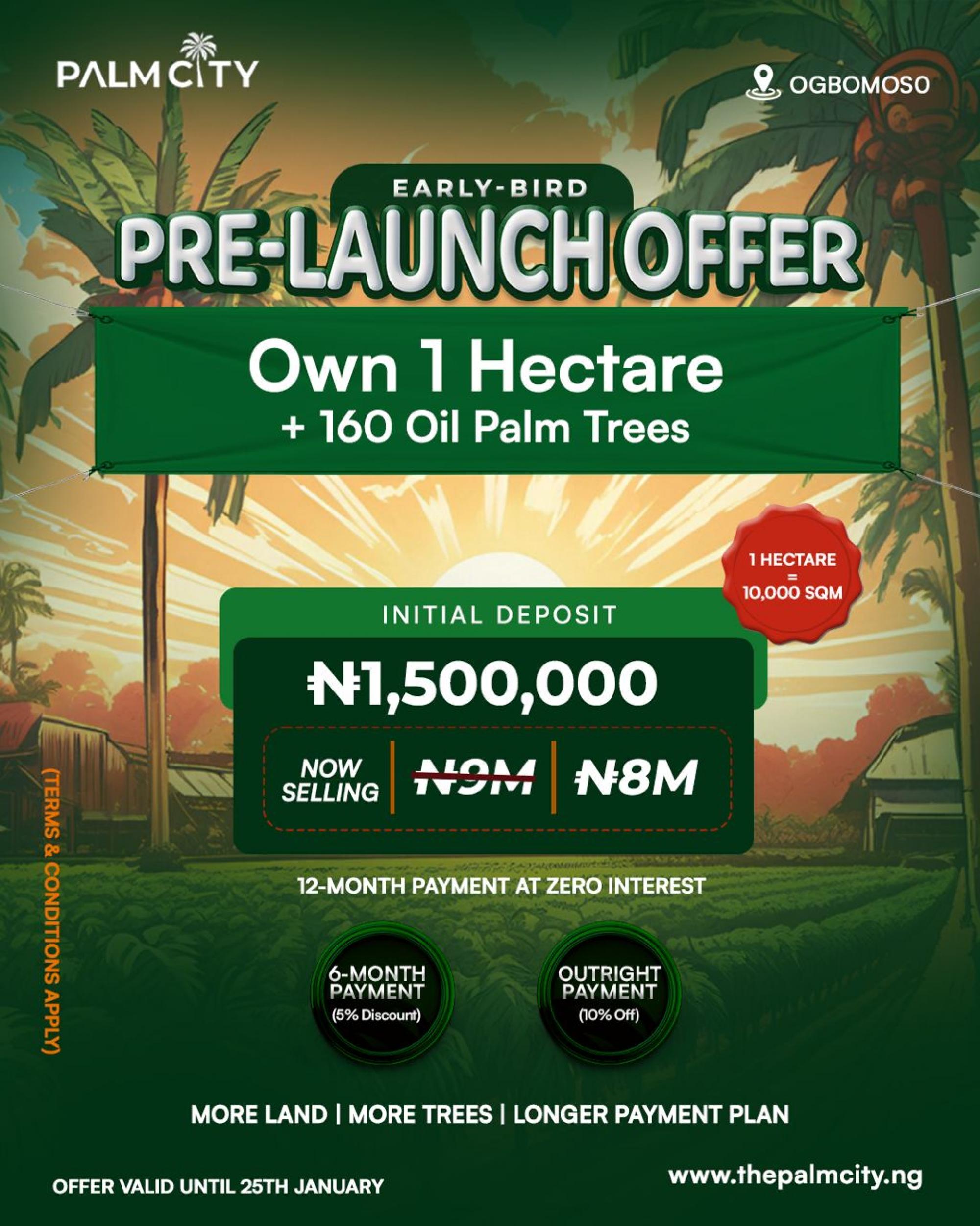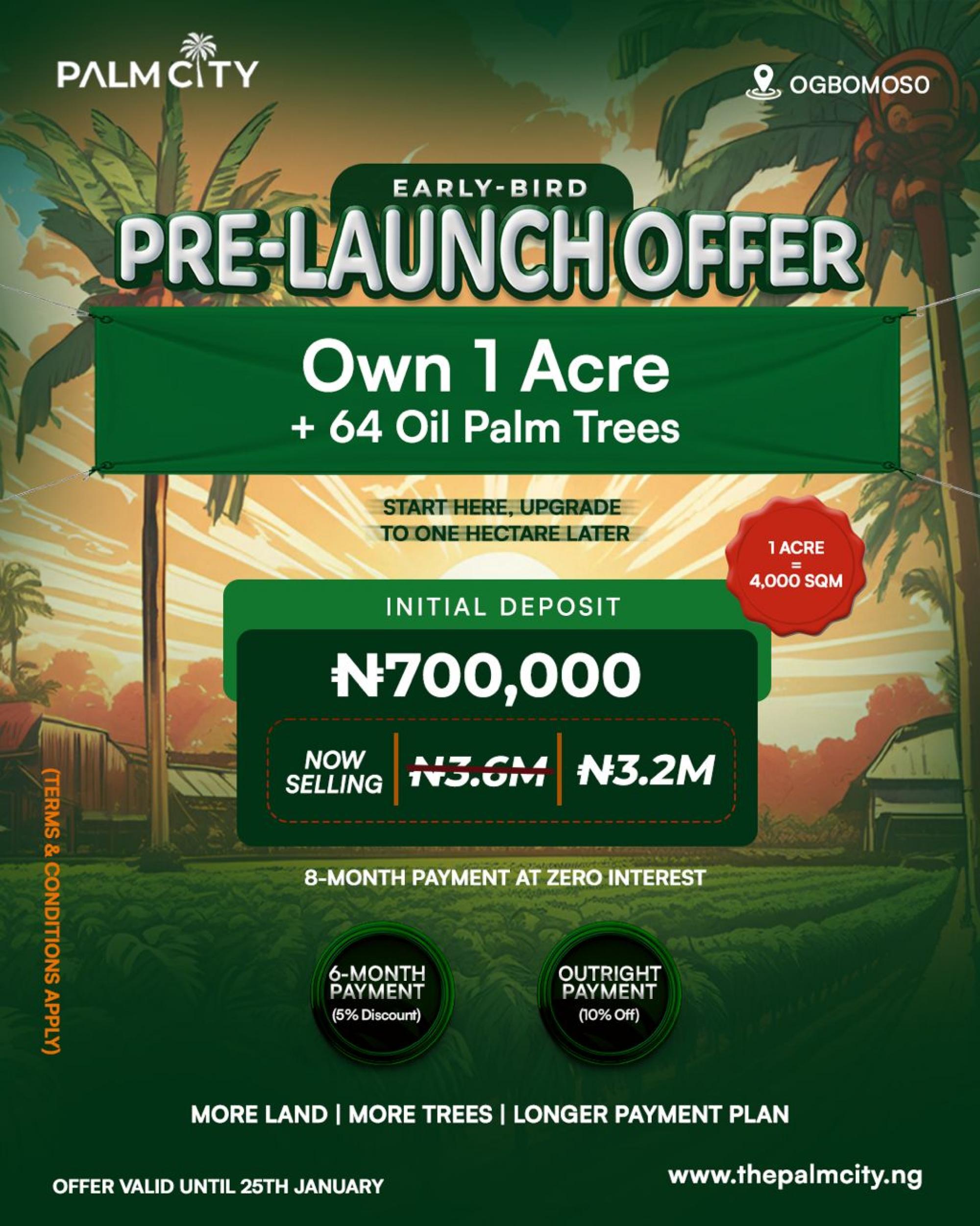 2026 UPDATED LISTING, THE PALM CITY. Palm City offers you an opportunity to own an asset that can give you consistent cashflow for up to 40 years. Contact us for the project brochure. *PALM CITY PRICES *1 Acre (6 Plots): N3,200,000 with an initial deposit of N700,000 * *1 Hectare (15 Plots): N8,000,000 with an initial deposit of N1,500,000