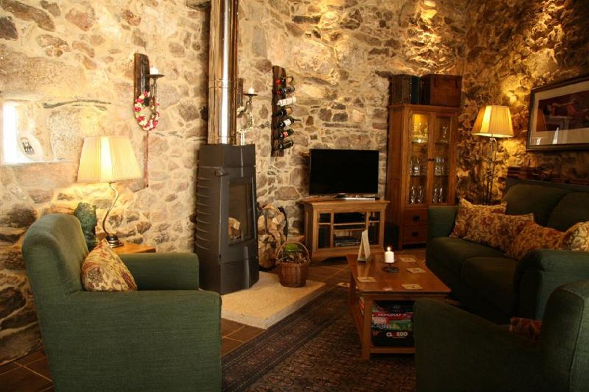 Lounge seats up to 9 persons with display cabinets and a corner log burning stove.