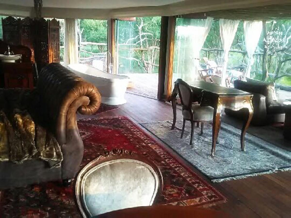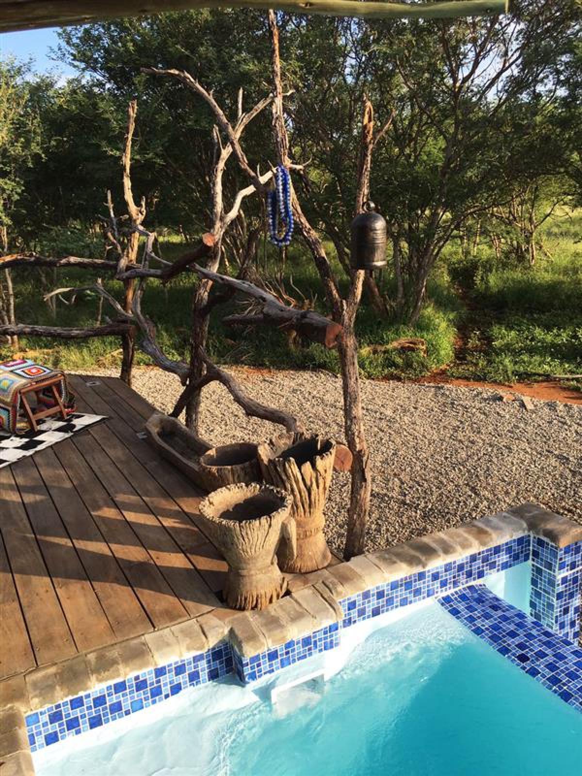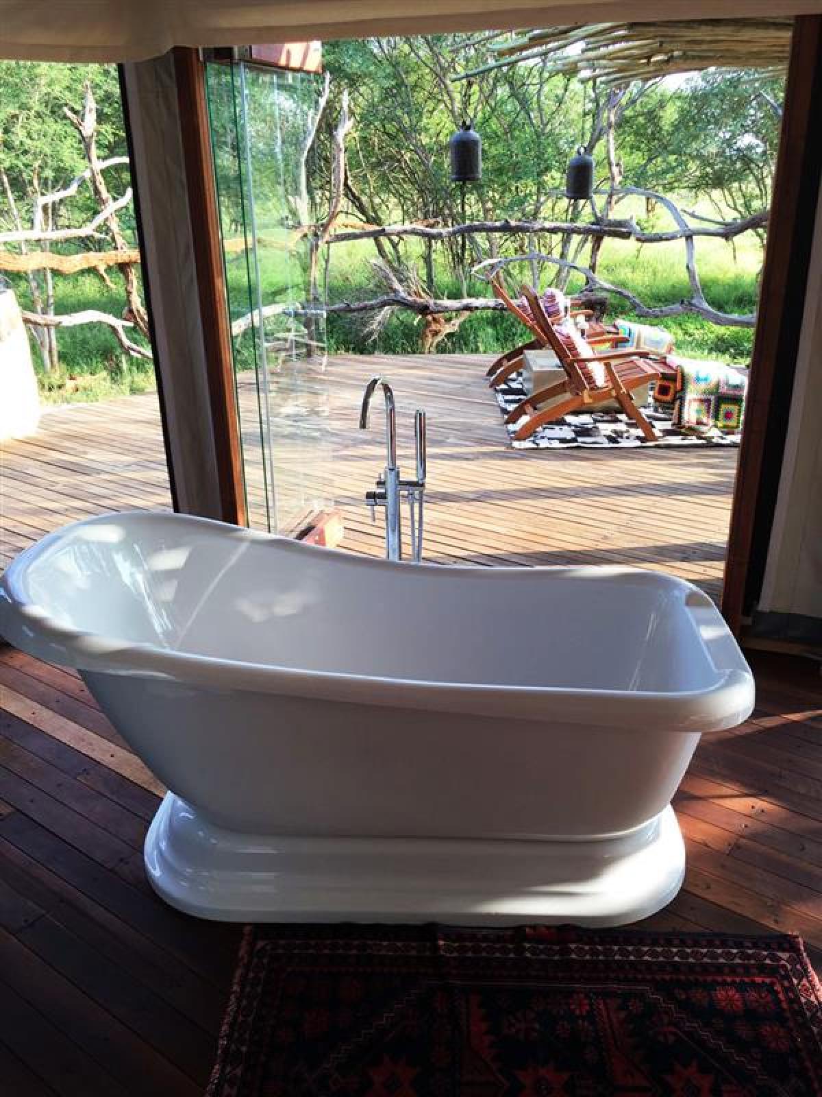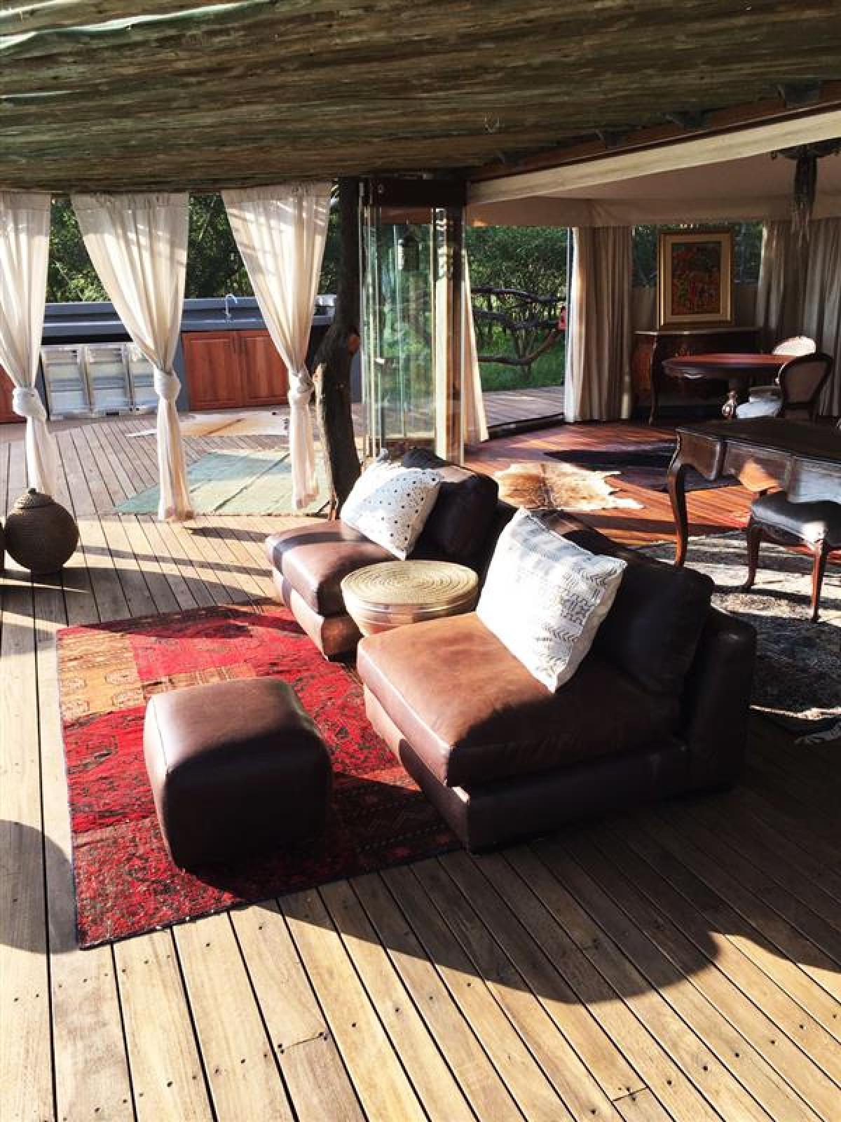 The camp has one premier tent with floor-to-ceiling glass sliding doors and two luxury, mobile, colonial style tents. The tent opens onto a relaxing deck ideal for enjoying a cigar and sipping a cognac while viewing the sunset. Additional amenities and features include a lap pool, air conditioning, an outdoor shower, a fire pit and an outdoor kitchen. The accommodation is wheelchair-friendly. A comfortable old farmhouse is also available for groups of up to 6 people.