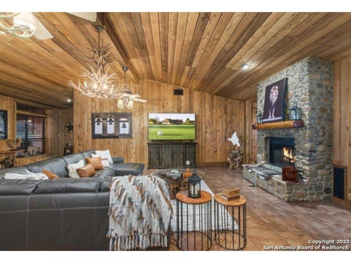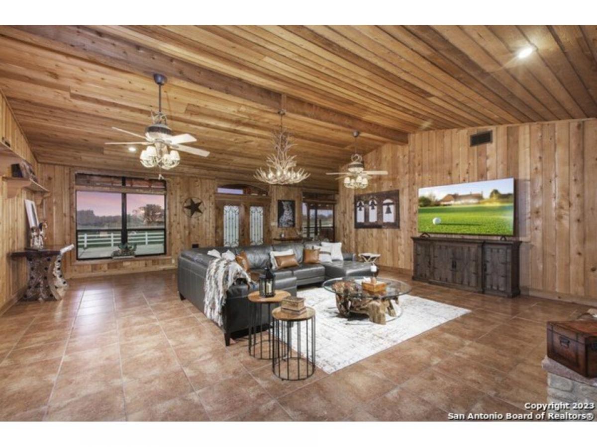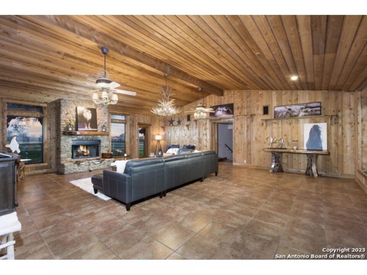 Seller Financing Available! Discover 26 acres of breathtaking open land adorned with vibrant bluebonnets, a tranquil pond, and majestic oak trees that create a serene and picturesque setting. This exceptional 3-bedroom, 4-bathroom home offers 3,952 sq. ft. of living space, complemented by an 800 sq. ft. man cave and a detached 12-car garage. The heart of the home-the classic country-style kitchen and family room-exudes rustic charm with exposed beams, custom cabinetry, cedar walls, tile floors, and a stunning stone hearth.