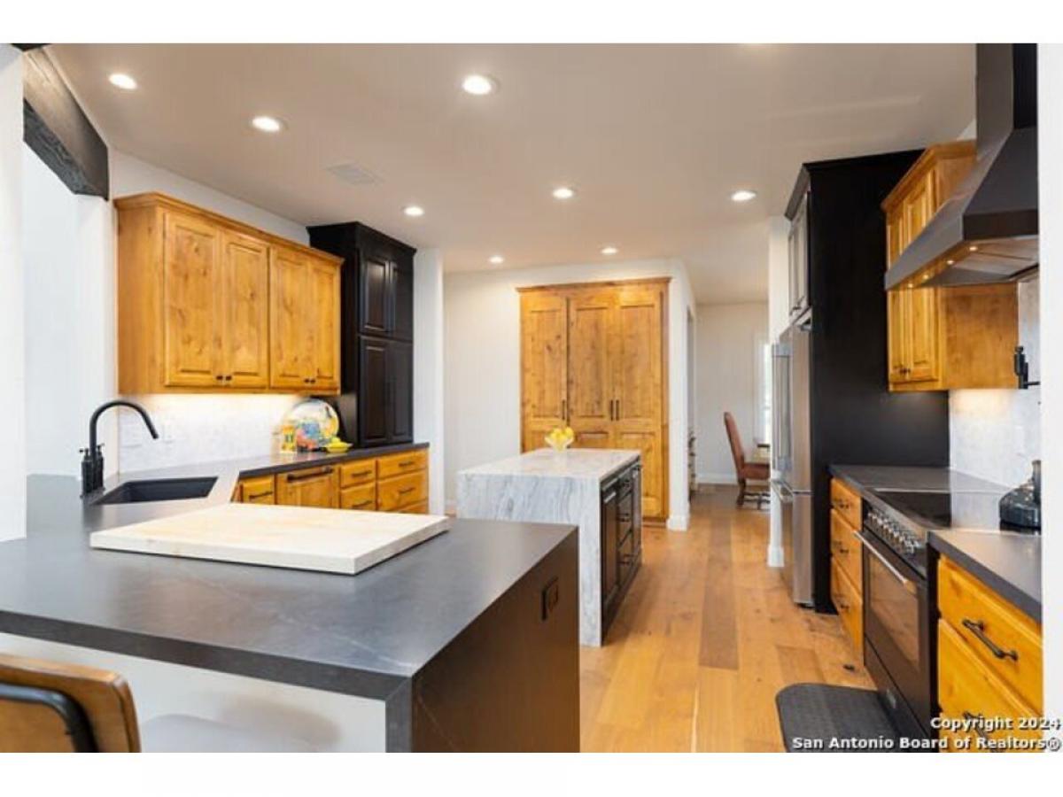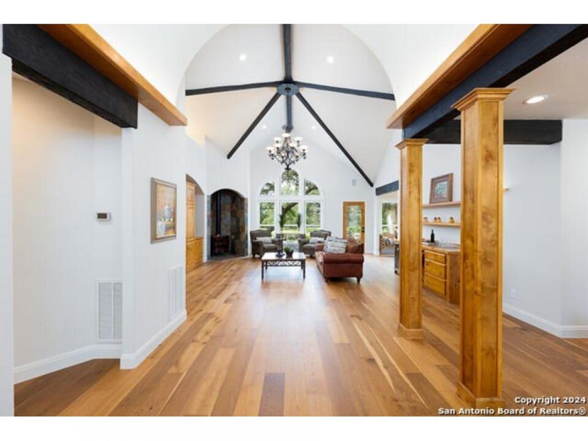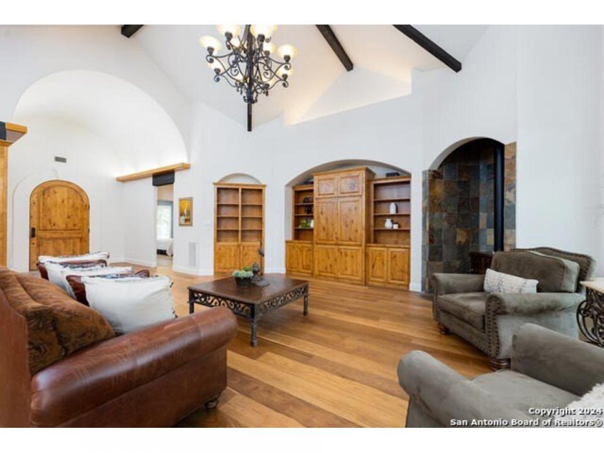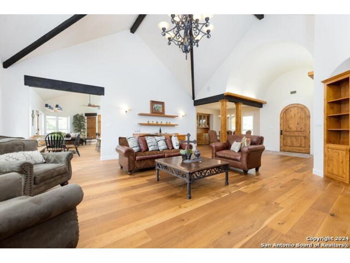 Main House 4017 SF; 4/3/1. Guest House 1703SF; 2/1 with sunroom. Barn 3280SF; workshop; equipment storage; equipped with electric and water; turnouts and access to fenced and cross fenced paddocks. Cabana with masonry fireplace, large granite countertop, and two mini fridges. 17.74 acres of private property with several majestic mature live oaks complementing wildlife exempted acreage. Intimate community with limited ownership makes for great privacy and convenience. The Historic Steel Ranch has the original Homestead and barn located nearby. Meticulously kept, conveniently located just minutes from downtown Boerne. As you enter the 4ft arched alder front door, you are greeted by a beautiful barrel vault foyer, open to a vaulted living room as well as lovely dining room and beautiful kitchen. Every surface in the home has been updated with built-in storage, pristine finishes and elaborate touches including all light fixtures throughout the entire home being adapted to LED. Tons of natural light complements this beautiful home, including wonderful skylights with tons of light flooding through these special spaces. Special game room with unique axis hide print carpeting and extra family living space right off the kitchen. Wide open floor plan with recently installed wide plank hickory flooring throughout as well as great dark beams complementing the ceilings. The wonderful potbelly wood-burning stove in the main living space is a warm touch in this open floor plan. Wine refrigerator and custom cabinetry built in. The oversize kitchen would be enjoyed by any culinary artist. A large island makes for a great workspace. The island quartzite countertop waterfalling on both ends is stunning. Recently updated stainless steel appliances, offering all electric and induction stoves, pot filler for convenient cooking. Stainless steel refrigerator will remain. Separate office space complete with tons of built-in custom cabinetry. Primary suite on the main floor with excessive space for sitting area, opens out onto a private deck with scenic views of wildlife. Recently updated, beautiful primary suite bathroom includes elaborate shower with double heads and standalone tub includes exquisite fixtures, double vanities with waterfall edge counters, coffee bar, and custom Zellige tile. New oversize closet with pull down third row rods, custom finishes, built-in jewelry cabinet. All guest bedrooms have beautiful walk-in closets and updated bathrooms. Upstairs, you are greeted by a grand bonus area that will serve wonderfully for entertainment, work out room or secondary family room or media. Two bedrooms with fabulous views off this space have wood floors, walk-in closets, and tons of storage. Outstanding outdoor living spaces, including Cabana with Masonry fireplace, large Granite countertop, includes two mini fridges that will remain. The perfectly private acreage includes a wonderful Koi Pond and wildlife exemption. Guesthouse with 2 bedrooms, features an open floor plan with hickory custom cabinets in the kitchen as well as flanking the living room fireplace. The sunroom off the living room and kitchen brings the outdoors in. Main House Special Features include: Equipped with Sono#039;s sound system; Central vac system; Separate septic systems for main and guest house; Recently updated all metal roofing on all the buildings including the barn; Three new HVAC units in the main home; Blinds and covering throughout home with beautiful custom cased windows; Well, has 2000-gallon water storage; Recently replaced submersible and booster pumps; Oversized two car garage, painted floor, built-in cabinetry; Three-car carport; Guesthouse Special Features include: Laundry room off the closet; Central vac; Granite countertops; Vaulted tongue and groove ceiling in living room; Porcelain tile flooring; Carport, providing covered parking for your guests. Do not miss the amazing listing video located in the Virtual Tour section.