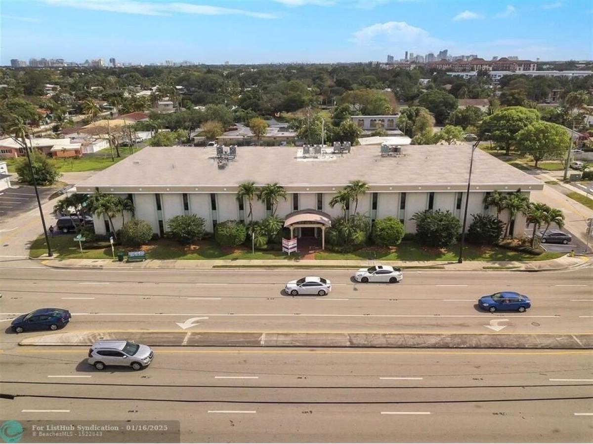Two-story building located in the vibrant community of Oakland Park, Florida. This traditional office building features a Mid-Century Modern design with prominent vertical windows that provide natural light, creating an inviting atmosphere for clients and employees. The recently updated ground-floor unit, situated at the NE corner of the building, includes 7 private offices, a conference room, a restroom, and a kitchen area. The building offers common area restrooms and ample parking, including 2 assigned spaces and plenty of free parking. move-in ready, following amenities included in the common area maintenance (CAM): fire alarm, elevator access, building insurance, maintenance and repairs, water and electric service, landscaping, pest control, and upkeep of common hallways and restrooms