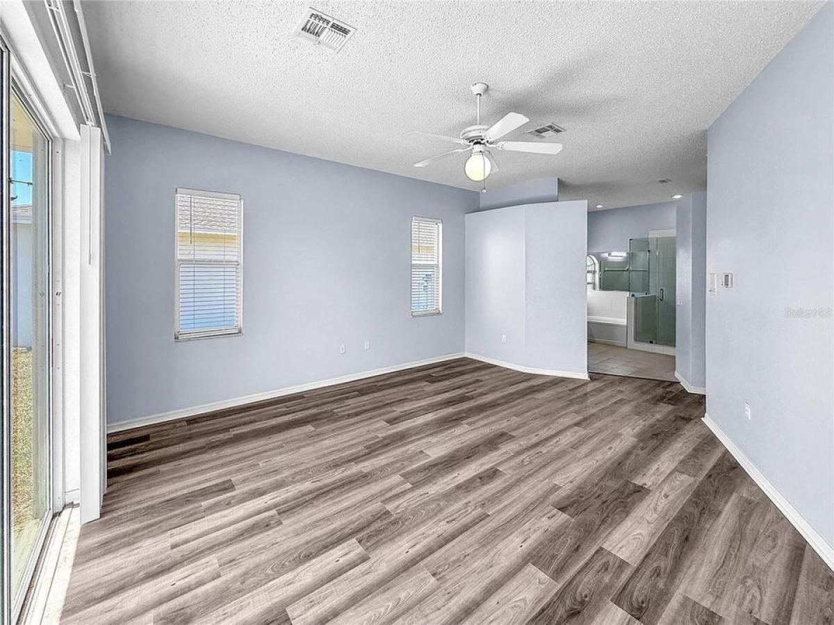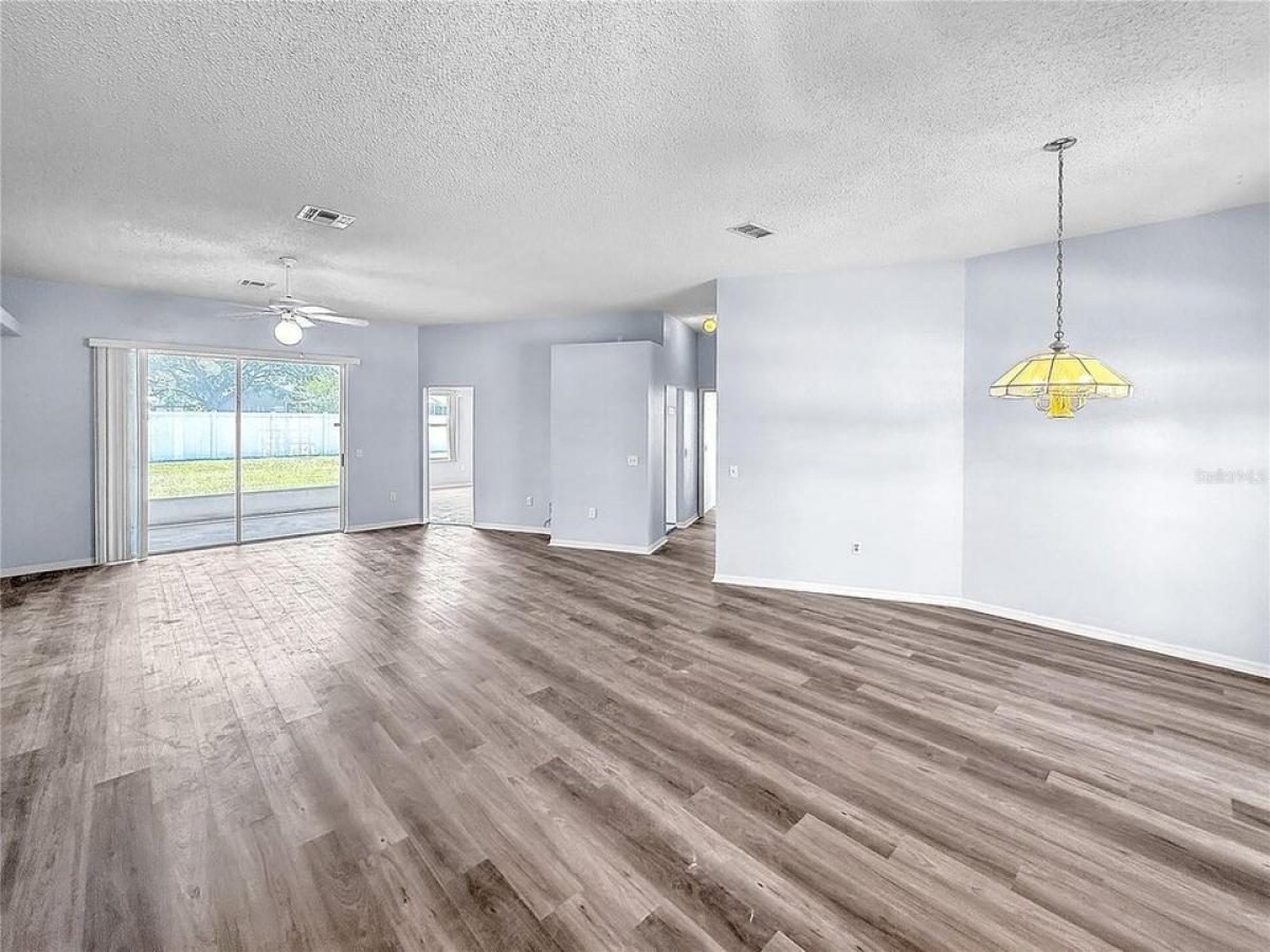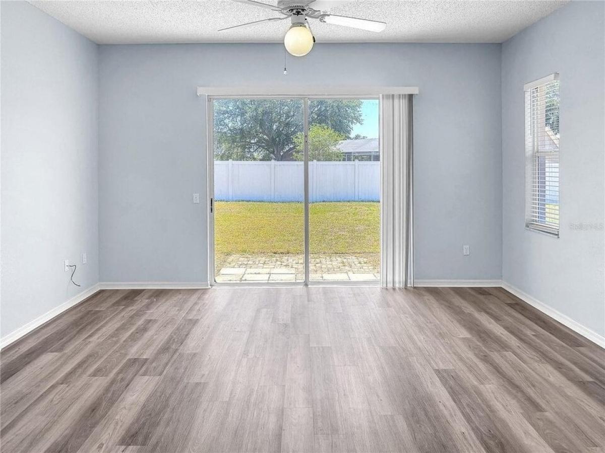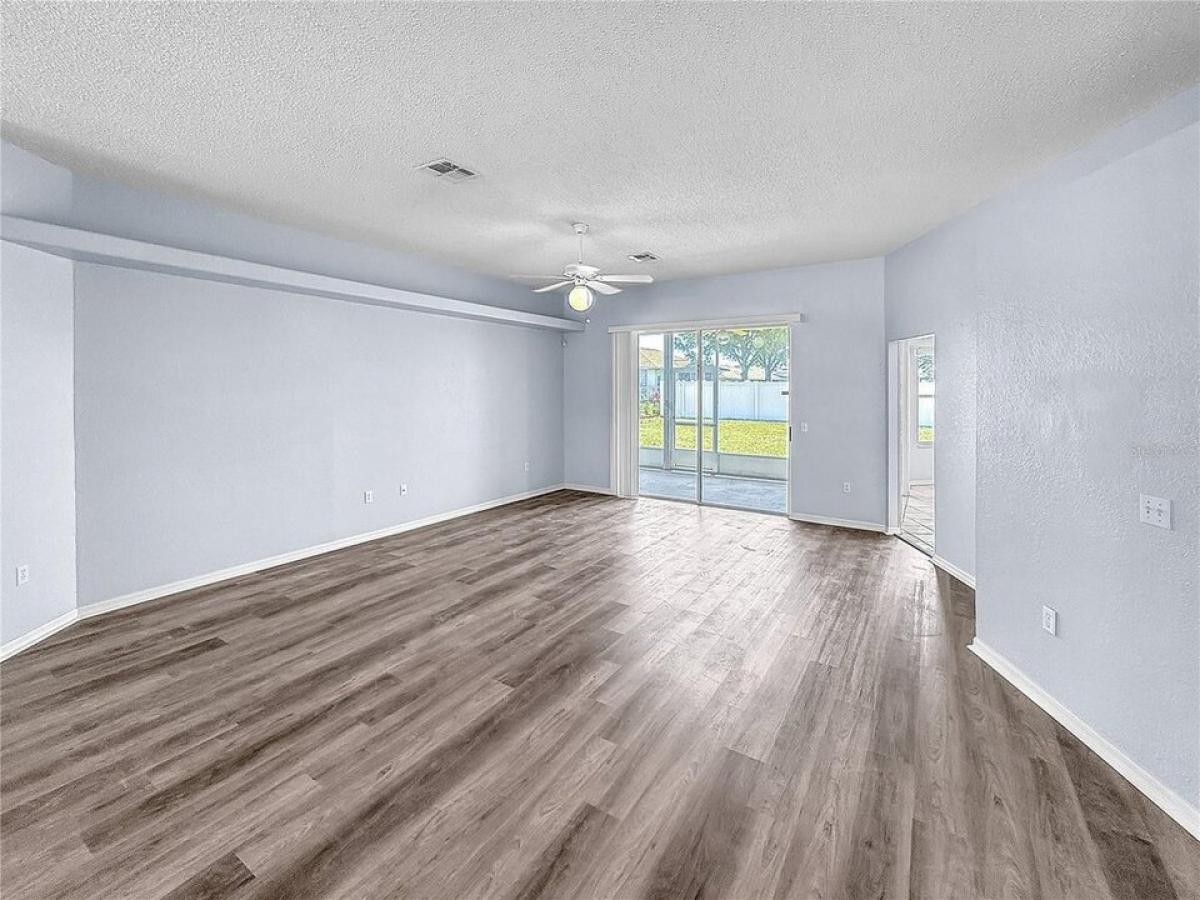 Welcome Home! This 3-bedroom, 2-bathroom home features a spacious open floor plan with high ceilings and wood-look flooring in the living and dining areas. Large sliding glass doors provide ample natural light and lead to a screened-in lanai, perfect for enjoying Floridarsquo;s outdoor living. The kitchen includes white cabinetry, black countertops, a breakfast bar, and a cozy nook with large windows overlooking the backyard. The primary suite offers backyard views, a built-in closet, and an en-suite bathroom with a soaking tub, separate shower, and dual sinks. The additional bedrooms are well-sized with ceiling fans and ample closet space. The second full bathroom includes a tub/shower combo. A separate laundry room with a washer and dryer provides added convenience, and the two-car garage offers plenty of parking and storage. The spacious backyard is ideal for outdoor activities. Pets are allowed. Located in a quiet neighborhood, this home is minutes from shopping, dining, parks, and schools. Schedule your showing today!