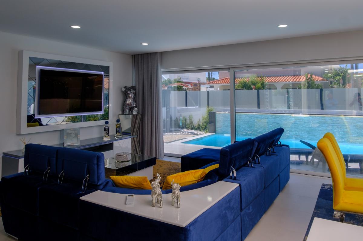Luxury 4 bedroom villa for sale in Aroeira, isolated, with contemporary architecture composed of generous and excellent areas, with light and privacy, as well as luxury and modern finishes, spread over two floors.The ground floor has a comfortable social area comprising living room and kitchen in open space, overlooking the pool, a bedroom and a bathroom with window and natural light.The upper floor consists of 2 bedrooms and a master suite, all served by a balcony and three bathrooms with window and natural light.Surrounded by well-kept terraces, of which the old Portuguese sidewalk stands out, this luxury villa has a pleasant swimming pool with waterfall and LED lights, which focuses all the attention from the outside.In addition to a barbecue area and an outdoor shower, this house also has a storage room and two parking spaces, one outside and one inside.Located in Aroeira, in a quiet area, 1 km from the beach and 650 meters from the Golf Club, the villa has various equipment, such as swing frame with thermal and acoustic cut in all rooms and bathrooms, electric shutters, vacuum central, solar panels, fully equipped island kitchen and Mitsubishi air conditioning. It also has video surveillance / doorman on both floors and two independent alarms, one in the house and the other in the garage, six video surveillance cameras distributed around the house, connected directly to the mobile phone.Possibility of selling with the current decoration.