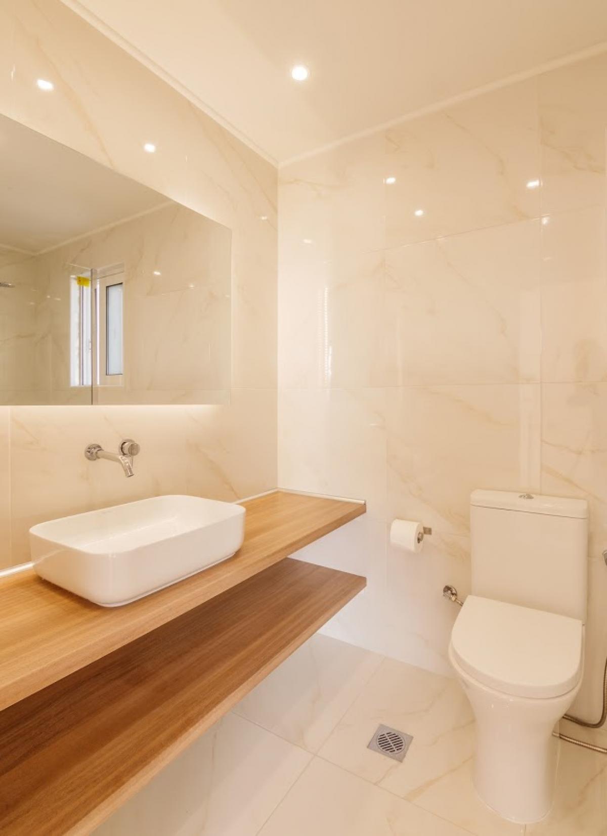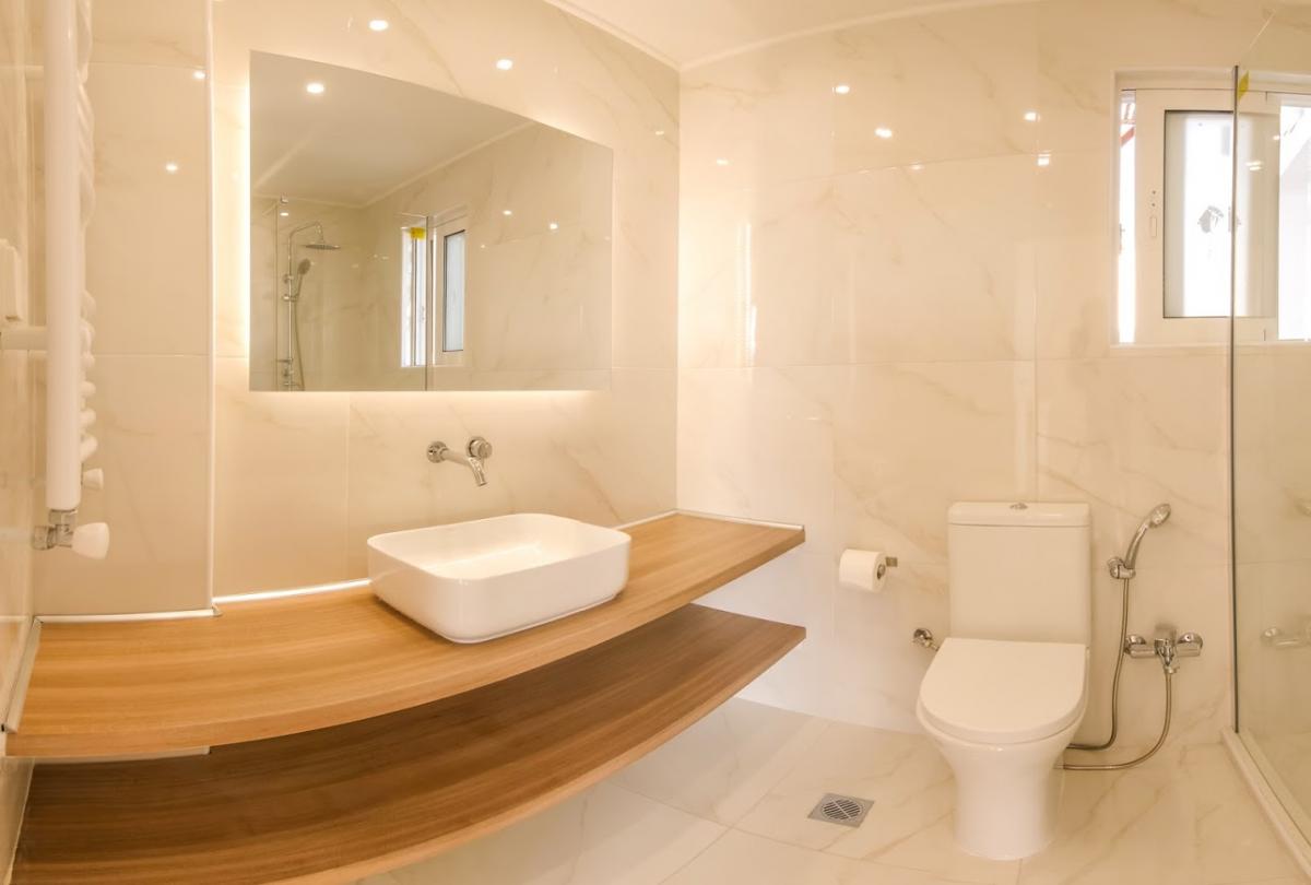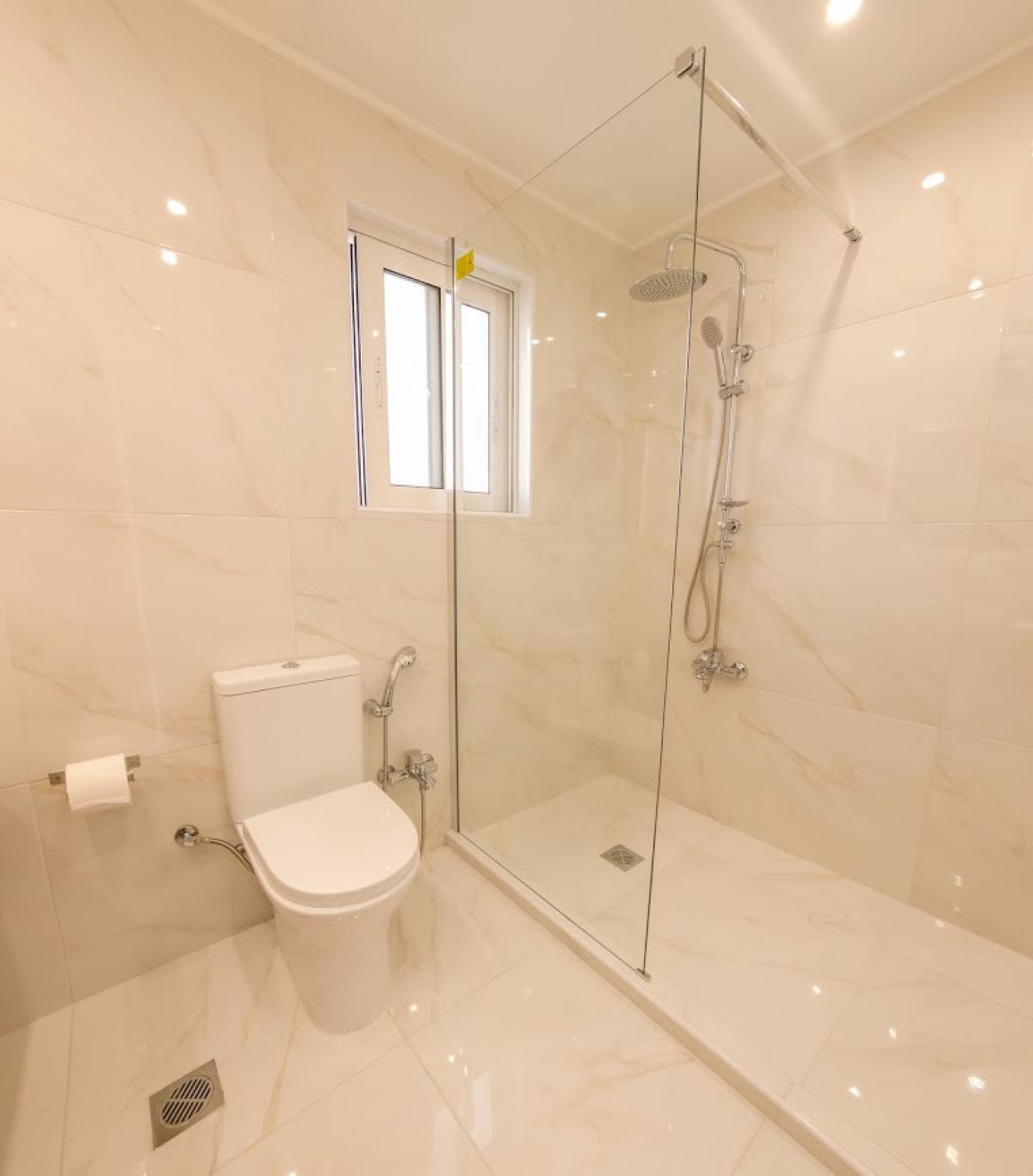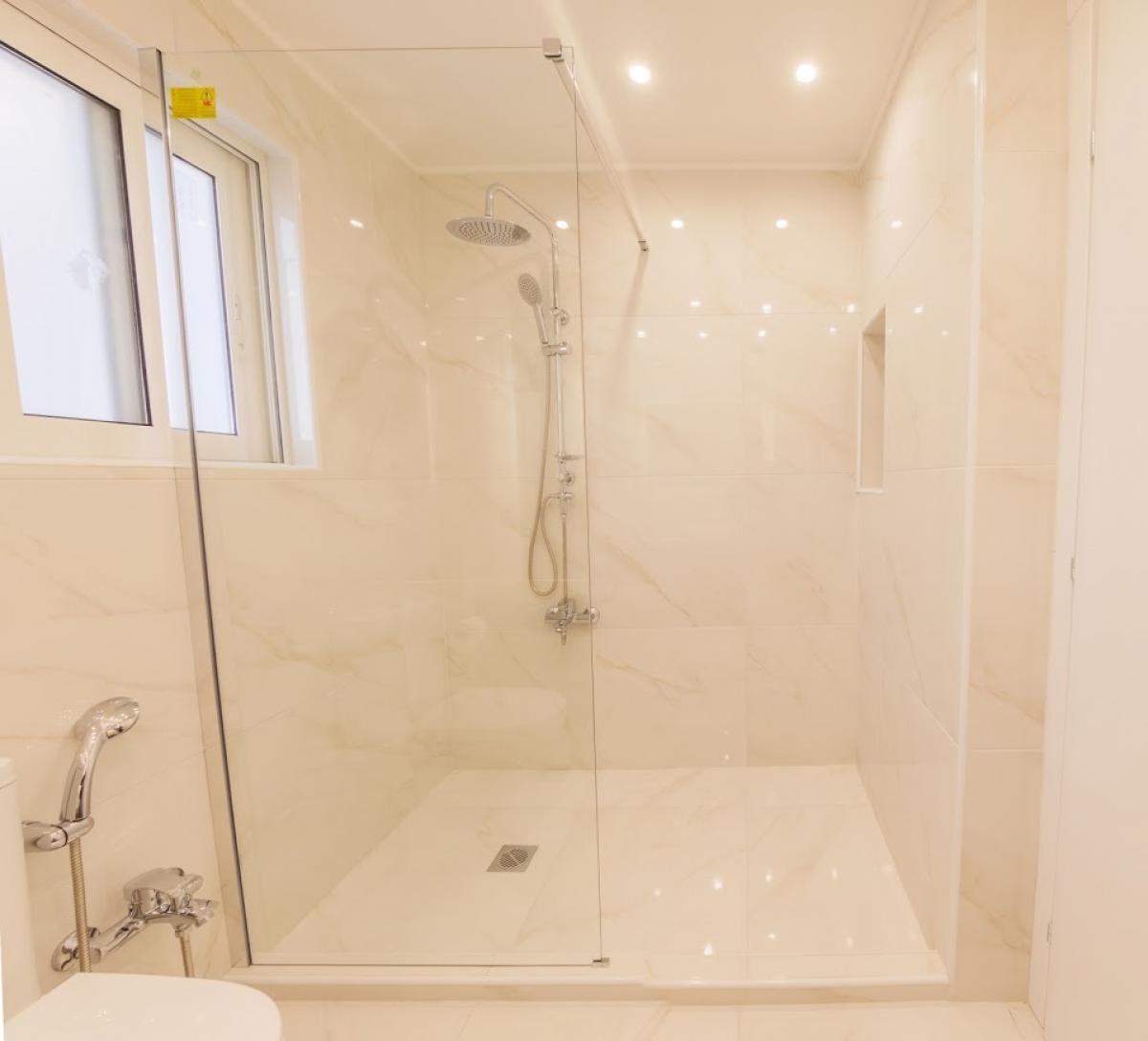 Modern bathroom with walk-in shower and an extra utility balcony at the back