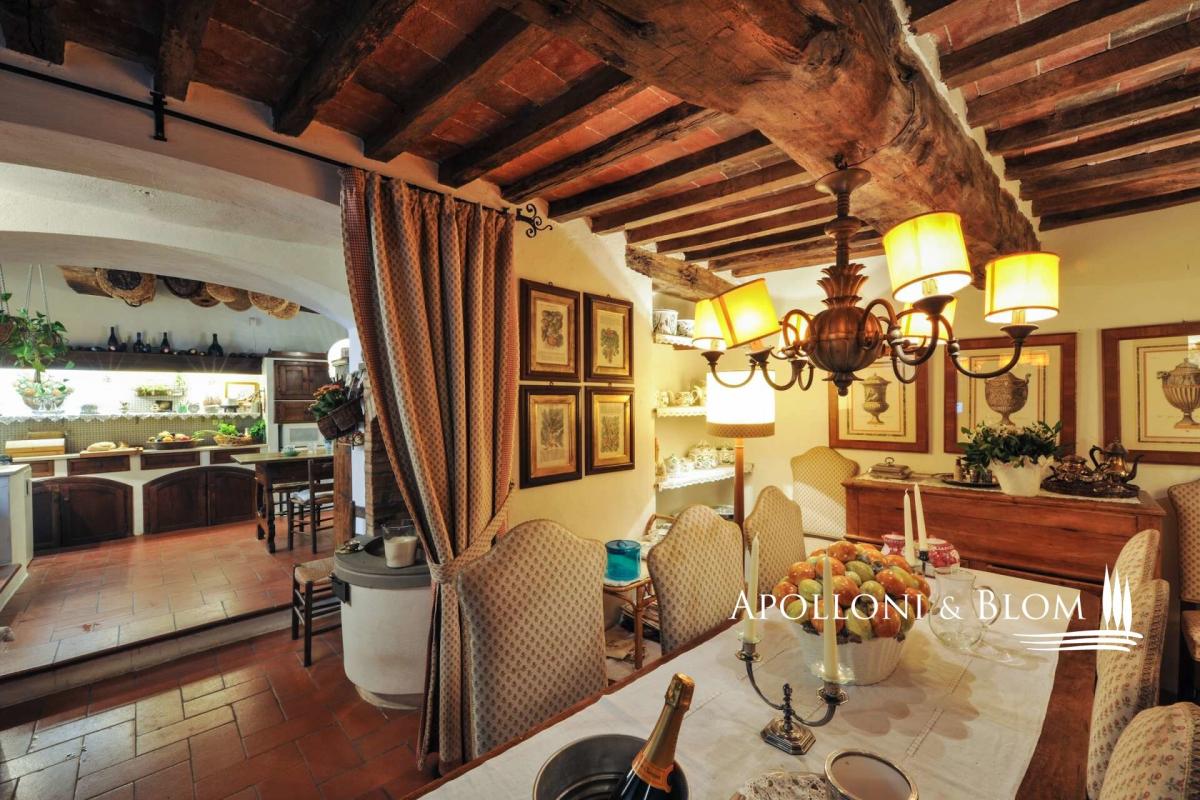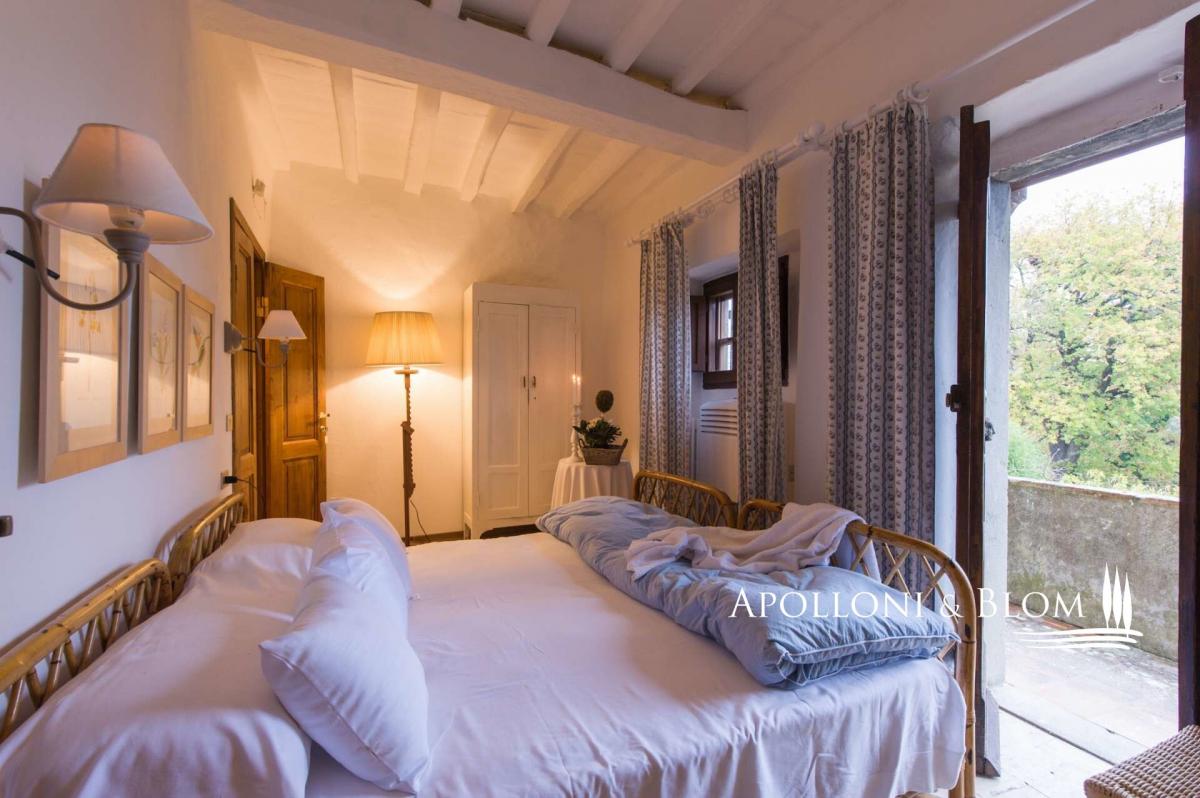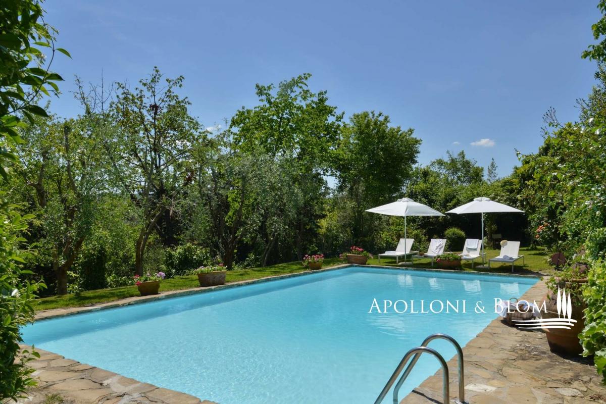 A quintessential centuries old farmhouse with private pool, tennis court, guest cottage, vineyard and olive grove for sale near Castellina in Chianti. Set in the heart of Chianti Classico within a wine estate, encompassed by warming natural scenery, the villa boasts vineyard views, on the border between Siena and Florence. The luxuriously planted gardens that wrap around the property feature an array of Mediterranean flowering shrubs, oak trees, private vineyards and centuries-old olive groves. Climbers and creepers scale the exterior walls of the stone farmhouse, allowing the property to blend into the surrounding landscape. The house spans 865 sq m (9310 sq ft) over three floors and offers an entrance hall leading to a spacious breakfast room and into a country style kitchen whose terracotta floors, beamed ceiling and copper cookware capture the essence of rural Tuscany style, along with access to an outdoor terrace for al fresco dining. To the other side of the entrance hall is a large dining room that seats 14. The first floor is home to three spacious living rooms adorned with a fine collection of antiques, bookcases stuffed with an enviable collection of books, comfy sofas and grand fireplaces. The fully air-conditioned sleeping quarters are located on the first and second floor. All five bedrooms, aside from the master bedroom, are double-twins, and all but two benefit the privacy of modern, en-suite bathrooms. An abundance of drowsy terraces for lounging and dining; manicured lawns with hidden paths;a tennis court and a dreamy pool area bathed in sunligh equipped with a pool house complete the outdoors together with a two-story cottage, the guardian’s home or for guests use. Perched at the end of a private driveway, this elegant country villa ensures maximum privacy and peacefulness on a secluded hilltop. Just 400 metres from the property lies a medieval village with one of the best restaurants in the area. Property Ref: CNT3459 Located: Castellina in Chianti, Province: Siena, Region: Tuscany Type: 865 sq m/9310 sq ft three-story country villa featuring a tennis court, swimming pool with pool house, guest cottage, deposit with garage, olive grove and small vineyard Land: 1.6 ha /3.95 acres including 0,98 ha/2.42 acres of olive groves, 0.4 ha/1 acres of vineyard producing Chianti DOCG and Rosso IGT wines, courtyards 2360 sq m/0.58 acres Annexes: 110 sq m two-story cottage with a first-floor apartment; 106 sq m warehouse used as a garage; a 32 sq m/344 sq ft pool house Swimming pool: 7x15m./23x49ft with paved sundeck and pool house Telephone network: available Internet/Wi-Fi: present Heating: LPG Water: municipal water supply Electricity: active Air conditioning Burglar Alarm Distance to services: 7 km/4 miles Distance to main airports: Florence 52 km/32 miles, Pisa 96 km/60 miles Gravel road: 600 m/1969 ft Layout Main Villa: Ground Floor: living room, dining, kitchen, 3 closets, 1 bathroom, laundry, technical rooms First Floor: 3 living rooms with fireplaces, 2 bedrooms with en suite bathrooms, study Second Floor: 4 bedrooms, 3 bathrooms- garden