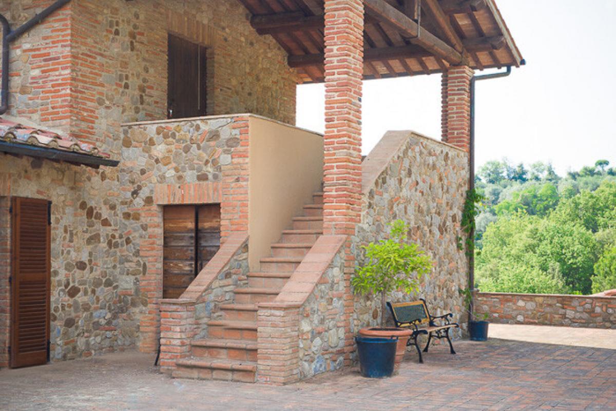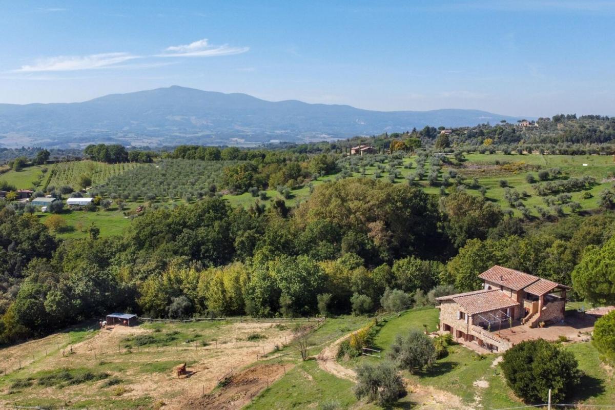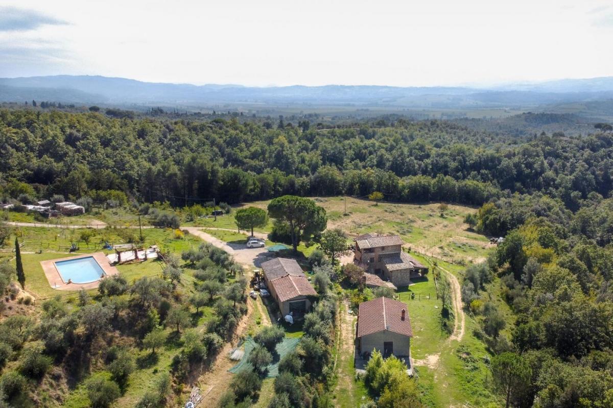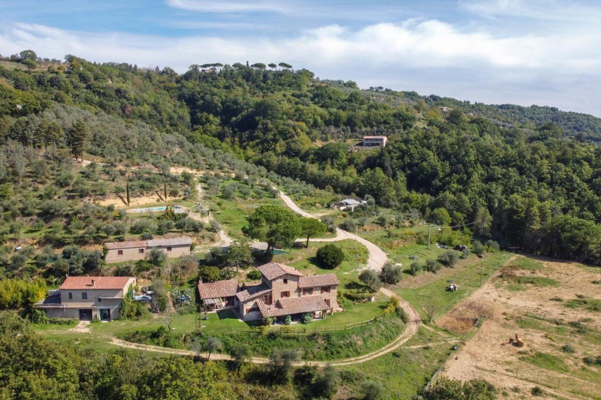 Panoramic, recently renovated stone farmhouse with 6 apartments and pool, annexes and land for sale in Città della Pieve, Perugia. On a hill with an open view of the valley in front of Città della Pieve and Mount Cetona, a quiet and reserved setting with a short country road to access it. Surrounded by olive groves the The Divine Painter Country House welcomes with its traditional umbrian style with natural stone facades, porticoes and terracotta floors, on several levels and refurbished into 6 apartments, all different in type and original features, with 1 or 2 bedrooms, living room with fireplace and kitchen, new bathrooms with bath or shower, some with porch or roof terrace. The garden is landscaped with lawns and Mediterranean scrub and houses a swimming pool with Roman-style staircase, as well as two outbuildings partly restored, to be used for hospitality. The farmland includes arable land, olive groves, a small vineyard and forest. A retreat in the Umbrian countryside, close to Tuscany and Lake Trasimeno, ideal as a private residence to live with family and friends or host travelers for their vacation. PROPERTY Ref: CDP1600 Location: Città della Pieve, Province: Perugia, Region: Umbria Type: 6 hectares/14.8 acres typical Umbrian farmstead featuring a 500 sq m/531 sq ft two-story former country house fully renovated into 6 apartments, garden with swimming pool, annexes and land with olive grove and small vineyard Annexes: two-story 293 sq m/3153 sq ft building on two levels with terrace, office, 1 bathroom, warehouse, storage, archive, cellar with a cave, and a second annex of 118 sq m/1270 sq ft for warehouse use. Both annexes are partly restored and can be converted into residential units Year of construction: 1800 Year of restoration: 2015 Conditions: excellent Land/Garden: 6 hectares/14.8 acres including 2.7ha/6.6 acres of olive grove, 1.9ha/4.6 acres of arable land, 0.55ha/1.3 acres of vineyard, 1.7ha/4.2 acres of woods Terrace/Balcony: porch and roof terrace Swimming pool: panoramic, 14x6m with Roman-style steps and terracotta tiling Gravel road: 650 mt Utilities: Fixed telephone network: available Internet: available Heating: LPG Water: well + mains city supply Electricity: available Distance from services: 2,5km Distance from main airports: Perugia 55 km, Florence 150km, Rome 180km Layout: Ground Floor: Apartment 1: living room with kitchen, 2 bedrooms, 1 bathroom, storage room Apartment 2: living room with kitchen, 1 bedroom, 1 bathroom, storage room Apartment 3: living room with kitchen, 1 bedroom, 1 bathroom Apartment 4: living room with kitchen, 1 bedrooms, 1 bathroom Apartment 5: living room with kitchen, bathroom; second floor with porch, second floor staircase 1 bedroom and a roof terrace First Floor: Apartment 6: studio apartment with bathroom and loggia, to be finished- terrace
