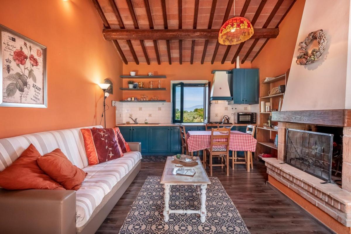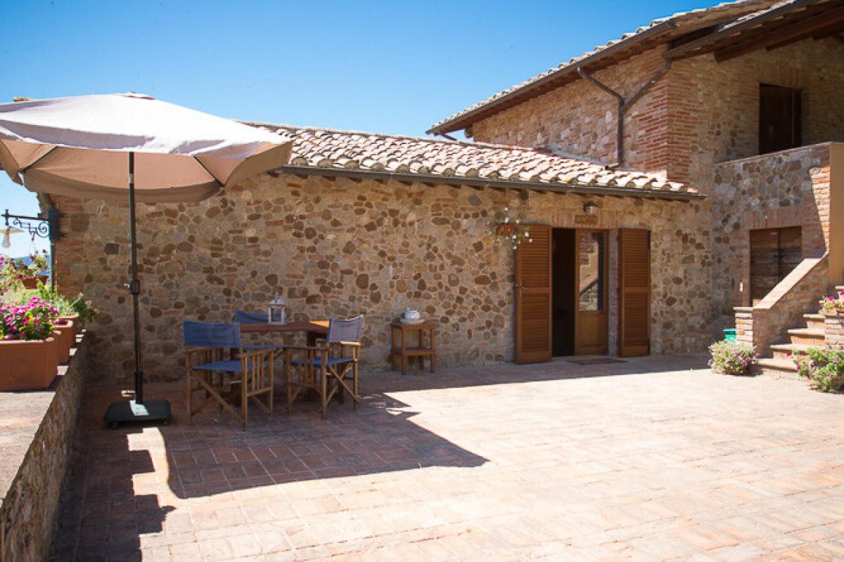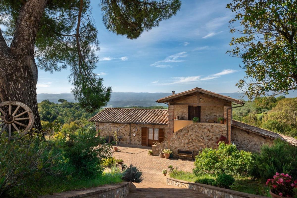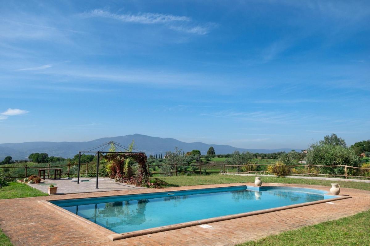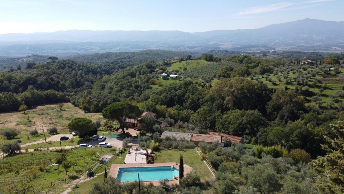 Panoramic, recently renovated stone farmhouse with 6 apartments and pool, annexes and land for sale in Città della Pieve, Perugia. On a hill with an open view of the valley in front of Città della Pieve and Mount Cetona, a quiet and reserved setting with a short country road to access it. Surrounded by olive groves the The Divine Painter Country House welcomes with its traditional umbrian style with natural stone facades, porticoes and terracotta floors, on several levels and refurbished into 6 apartments, all different in type and original features, with 1 or 2 bedrooms, living room with fireplace and kitchen, new bathrooms with bath or shower, some with porch or roof terrace. The garden is landscaped with lawns and Mediterranean scrub and houses a swimming pool with Roman-style staircase, as well as two outbuildings partly restored, to be used for hospitality. The farmland includes arable land, olive groves, a small vineyard and forest. A retreat in the Umbrian countryside, close to Tuscany and Lake Trasimeno, ideal as a private residence to live with family and friends or host travelers for their vacation. PROPERTY Ref: CDP1600 Location: Città della Pieve, Province: Perugia, Region: Umbria Type: 6 hectares/14.8 acres typical Umbrian farmstead featuring a 500 sq m/531 sq ft two-story former country house fully renovated into 6 apartments, garden with swimming pool, annexes and land with olive grove and small vineyard Annexes: two-story 293 sq m/3153 sq ft building on two levels with terrace, office, 1 bathroom, warehouse, storage, archive, cellar with a cave, and a second annex of 118 sq m/1270 sq ft for warehouse use. Both annexes are partly restored and can be converted into residential units Year of construction: 1800 Year of restoration: 2015 Conditions: excellent Land/Garden: 6 hectares/14.8 acres including 2.7ha/6.6 acres of olive grove, 1.9ha/4.6 acres of arable land, 0.55ha/1.3 acres of vineyard, 1.7ha/4.2 acres of woods Terrace/Balcony: porch and roof terrace Swimming pool: panoramic, 14x6m with Roman-style steps and terracotta tiling Gravel road: 650 mt Utilities: Fixed telephone network: available Internet: available Heating: LPG Water: well + mains city supply Electricity: available Distance from services: 2,5km Distance from main airports: Perugia 55 km, Florence 150km, Rome 180km Layout: Ground Floor: Apartment 1: living room with kitchen, 2 bedrooms, 1 bathroom, storage room Apartment 2: living room with kitchen, 1 bedroom, 1 bathroom, storage room Apartment 3: living room with kitchen, 1 bedroom, 1 bathroom Apartment 4: living room with kitchen, 1 bedrooms, 1 bathroom Apartment 5: living room with kitchen, bathroom; second floor with porch, second floor staircase 1 bedroom and a roof terrace First Floor: Apartment 6: studio apartment with bathroom and loggia, to be finished- terrace