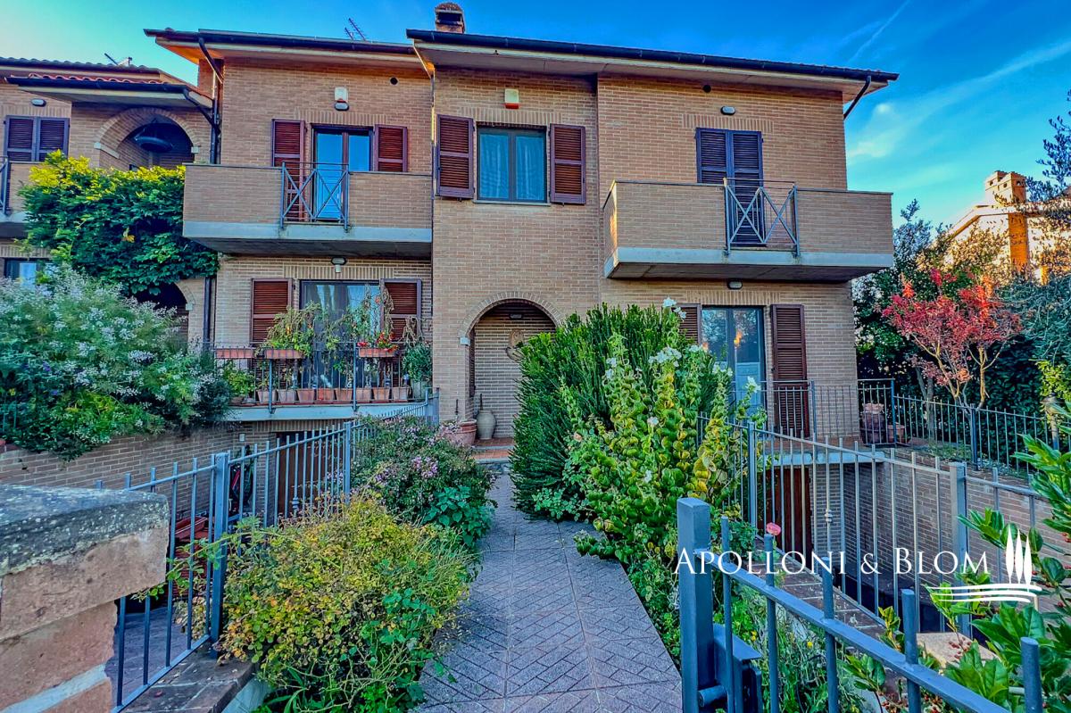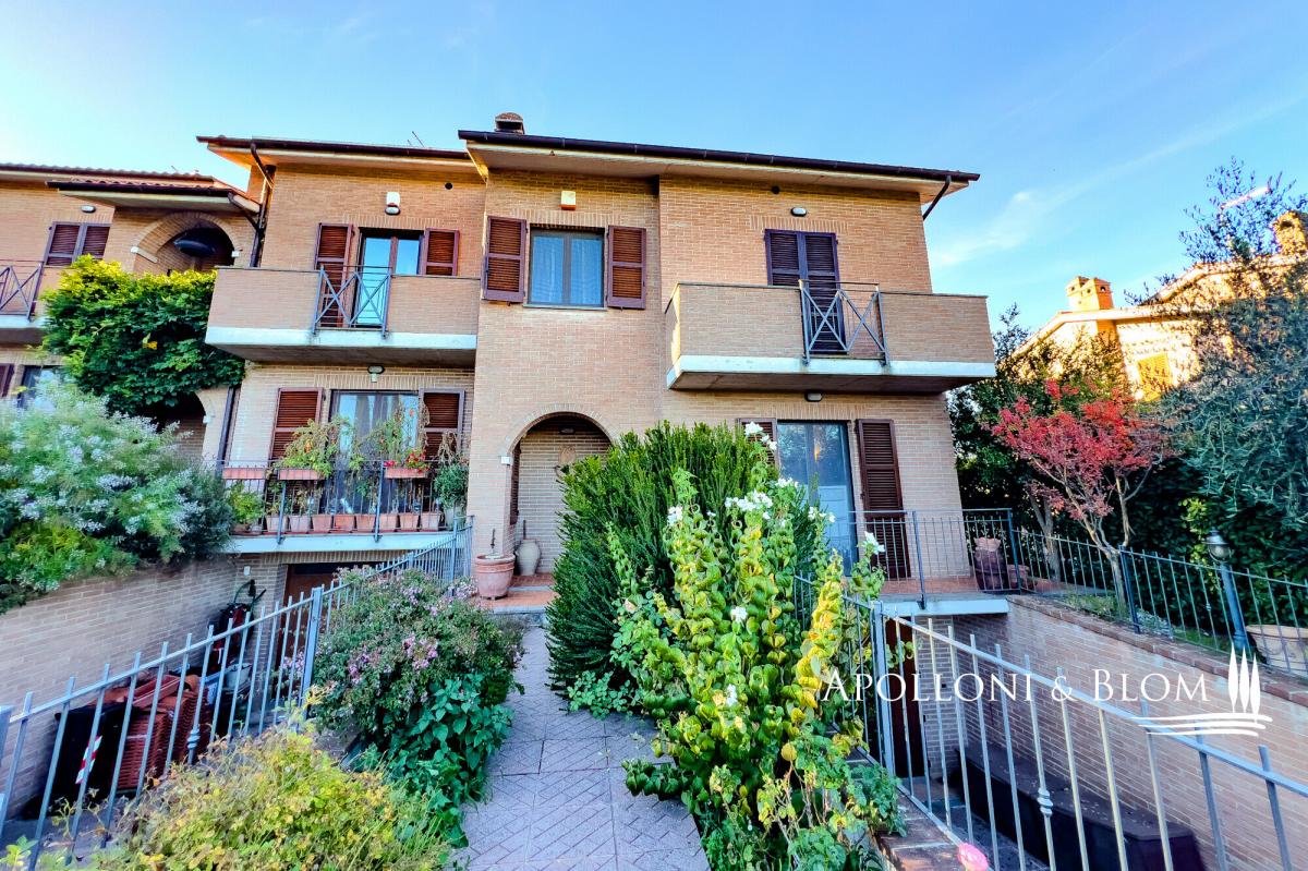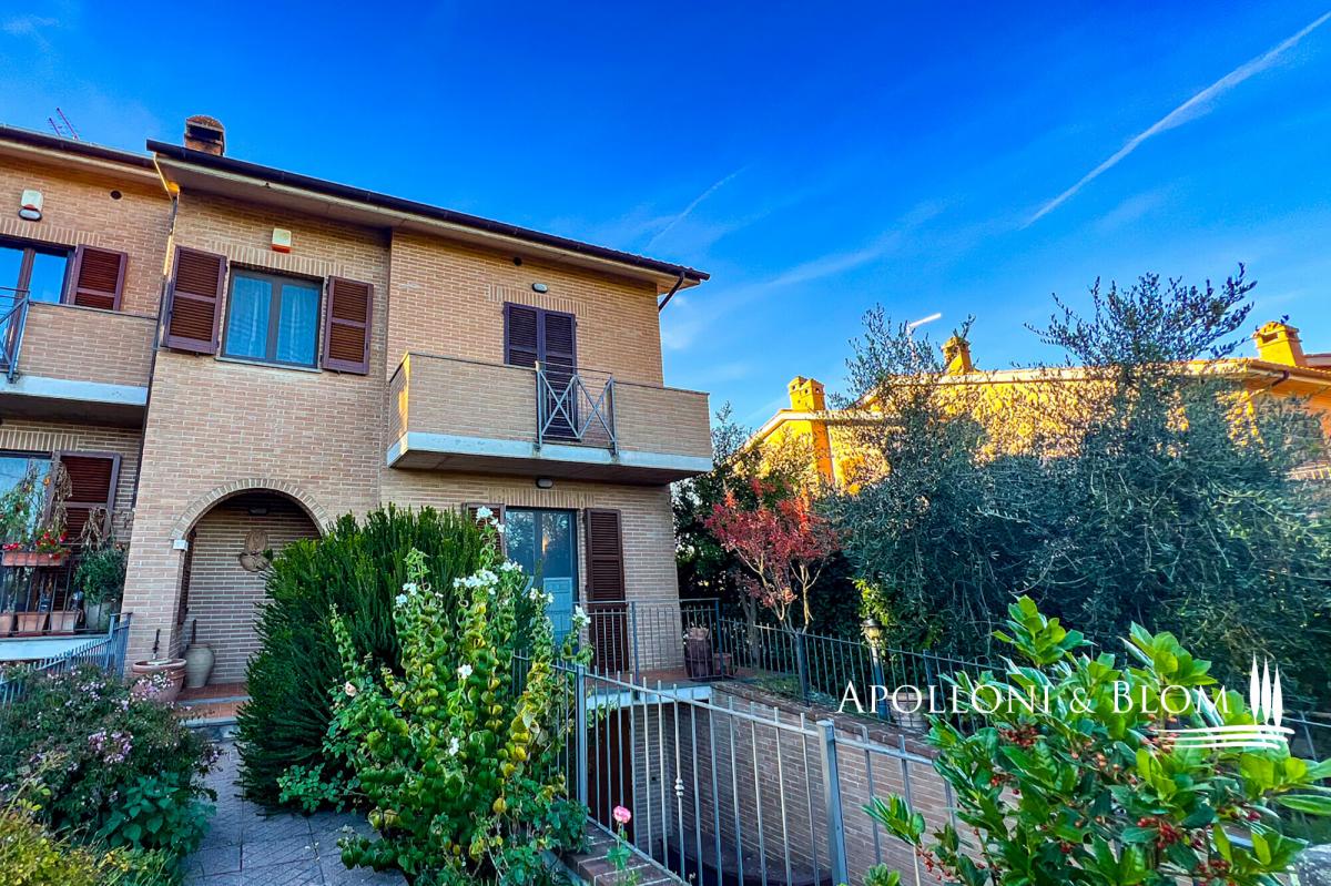 In a quiet residential area, three-story terraced house for sale with stunning views of Città della Pieve, garden, and garage. With an enchanting view over the terracotta rooftops and slender bell towers of Città della Pieve, this corner position terraced house lies in a quiet, green residential quarter, just a short stroll from the historic town centre and all essential amenities. Here, the serene rhythm of Umbrian hill life blends seamlessly with the convenience of town living, offering countryside tranquillity within easy reach of charming cafés, artisan boutiques, and local restaurants. Constructed in 2005 and maintained in immaculate condition, the house unfolds across three levels, offering approximately 203 square metres (2,185 sq ft) of well-proportioned interior space. Each floor has been thoughtfully designed to balance elegance and comfort, with abundant natural light and an understated contemporary aesthetic that honours the local architectural vernacular. At ground level, a welcoming portico leads into a spacious open-plan living area, where large windows and doors invite light in and offer seamless access to a portico overlooking the garden. The living space flows naturally into a well-appointed kitchen, while a guest bathroom completes this floor. On the first floor a main bedroom with en-suite and a panoramic terrace, two additional bedrooms, one with private terrace, and a second bathroom. The lower ground floor has been finished to the same high standards as the main living areas. It offers a characterful taverna with traditional wood-burning fireplace, two additional storage rooms, a bathroom with integrated laundry area, and an internal entrance to the 32-square-metre garage, ensuring both practicality and privacy. Outside, the private garden extends over two sides of the house, offering ample space for quiet enjoyment or entertaining, all framed by open views across the rooftops and skyline of Città della Pieve. This is a turn-key residence ideal as a permanent family home, a refined holiday retreat, or a base from which to explore the cultural and culinary richness of Umbria and nearby Tuscany. PROPERTY Ref: CDP3372 Location: Città della Pieve, Province: Perugia, Region: Umbria Type: 203 sq m/2185 sq ft three-story terraced house with portico, garage and garden Year of construction: 2005 Conditions: excellent Garden: 190 sq m/2045 sq ft fully fenced Parking: 32 sq m/344 sq ft basement garage Utilities: Fixed telephone network: available Internet: available Heating: methane + fireplace Water: mains city supply Electricity: available Water waste: mains city connection Distance from services: 900 mt Distance from main airports: Perugia 50 km, Rome 180 km, Florence 150 km Gravel road: 300 meters Layout: Ground Floor: entrance to the porch at the front, open-plan living room with open kitchen, 1 bathroom First Floor: 1 double bedroom with terrace and en-suite bathroom, 2 bedrooms, one with terrace, 1 bathroom Basement: double internal and external access, 2 storage rooms, a tavern with fireplace, 1 bathroom with laundry room, garage- garden