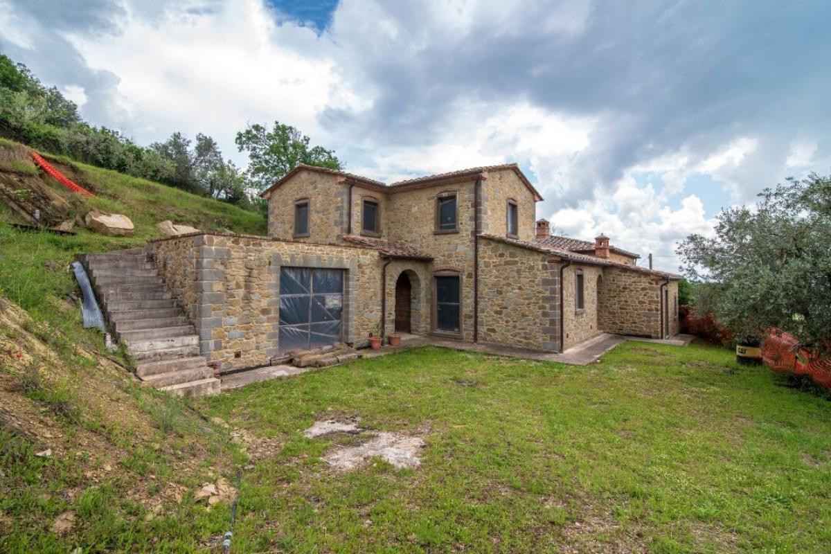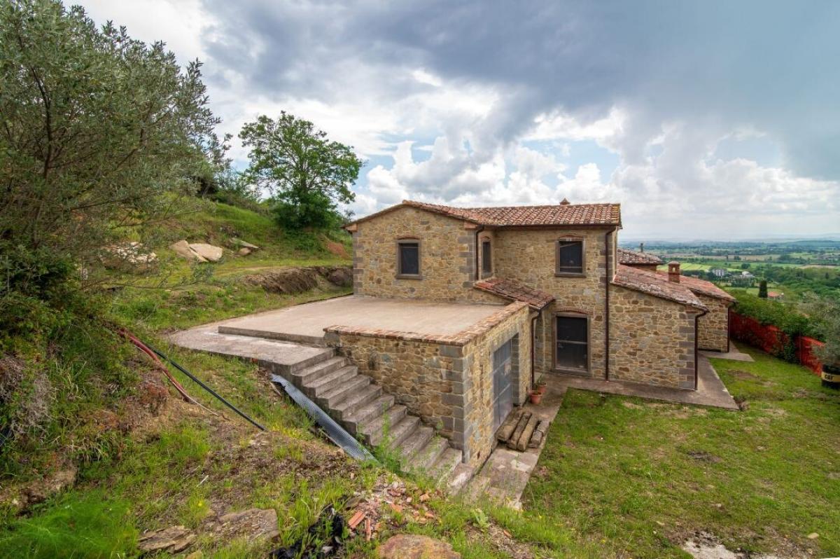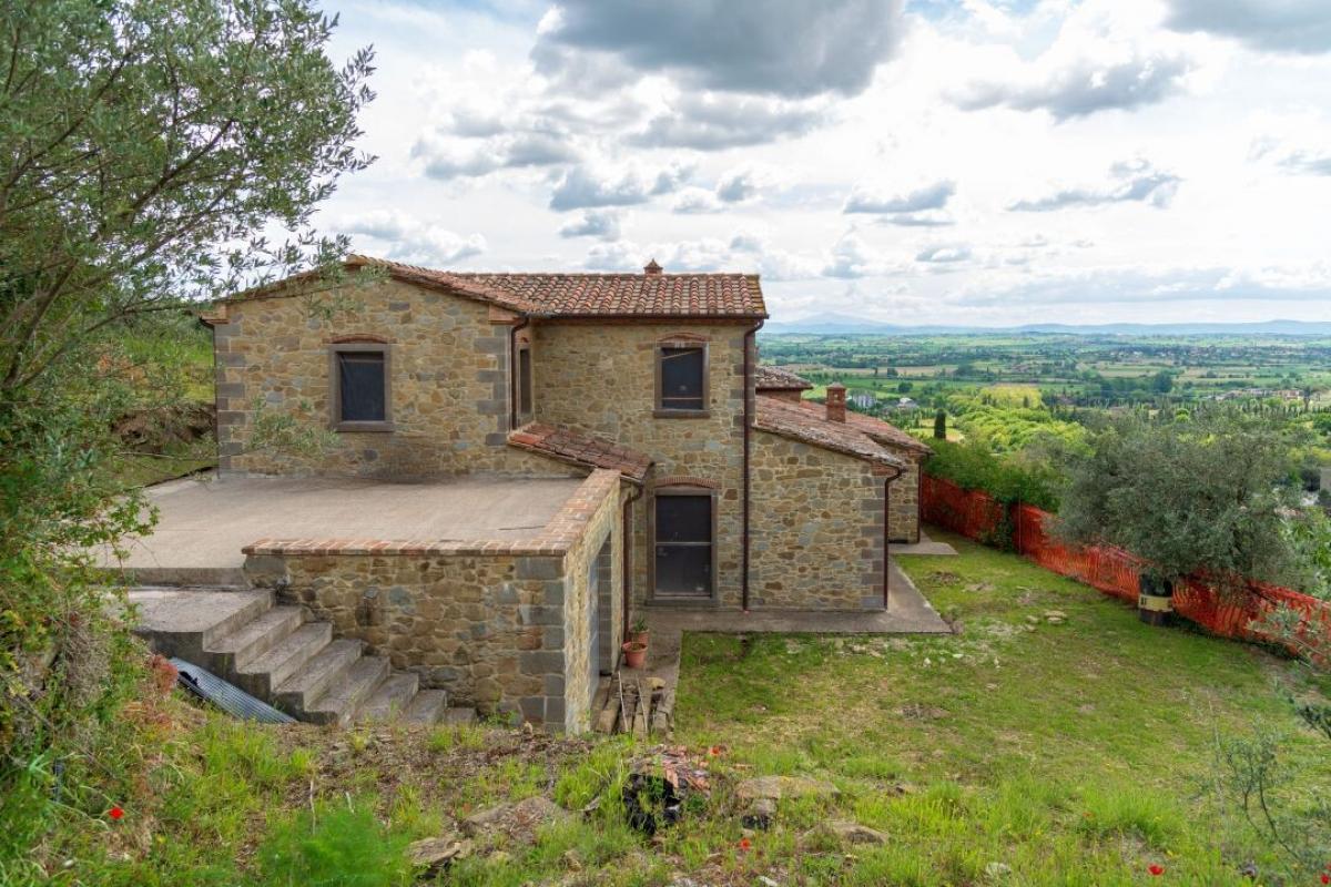 Limited-time reduced price! For sale near Cortona, prestigious rural setting, exceptional investment to tailor the interiors, 100-plant olive grove. Set in the picturesque hills just minutes from Cortona, this elegant semi-detached stone country house offers a rare opportunity to acquire a characterful residence with immense potential for personalisation. Situated in an exclusive and tranquil location with sweeping views over the Val di Chiana, the property is surrounded by olive groves and historic countryside, embodying the timeless allure of Tuscany. This former farmhouse, partly dating back to the mid-19th century, is arranged in a charming horseshoe-shaped layout. It has undergone partial restoration, providing a solid structural base while leaving ample scope for the discerning buyer to tailor the interiors and finishes to their exacting taste. The residence spans approximately 175 sqm (1,884 sq ft) over two floors and features local stone façades, traditional terracotta flooring, and exposed wooden beam ceilings that exude rustic elegance. The ground floor comprises seven versatile rooms, ideal for configuring a spacious living area, kitchen, bedroom, and hobby room. It also offers direct access to a garage, distinguished by a handcrafted local stone surround. Upstairs, the first floor accommodates three rooms, perfectly suited for two luminous bedrooms—one enjoying a panoramic view over the valley, the other with access to a generous private terrace—alongside a bathroom. The internal layout also lends itself to the creation of two independent living units, should one wish to generate rental income or accommodate guests in privacy. Outdoors, the property benefits from a charming rear garden, a dedicated area ideal for the addition of a swimming pool, and forecourt parking in front of the garage. The surrounding olive grove, with over 100 century-old trees, is complemented by fruit-bearing quince and fig trees, wild fennel, and aromatic bay laurel—evoking the authentic charm of Tuscan country life. Superbly positioned on the border between Tuscany and Umbria, the home enjoys excellent access to Cortonai, and the Lakeside region of Trasimeno. Whether envisioned as a distinguished primary residence, a holiday retreat, or an investment property with strong appeal in the luxury rental market, this residence presents an exceptional canvas on which to craft a truly unique home in one of Italy’s most sought-after regions. PROPERTY Ref: COR2190 Location: Cortona, Province: Arezzo, Region: Tuscany Type: 175 sq m/1884 sq ft two-story semi-detached country house with garage, garden and olive grove Year of construction: 1800 Conditions: partly restored, household system and finishes to be tailored Land/Garden: 2500 sq m/26910 sqft/0.6 acres plot of private land including 100 olive trees Parking: 30 sq m/322 sq ft garage Swimming pool: possibility to build in-ground pool Utilities: Fixed telephone network: Available Wi-Fi: Available Heating: single Water: 1 artesian well 99 meters deep that provides fresh drinking water and a significant storage capacity Wastewater disposal: sewage systems installed with Imhof pit Electricity: Active Distance from services: 800 m, 4 km from Cortona Distance from main airports: Perugia 58 km, Florence 123 km, Rome 230 km Gravel road: 80 m. Layout: Ground Floor: 2 rooms for living, kitchen, dining room, garage, cellar, outdoor bread oven First Floor: 2 bedrooms, 1 bathroom, 1 bedroom with en suite bathroom, storage room- garage