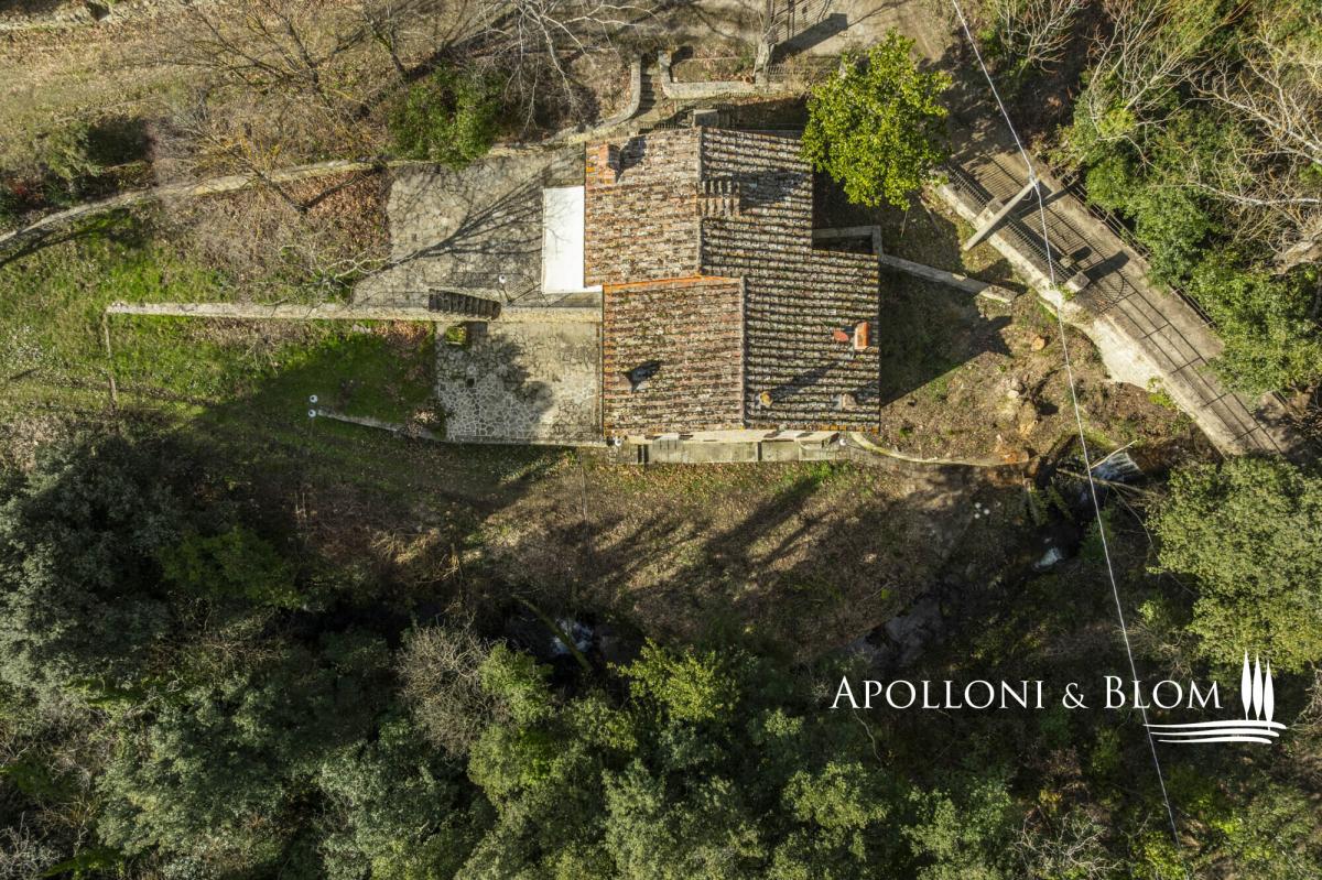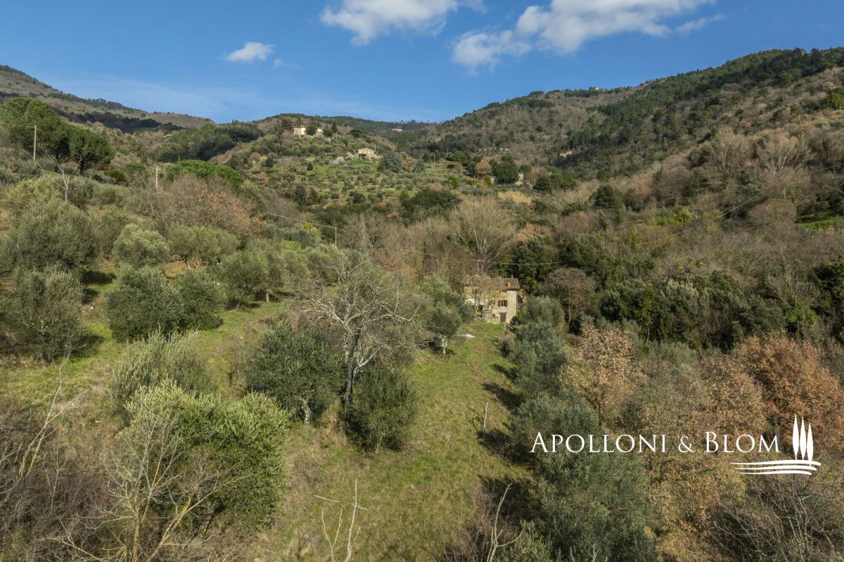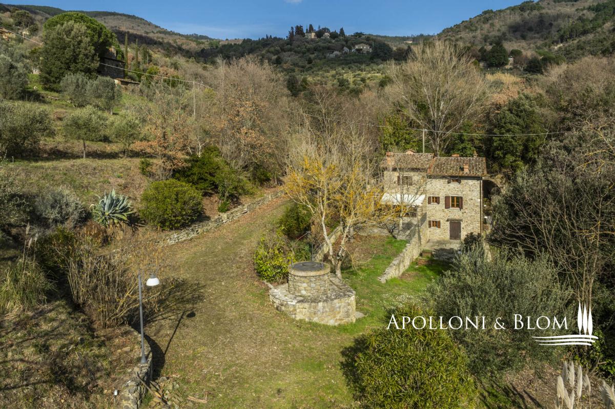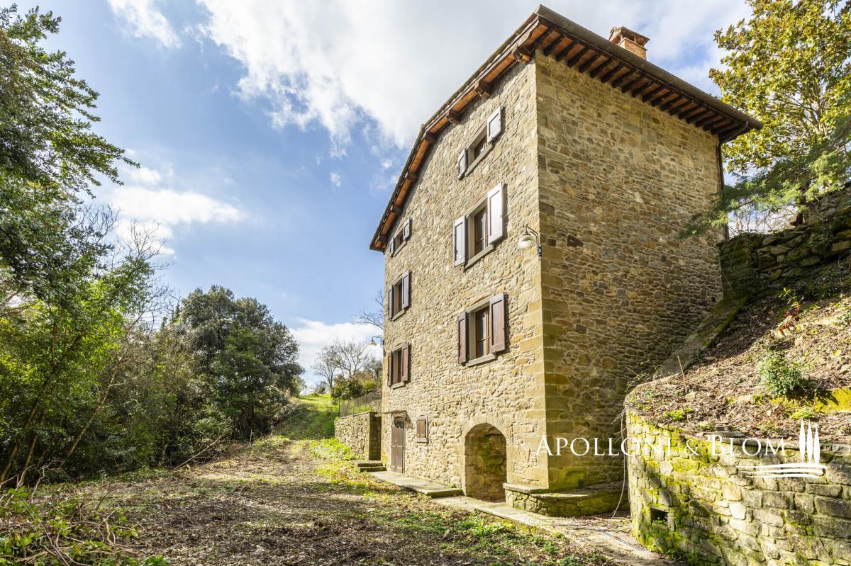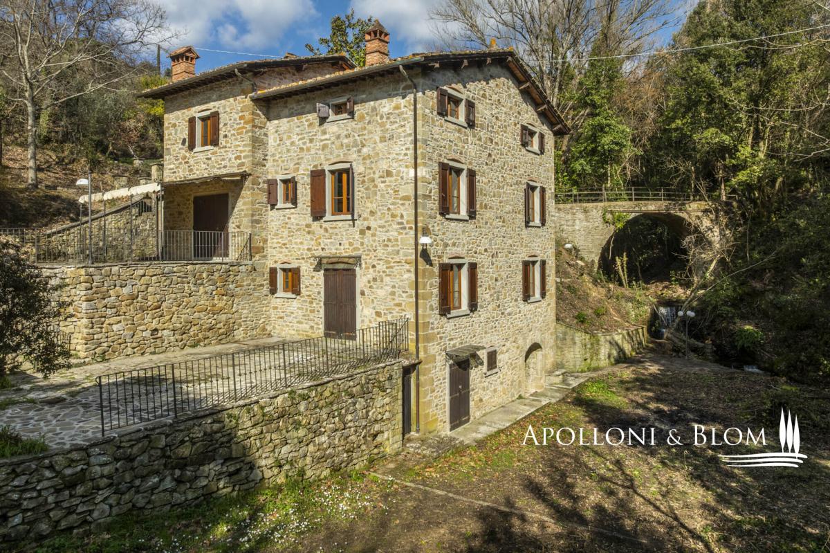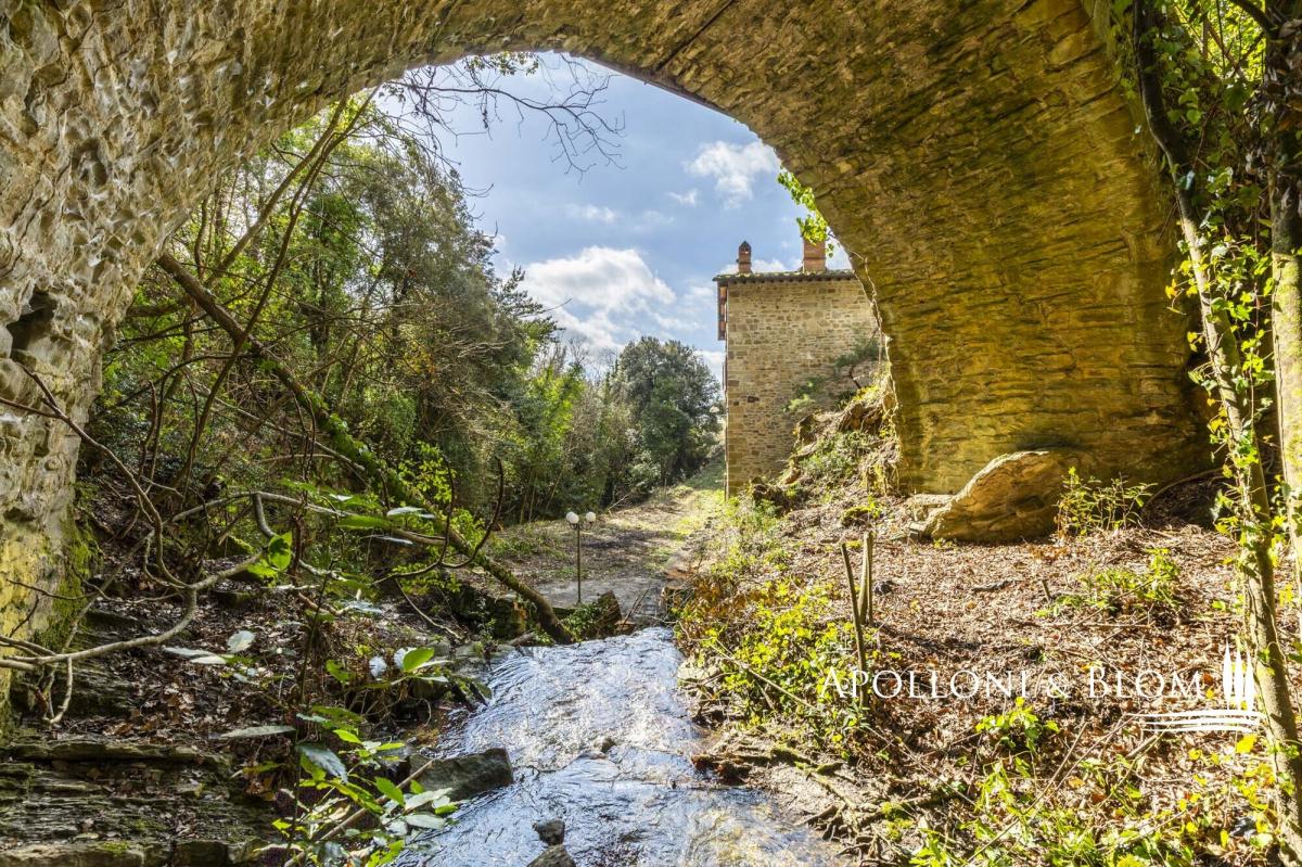 Unique landscape with the sound of water, four-story stone villa with historic character, terraces, garden and olive grove for sale near Cortona. Immersed in an atmosphere of absolute peace and bathed by the skyline of the city of Cortona, this property is an exceptional offering: a natural spring flows through the most evocative part of the garden, starring an ancient stone bridge that lends an intimate and highly evocative atmosphere. Meticulously restored in 2015, the stone building, dating back to the 1500s and once connected to the Eremo delle Celle in Cortona, preserves its original character while seamlessly integrating modern comfort and functionality. It extends to 260 sq m (2,798 sq ft) across four well-connected levels and is surrounded by 8,500 sq m (2.1 acres) of land with an olive grove, private driveway within the woods, and an outdoor parking area. The ground floor comprises generous, light-filled reception rooms, including an elegant room centred on an impressive fireplace, a traditional kitchen, and a second living area. The first floor accommodates three double bedrooms, two family bathrooms, and a second access with a panoramic terrace. Stone walls, wooden beam ceilings, terracotta and parquet flooring, wooden double-glazed fittings are just some of the amenities included. The layout allows the option of creating two independent units as the building is vertically divided and connected by an internal door at ground-floor level. The basement consists of technical rooms, storage areas, and iconic wine cellars, enhancing the rustic soul of the former mill and offering further space to be converted and tailored. A prestige opportunity for an exclusive Tuscan retreat, combining historic charm, modern comfort, and unparalleled location, yet just 2 km/1.25 miles from shops and services. PROPERTY Ref: COR3456 Location: Cortona, Province: Arezzo, Region: Tuscany Type: 260 sq m/2,798 sq ft historic four-story country house, former mill finely restored, with garden and olive grove Year of construction: 1500 Year of restoration: 2015 Conditions: excellent Land/Garden: 0,85 ha/2.1 acres consisting of 7,261 sq m/1.8 acres of olive grove and 1,250 sq m/0.3 acres of woodland Terrace/Balcony: terrace on the first floor Utilities: Fixed telephone network: available Internet: available Heating: radiator system powered by diesel fuel, fireplace Water: natural spring well Electricity: available Water waste: Imhoff tank Distance from services: 2 km/1.25 miles Distance from main airports: Perugia 68 km/42 miles; Florence 123 km/76 miles; Rome Fiumicino 243 km/151 miles Gravel road: 2 km/1.25 miles Layout: Basement: storage room, cellar, technical room Lower Ground Floor (-1): 2 cellar rooms Ground Floor: double living room with fireplace, second living area, staircase to the upper floor, hallway, 1 bathroom First Floor: 3 bedrooms, 2 bathrooms, hallway, second access with a terrace- garden
