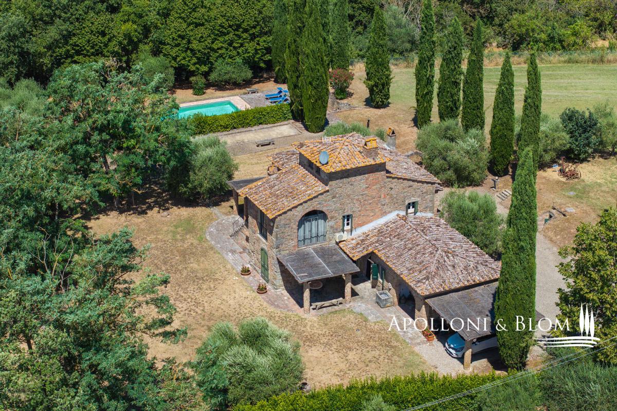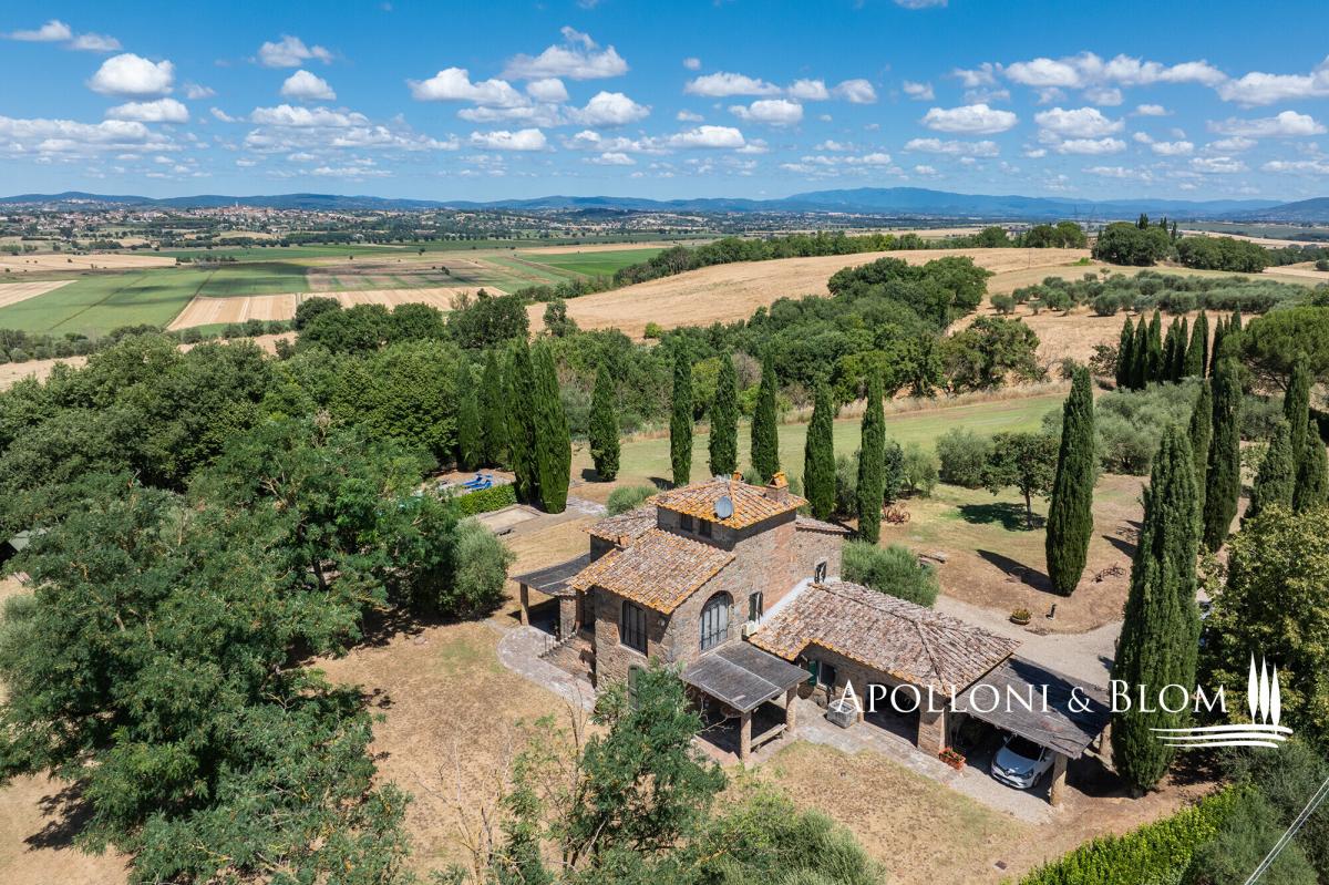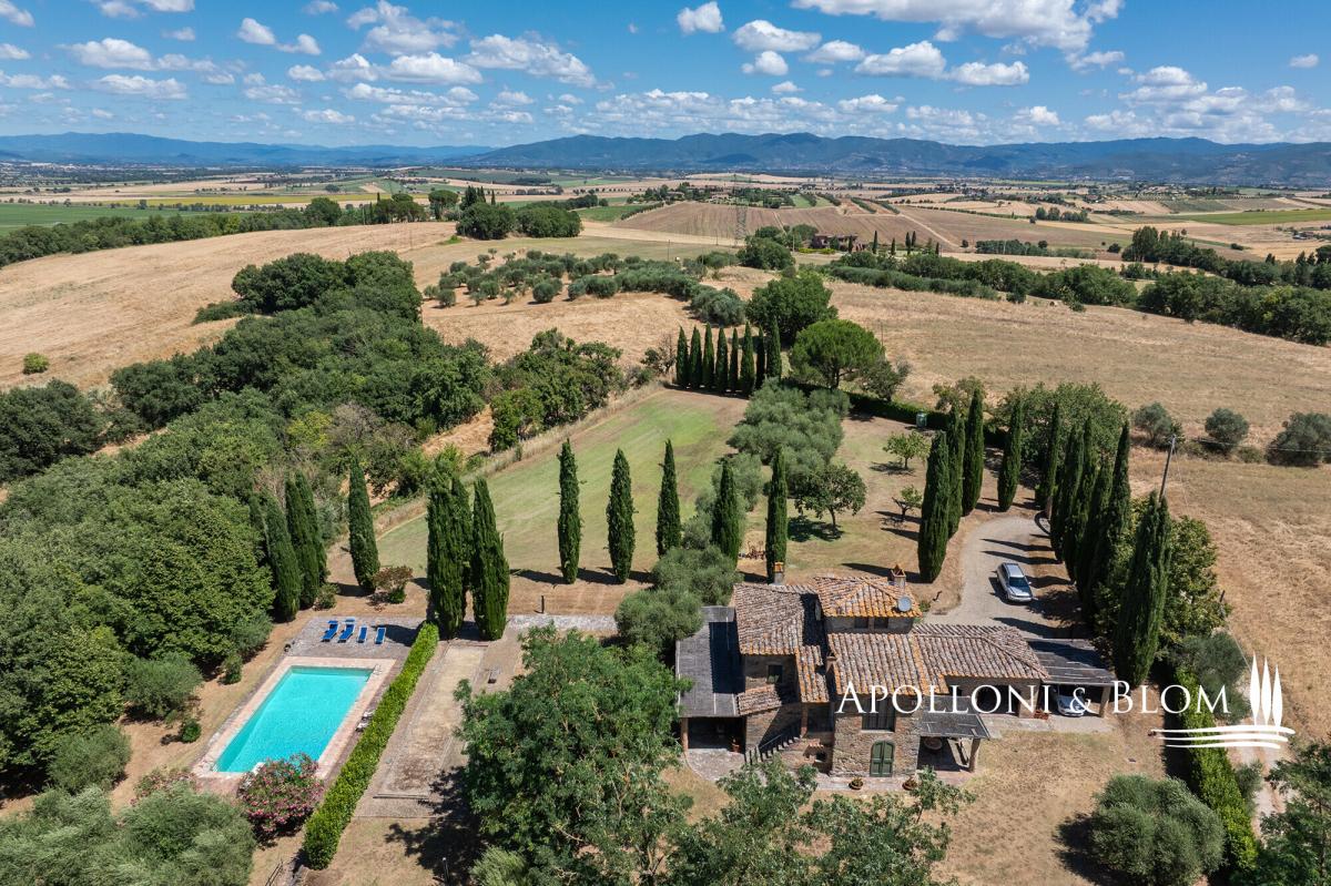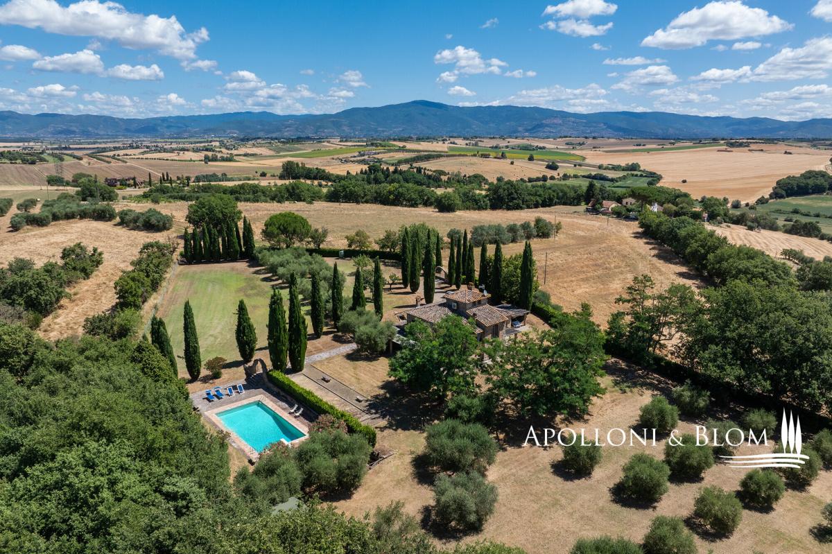 A masterclass in Tuscan elegance, this 1800s stone house boasts portico, brick arches, sunset pool, and olive grove for sale in Cortona. Nestled in the Val di Chiana countryside, this historic Tuscan stone country villa stands as a masterpiece of the traditional restoration of rural Italian architecture. In a commanding position near the ancient Etruscan hill town of Cortona, it was originally constructed in 1800 and spans a generous 359 square metres across two principal levels, crowned by a characteristic turret. The approach to the villa is defined by an avenue of stately cypresses, leading through 1.5 acres of impeccably landscaped grounds. Here, mature trees and an olive grove meet the manicured expanse of a lawn that hosts a swimming pool. The estate is accessed via a perfectly maintained 700-metre gravel driveway lined with cypress trees, while the landscaped grounds feature a traditional bocce court for quintessential Italian leisure. The exterior living spaces are designed with a front portico, for al fresco dining, while a second, more intimate veranda on the opposing side offers a secluded vantage point. Upon crossing the threshold, one is greeted by an interior that celebrates the tactile honesty of traditional materials. The ground floor is an expansive open-plan, where the volume is articulated by magnificent triple brick arches. These structural flourishes elegantly delineate the functional zones without sacrificing the sense of communal flow. Terracotta floors, warm and seasoned, run underfoot throughout, complemented by wooden beam ceilings. In the lounge, a stone fireplace serves as the heart of the home, while the kitchen area remains a testament to artisan craft, featuring bespoke cabinetry, central island and hand-wrought iron details that harmonise with the exposed masonry. The first floor accommodates two bedroom suites, one of which benefits from its own fireplace. One of the most evocative space is the study; here, soaring arched windows flood the room with natural light and offer a panoramic dialogue with the surrounding countryside. From the landing a masnory staircase connects to the turret space. Every corner of the property reflects a commitment to excellence, from the handmade ironmongery to the carefully preserved stone textures, ensuring that this house remains not just a home, but a living piece of Italian heritage. PROPERTY Ref: COR3552 Location: Cortona, Province: Arezzo, Region: Tuscany Type: 359 sq m/3864 sq ft two-story country villa plus turret, landscaped garden with swimming pool and olive grove Year of construction: 1900 Year of restoration: 1987 Conditions: excellent Garden: 6420 sq m/1.5 acres of landscaped garden with olive trees Terrace/Balcony: front and back porticoes Swimming pool: 12x6m Utilities: Fixed telephone network: available Internet: available Heating: LPG, fireplaces, heat pump system Water: artesian well Electricity: available Water waste: Imhoff tank Distance from services: 5 km Distance from main airports: Perugia 65km, Florence 112km Gravel road: 700 mt Layout: Ground Floor: entrance into an open-plan living area with triple brick arches separating the kitchen, a lounge with fireplace, and dining, access to the front portico, pantry, 2 guest bathrooms, 1 bedroom with en-suite bathroom First Floor: landing, 2 bedrooms with en-suite bathrooms (one with a fireplace), study with great wall windows Second Floor: turret used as storage area- garden