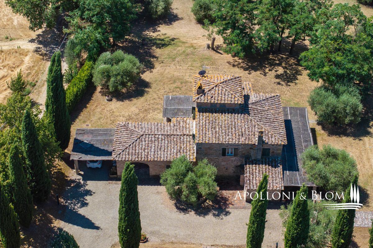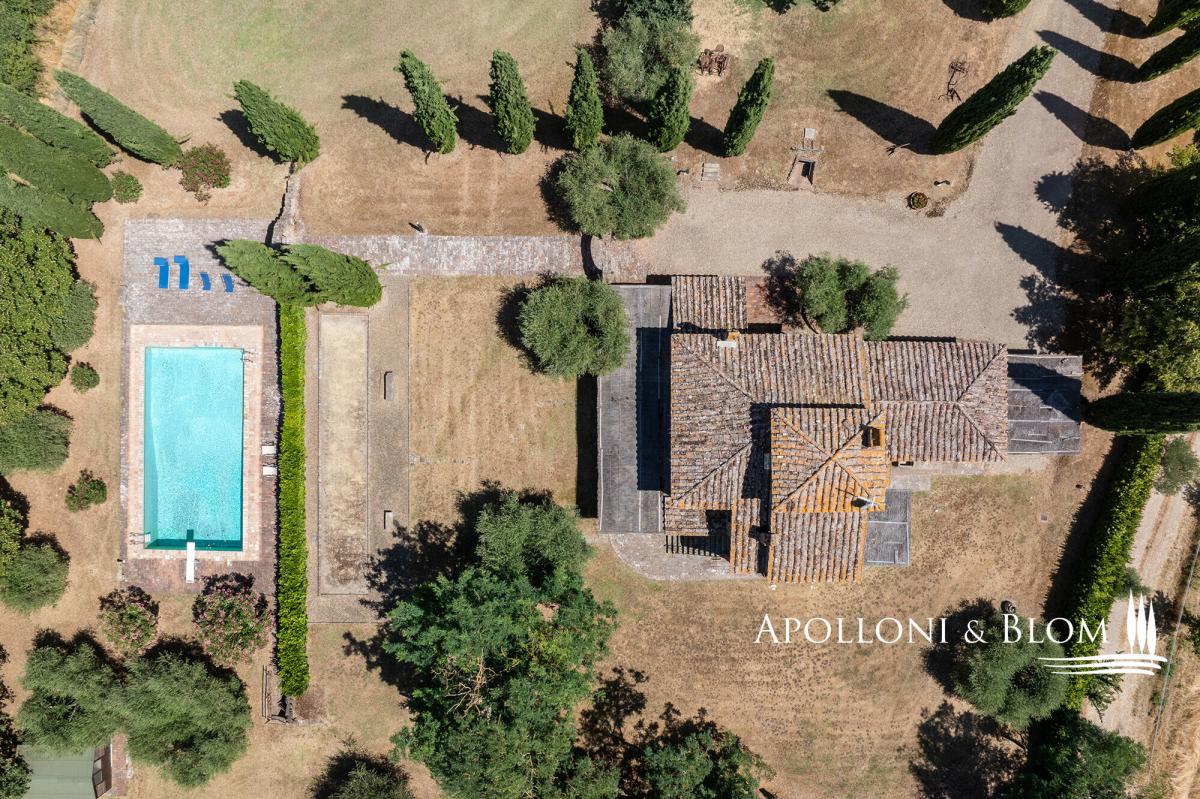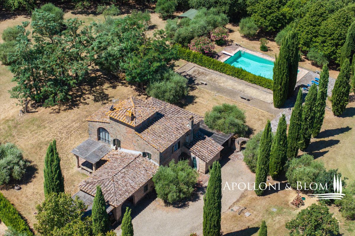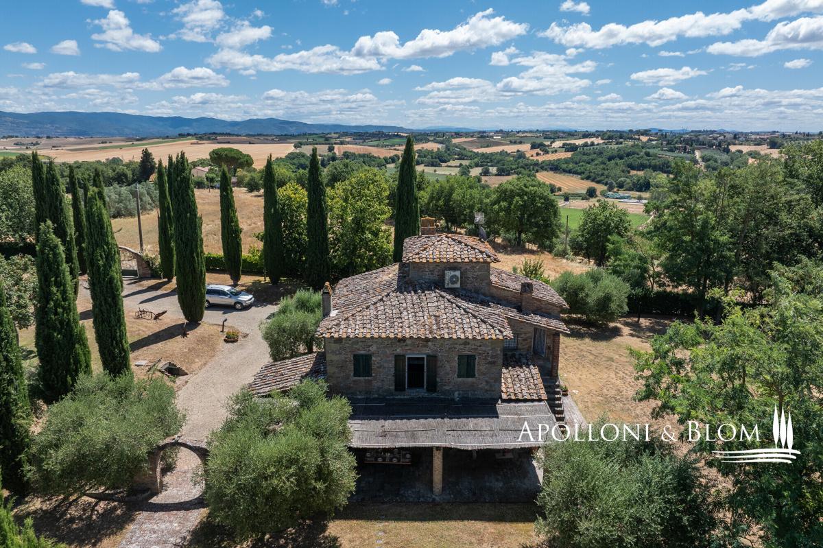 A masterclass in Tuscan elegance, this 1800s stone house boasts portico, brick arches, sunset pool, and olive grove for sale in Cortona. Nestled in the Val di Chiana countryside, this historic Tuscan stone country villa stands as a masterpiece of the traditional restoration of rural Italian architecture. In a commanding position near the ancient Etruscan hill town of Cortona, it was originally constructed in 1800 and spans a generous 359 square metres across two principal levels, crowned by a characteristic turret. The approach to the villa is defined by an avenue of stately cypresses, leading through 1.5 acres of impeccably landscaped grounds. Here, mature trees and an olive grove meet the manicured expanse of a lawn that hosts a swimming pool. The estate is accessed via a perfectly maintained 700-metre gravel driveway lined with cypress trees, while the landscaped grounds feature a traditional bocce court for quintessential Italian leisure. The exterior living spaces are designed with a front portico, for al fresco dining, while a second, more intimate veranda on the opposing side offers a secluded vantage point. Upon crossing the threshold, one is greeted by an interior that celebrates the tactile honesty of traditional materials. The ground floor is an expansive open-plan, where the volume is articulated by magnificent triple brick arches. These structural flourishes elegantly delineate the functional zones without sacrificing the sense of communal flow. Terracotta floors, warm and seasoned, run underfoot throughout, complemented by wooden beam ceilings. In the lounge, a stone fireplace serves as the heart of the home, while the kitchen area remains a testament to artisan craft, featuring bespoke cabinetry, central island and hand-wrought iron details that harmonise with the exposed masonry. The first floor accommodates two bedroom suites, one of which benefits from its own fireplace. One of the most evocative space is the study; here, soaring arched windows flood the room with natural light and offer a panoramic dialogue with the surrounding countryside. From the landing a masnory staircase connects to the turret space. Every corner of the property reflects a commitment to excellence, from the handmade ironmongery to the carefully preserved stone textures, ensuring that this house remains not just a home, but a living piece of Italian heritage. PROPERTY Ref: COR3552 Location: Cortona, Province: Arezzo, Region: Tuscany Type: 359 sq m/3864 sq ft two-story country villa plus turret, landscaped garden with swimming pool and olive grove Year of construction: 1900 Year of restoration: 1987 Conditions: excellent Garden: 6420 sq m/1.5 acres of landscaped garden with olive trees Terrace/Balcony: front and back porticoes Swimming pool: 12x6m Utilities: Fixed telephone network: available Internet: available Heating: LPG, fireplaces, heat pump system Water: artesian well Electricity: available Water waste: Imhoff tank Distance from services: 5 km Distance from main airports: Perugia 65km, Florence 112km Gravel road: 700 mt Layout: Ground Floor: entrance into an open-plan living area with triple brick arches separating the kitchen, a lounge with fireplace, and dining, access to the front portico, pantry, 2 guest bathrooms, 1 bedroom with en-suite bathroom First Floor: landing, 2 bedrooms with en-suite bathrooms (one with a fireplace), study with great wall windows Second Floor: turret used as storage area- garden