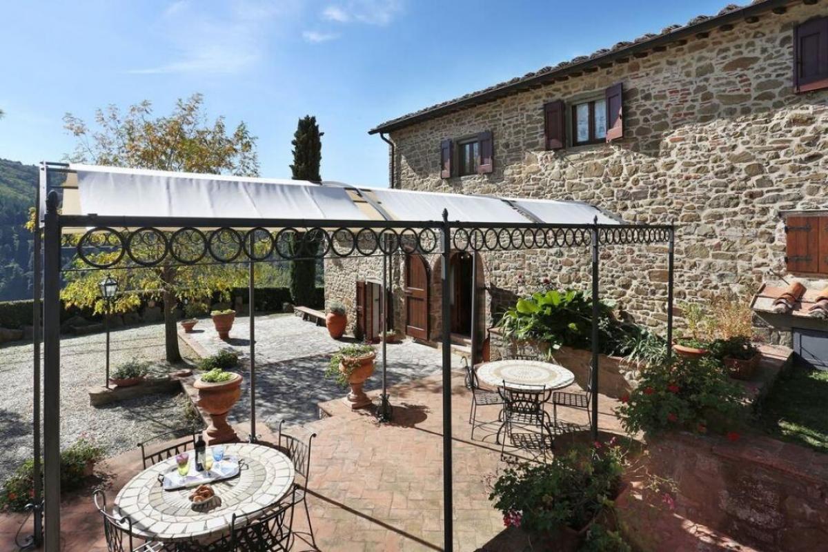 Enchanting 15th century country villa with pool, olive grove and vineyard for sale just 5 km from Gaiole in Chianti, Siena. In the heart of Chianti Classico, surrounded by centuries-old woods and rows of vines, close to prestigious estates with castles and medieval villages, a white gravel road leads to a driveway adorned with stones and cypress trees that introduces to a beautiful setting with central villa surrounded by garden, olive grove, vineyard and woods with spectacular views of the countryside. The villa is the result of the skillful restoration of a traditional Chianti farmhouse dating from the 1400s with exposed stone facades and walls, windows with wooden shutters, and gabled roofs covered with traditional Tuscan tile. The interiors still offer the rustic, historically rich atmosphere with terracotta arches and wooden ceilings joined by marble bathrooms with Jacuzzi, full-wall fireplaces, majolica tiles and wall paintings confering an elegant and refined atmosphere to the entire house. The villa oudoor is designed with terraces furnished with gazebos and outdoor living areas in addition to a pool with jacuzzi. Interior spaces feature living rooms with fireplaces, a piano, a dining room in the conservatory, kitchen, access to the outdoor kitchen with oven and barbecue. The master bedroom on the ground floor has its own private entrance and houses a four-poster bed, bathroom with shower and Jacuzzi. On the second floor, accessible by both internal and external stairs, a living room with fireplace, four bedrooms with en-suite bathrooms, two with whirlpool baths. All rooms are cooled by air-conditioning system. The solar panel system provides hot water in summer and partial heating in winter. An alarm system and fenced garden with automatic gate provide privacy and security. The over 6 acres of private ground include a small vineyard with production of Chianti Classico wine, an olive grove with 100 trees, woods and arable land. Perfect as a holiday villa, ready to live, for private use or income property hosting travelers for their vacations in Chianti. PROPERTY Ref: CNT2045 Location: Gaiole in Chianti, Province: Siena, Region: Tuscany Type: 400 sq m/4305 sq ft two-story country villa with 5 bedrooms, pool, outdoor kitchen, 6.2 ha of land with olive grove and vineyards Year of construction: 1400 Year of restauration: 1997 Conditions: excellent Land/Garden: 6,29 hectares/15.54 acres inclusive of fenced garden with irrigation system, 100 olive trees, 1.7 ha/4.2 acres Chianti Classico appellation vineyard, 1.2 ha /2.9 acres of vineyard/olive grove, 0.73 ha/1.8 acres of arable and pasture land, 2.4 ha/5.9 acres of woods Swimming pool: 6x12 m, with chlorine system Utilities: Fixed telephone network: available Internet: available Heating: solar panels + LPG Water: 2 wells deep 100mt and 160mt Electricity: available Alarm systems Air conditioning Electric gate Solar panels Insulated roof The property is owned by a private The location, for privacy, is approximate Please note all measurements cited are approximate Energy Efficiency Class: G Distance from services: 5.5 km/ 3.4 miles from Gaiole in Chianti Distance from main airports: Florence 73 km/ 45 miles, Pisa 124 km/ 77 miles Gravel road: 3 km/ 2 miles Layout: Ground Floor: living room with fireplace, dining room, kitchen, glass veranda, storage rooms, courtesy bathroom; with access from outside master bedroom with bathroom with Jacuzzi and shower First Floor: double living room with fireplace, 4 double bedrooms with en-suite bathrooms- terrace