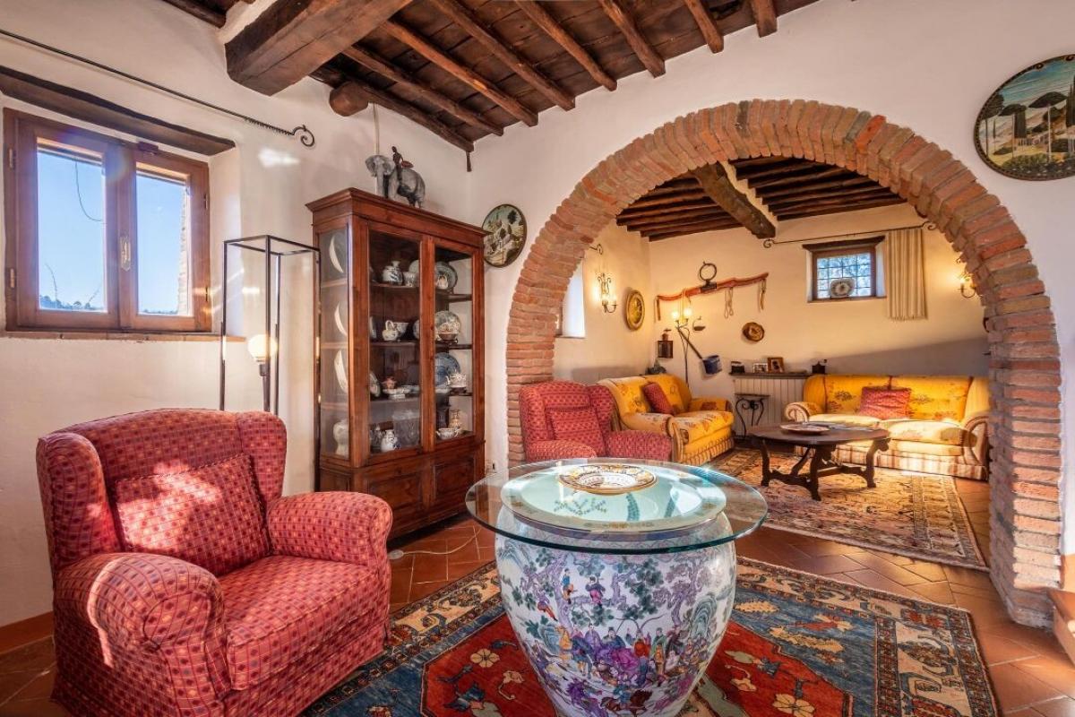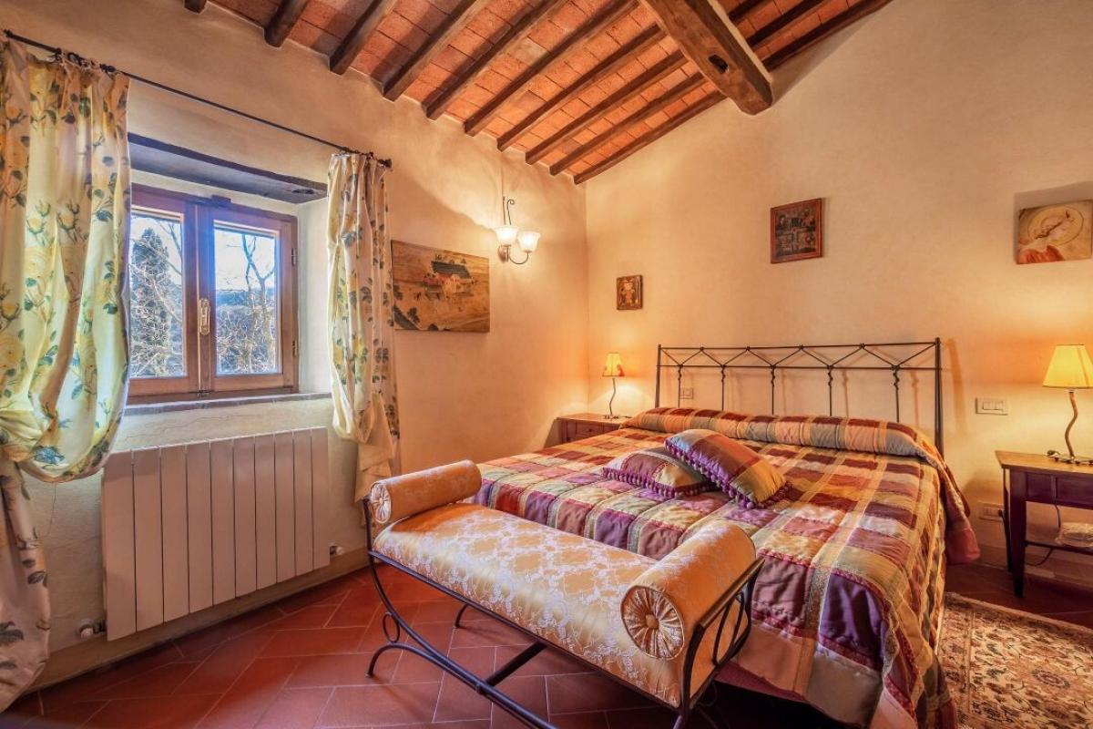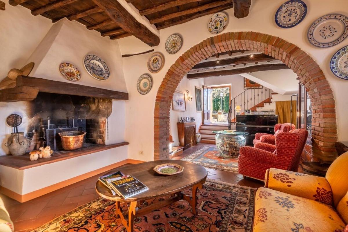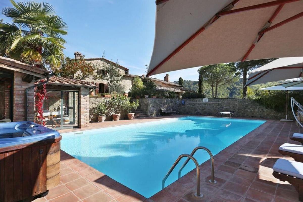 Enchanting 15th century country villa with pool, olive grove and vineyard for sale just 5 km from Gaiole in Chianti, Siena. In the heart of Chianti Classico, surrounded by centuries-old woods and rows of vines, close to prestigious estates with castles and medieval villages, a white gravel road leads to a driveway adorned with stones and cypress trees that introduces to a beautiful setting with central villa surrounded by garden, olive grove, vineyard and woods with spectacular views of the countryside. The villa is the result of the skillful restoration of a traditional Chianti farmhouse dating from the 1400s with exposed stone facades and walls, windows with wooden shutters, and gabled roofs covered with traditional Tuscan tile. The interiors still offer the rustic, historically rich atmosphere with terracotta arches and wooden ceilings joined by marble bathrooms with Jacuzzi, full-wall fireplaces, majolica tiles and wall paintings confering an elegant and refined atmosphere to the entire house. The villa oudoor is designed with terraces furnished with gazebos and outdoor living areas in addition to a pool with jacuzzi. Interior spaces feature living rooms with fireplaces, a piano, a dining room in the conservatory, kitchen, access to the outdoor kitchen with oven and barbecue. The master bedroom on the ground floor has its own private entrance and houses a four-poster bed, bathroom with shower and Jacuzzi. On the second floor, accessible by both internal and external stairs, a living room with fireplace, four bedrooms with en-suite bathrooms, two with whirlpool baths. All rooms are cooled by air-conditioning system. The solar panel system provides hot water in summer and partial heating in winter. An alarm system and fenced garden with automatic gate provide privacy and security. The over 6 acres of private ground include a small vineyard with production of Chianti Classico wine, an olive grove with 100 trees, woods and arable land. Perfect as a holiday villa, ready to live, for private use or income property hosting travelers for their vacations in Chianti. PROPERTY Ref: CNT2045 Location: Gaiole in Chianti, Province: Siena, Region: Tuscany Type: 400 sq m/4305 sq ft two-story country villa with 5 bedrooms, pool, outdoor kitchen, 6.2 ha of land with olive grove and vineyards Year of construction: 1400 Year of restauration: 1997 Conditions: excellent Land/Garden: 6,29 hectares/15.54 acres inclusive of fenced garden with irrigation system, 100 olive trees, 1.7 ha/4.2 acres Chianti Classico appellation vineyard, 1.2 ha /2.9 acres of vineyard/olive grove, 0.73 ha/1.8 acres of arable and pasture land, 2.4 ha/5.9 acres of woods Swimming pool: 6x12 m, with chlorine system Utilities: Fixed telephone network: available Internet: available Heating: solar panels + LPG Water: 2 wells deep 100mt and 160mt Electricity: available Alarm systems Air conditioning Electric gate Solar panels Insulated roof The property is owned by a private The location, for privacy, is approximate Please note all measurements cited are approximate Energy Efficiency Class: G Distance from services: 5.5 km/ 3.4 miles from Gaiole in Chianti Distance from main airports: Florence 73 km/ 45 miles, Pisa 124 km/ 77 miles Gravel road: 3 km/ 2 miles Layout: Ground Floor: living room with fireplace, dining room, kitchen, glass veranda, storage rooms, courtesy bathroom; with access from outside master bedroom with bathroom with Jacuzzi and shower First Floor: double living room with fireplace, 4 double bedrooms with en-suite bathrooms- terrace
