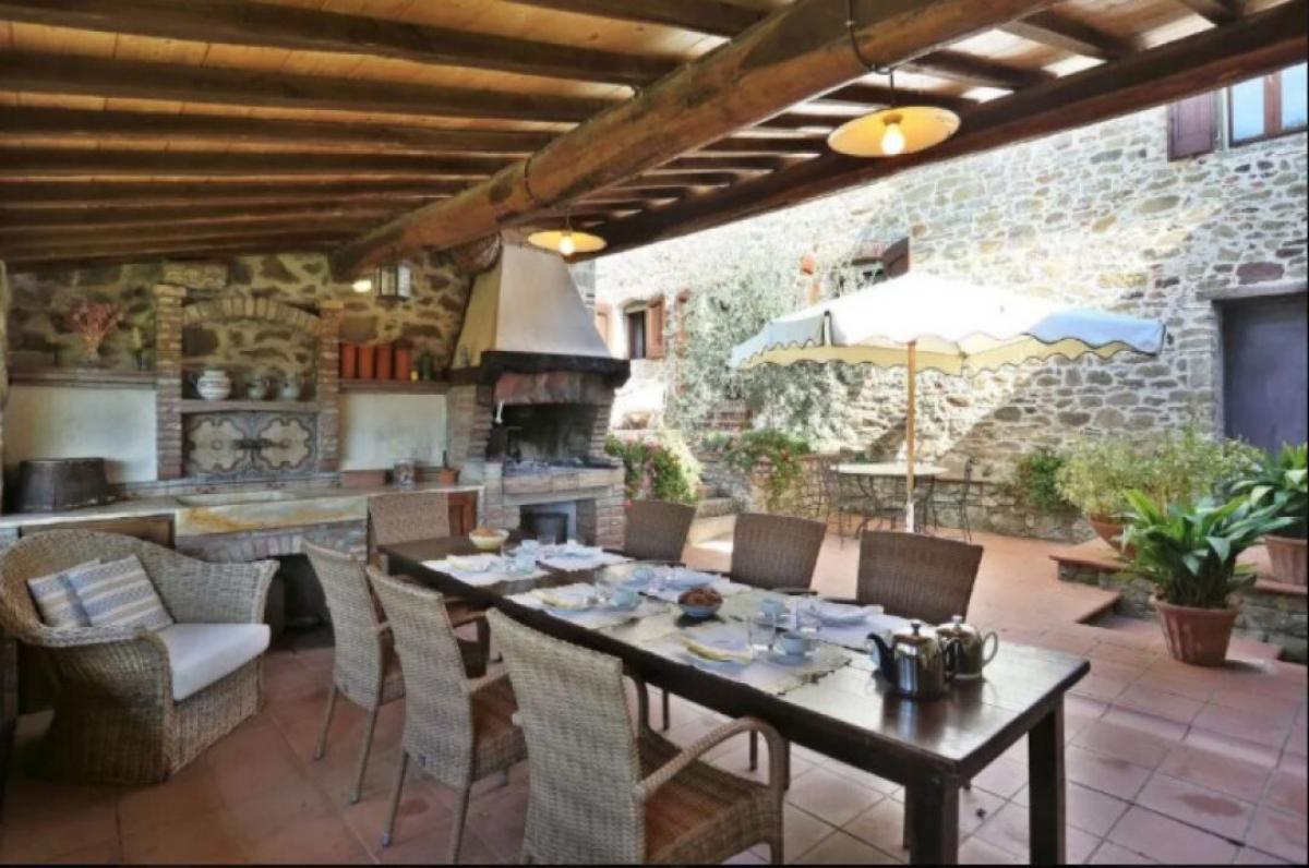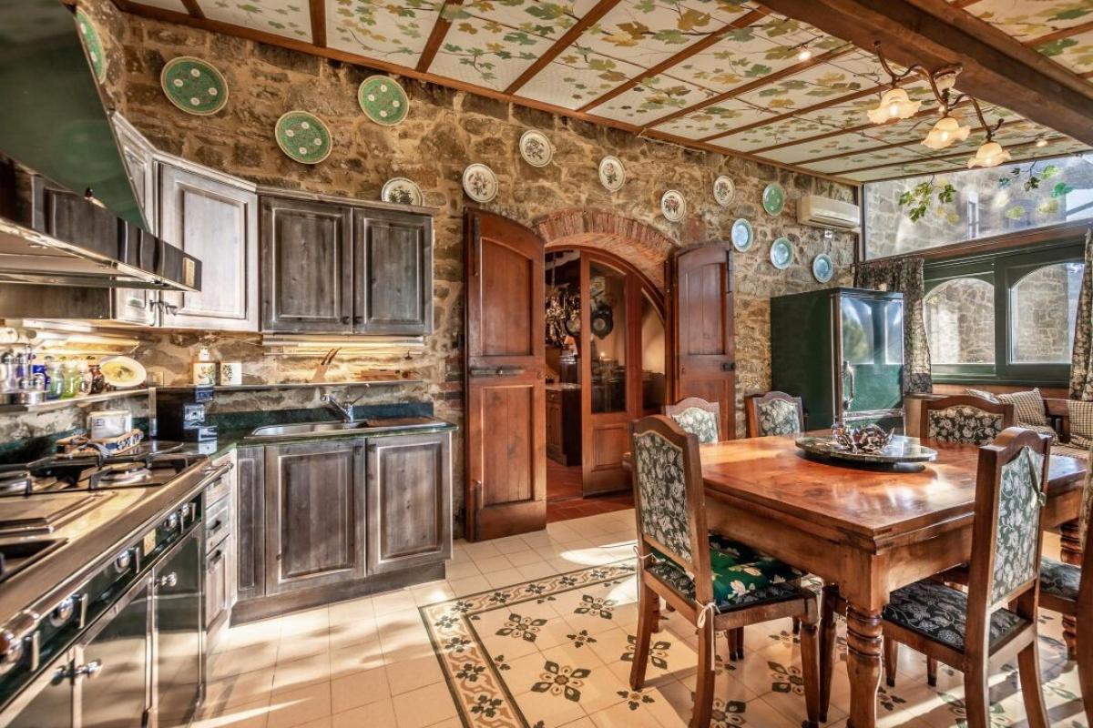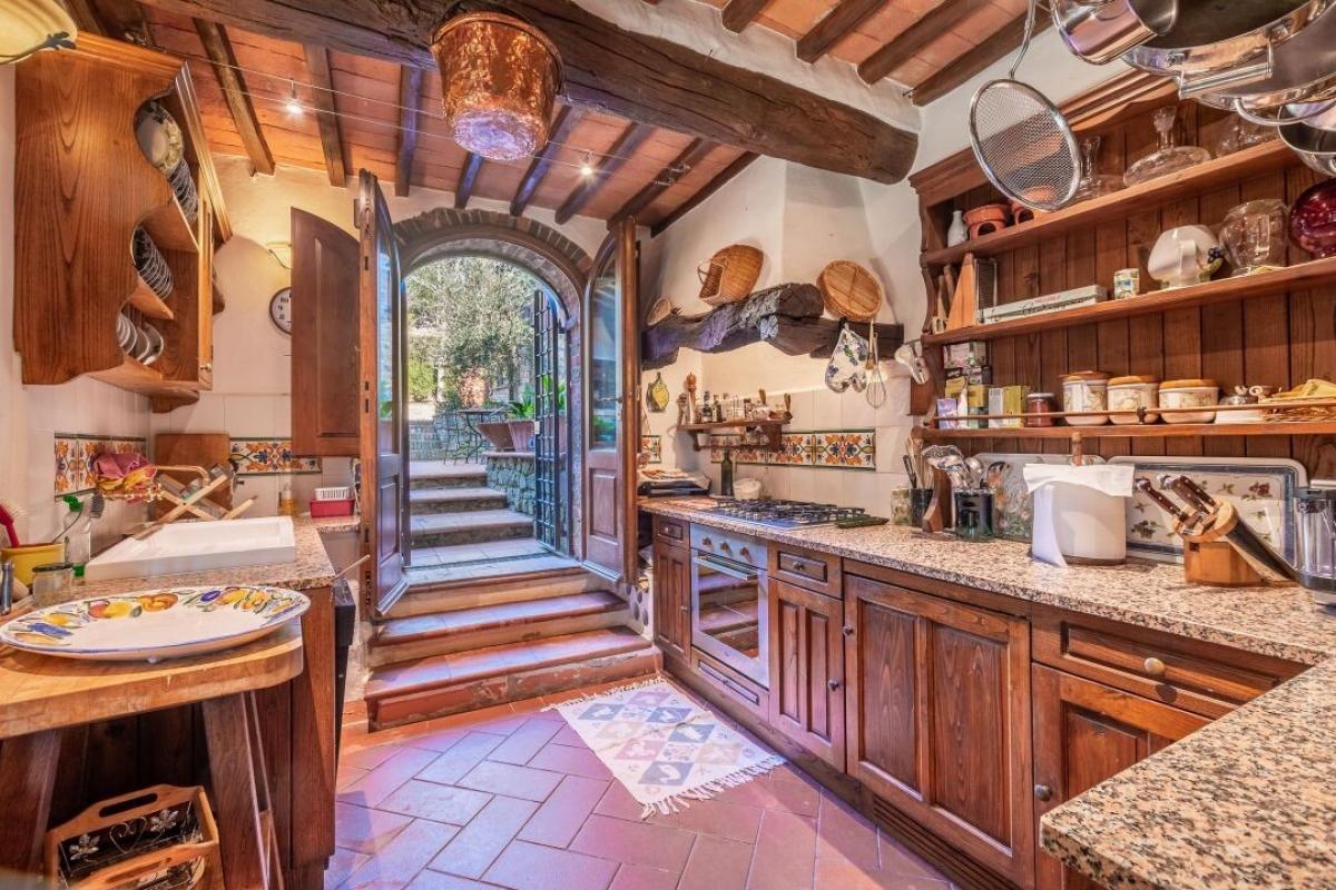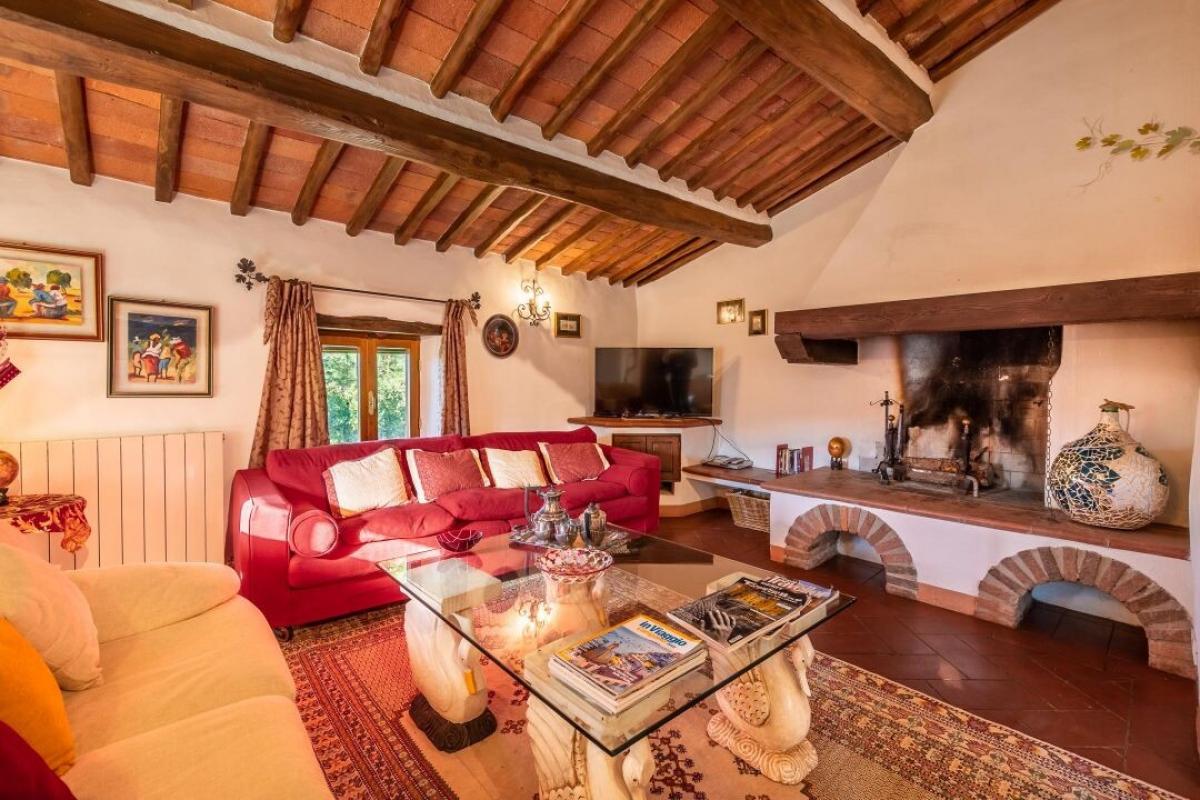 Enchanting 15th century country villa with pool, olive grove and vineyard for sale just 5 km from Gaiole in Chianti, Siena. In the heart of Chianti Classico, surrounded by centuries-old woods and rows of vines, close to prestigious estates with castles and medieval villages, a white gravel road leads to a driveway adorned with stones and cypress trees that introduces to a beautiful setting with central villa surrounded by garden, olive grove, vineyard and woods with spectacular views of the countryside. The villa is the result of the skillful restoration of a traditional Chianti farmhouse dating from the 1400s with exposed stone facades and walls, windows with wooden shutters, and gabled roofs covered with traditional Tuscan tile. The interiors still offer the rustic, historically rich atmosphere with terracotta arches and wooden ceilings joined by marble bathrooms with Jacuzzi, full-wall fireplaces, majolica tiles and wall paintings confering an elegant and refined atmosphere to the entire house. The villa oudoor is designed with terraces furnished with gazebos and outdoor living areas in addition to a pool with jacuzzi. Interior spaces feature living rooms with fireplaces, a piano, a dining room in the conservatory, kitchen, access to the outdoor kitchen with oven and barbecue. The master bedroom on the ground floor has its own private entrance and houses a four-poster bed, bathroom with shower and Jacuzzi. On the second floor, accessible by both internal and external stairs, a living room with fireplace, four bedrooms with en-suite bathrooms, two with whirlpool baths. All rooms are cooled by air-conditioning system. The solar panel system provides hot water in summer and partial heating in winter. An alarm system and fenced garden with automatic gate provide privacy and security. The over 6 acres of private ground include a small vineyard with production of Chianti Classico wine, an olive grove with 100 trees, woods and arable land. Perfect as a holiday villa, ready to live, for private use or income property hosting travelers for their vacations in Chianti. PROPERTY Ref: CNT2045 Location: Gaiole in Chianti, Province: Siena, Region: Tuscany Type: 400 sq m/4305 sq ft two-story country villa with 5 bedrooms, pool, outdoor kitchen, 6.2 ha of land with olive grove and vineyards Year of construction: 1400 Year of restauration: 1997 Conditions: excellent Land/Garden: 6,29 hectares/15.54 acres inclusive of fenced garden with irrigation system, 100 olive trees, 1.7 ha/4.2 acres Chianti Classico appellation vineyard, 1.2 ha /2.9 acres of vineyard/olive grove, 0.73 ha/1.8 acres of arable and pasture land, 2.4 ha/5.9 acres of woods Swimming pool: 6x12 m, with chlorine system Utilities: Fixed telephone network: available Internet: available Heating: solar panels + LPG Water: 2 wells deep 100mt and 160mt Electricity: available Alarm systems Air conditioning Electric gate Solar panels Insulated roof The property is owned by a private The location, for privacy, is approximate Please note all measurements cited are approximate Energy Efficiency Class: G Distance from services: 5.5 km/ 3.4 miles from Gaiole in Chianti Distance from main airports: Florence 73 km/ 45 miles, Pisa 124 km/ 77 miles Gravel road: 3 km/ 2 miles Layout: Ground Floor: living room with fireplace, dining room, kitchen, glass veranda, storage rooms, courtesy bathroom; with access from outside master bedroom with bathroom with Jacuzzi and shower First Floor: double living room with fireplace, 4 double bedrooms with en-suite bathrooms- terrace