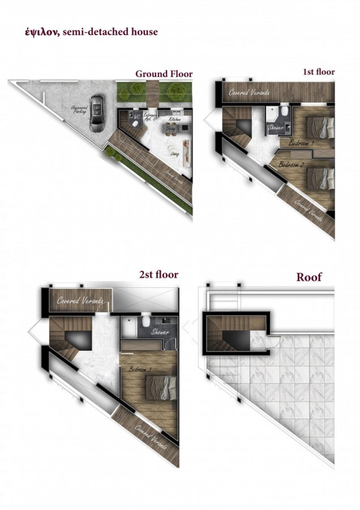 For sale spacious corner townhouse with 3 bedroom in New project in Geroskipou. The house includes spacious living area with an open plan kitchen, guest toilet and on the first floor and 2 bedrooms with balconies with a sea view , family bathroom and one master bedroom on the second floor. Also the house has a covered private parking, storage room and big roof garden.A