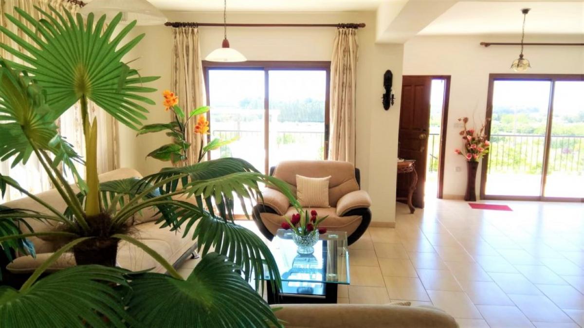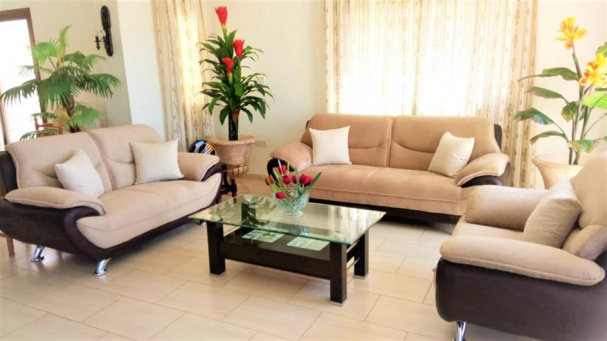 The villa is set in one of the most beautiful locations in Geroskipou, Paphos, not only is it quiet, it is also close to some of the main attractions in Paphos. It is situated only few minutes away from the Beach front of Kato Paphos. It must be the only Villa, which is in the area of Paphos Waterpark and Other Athletic Resorts.The villa has a title deed. It located in a quiet residential area offering panoramic sea and inland views. The beautiful large swimming pool is quite private and measures 6m X 12m with steps set in a recess. Poolside shower, Sun Loungers and umbrellas surround the swimming pool. Automatic lights illuminate the swimming pool area at night. A combination of fencing, mature trees and colourful shrubbery ensure the pool area enjoys a reasonable degree of privacy. There are 4 bedrooms and 3 bathrooms. The master bedroom has a double bed with en-suite shower room has a large private balcony overlooking the swimming pool and surrounding countryside across to the sea with sea views. A safe box is available. There are 2 twin bedrooms and 1A double bedroom with mountain and sea views and with a balcony in the one bedroom overlooking the sea and the countryside. Each bedroom has fitted wardrobes. All four bedrooms have an air-conditioning unit. The villa boasts two sitting areas, both of them comfortably furnished. The large kitchen is fully equipped with oven and hob, fridge/freezer, microwave and washing machine. The dining table can seat 8 persons. A guest cloakroom also located on this level where you can enjoy your tea with a panoramic views. On the ground floor there is a storage which can be used as an extra bedroom with toilet. Outside the kitchen you can find the BBQ. Patio doors lead from the living area to the balcony complete with a swing lounger. All in all, it is a luxury 4 bedroom villa located in a serene and residential environment, in a large landscaped plot. It is close to the beach and only a short distance from the Harbour. It is just 5 minutes drive from Kato Paphos, golf courses and hotels, 500 m from the the shops and supermarkets, water park, tennis, mini golf, go-carts, 5 minutes drive from a selection of cafes and restaurants. The Villa is situated only 5 minutes from the beach. The Paphos airport is 6 km away.The property was constructed to the highest specification. A beautiful residential property in a quiet residential area offering panoramic sea and landscape view.