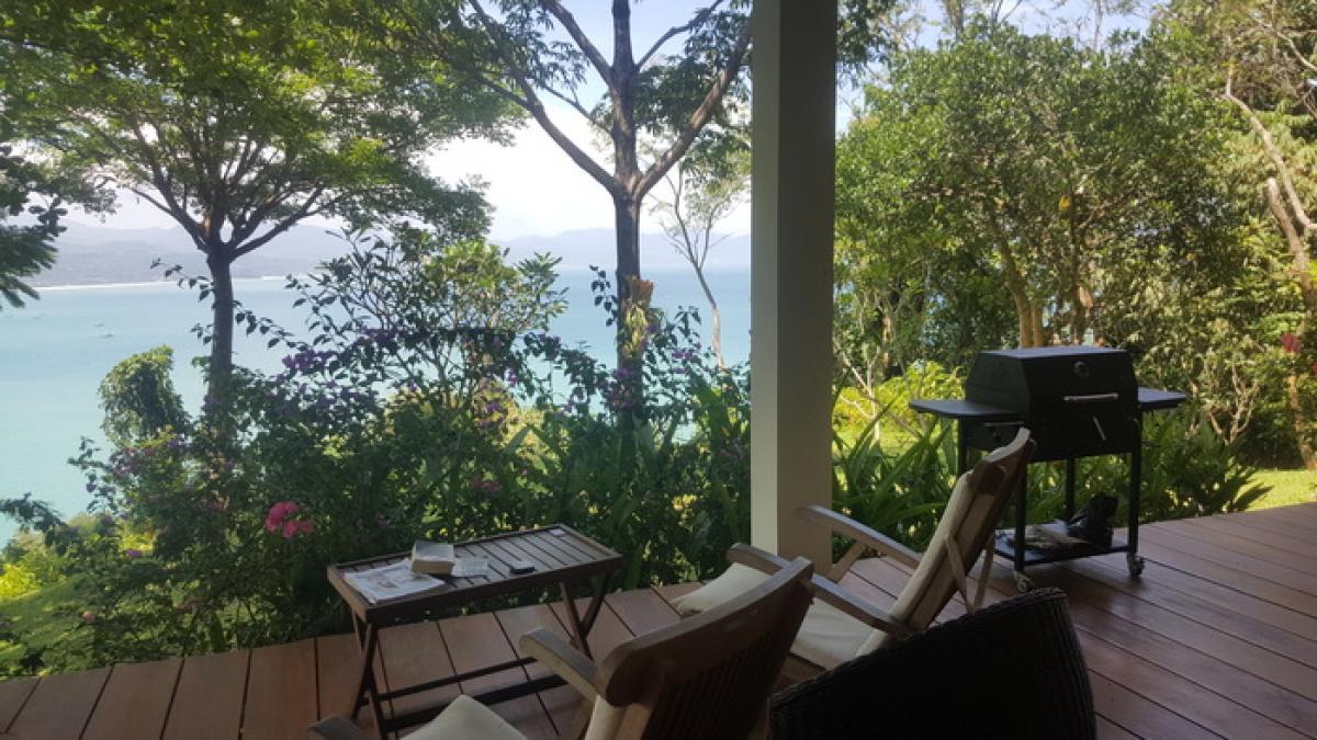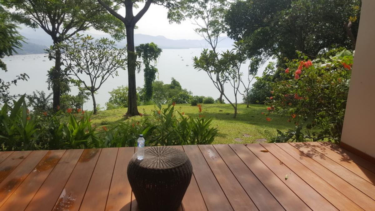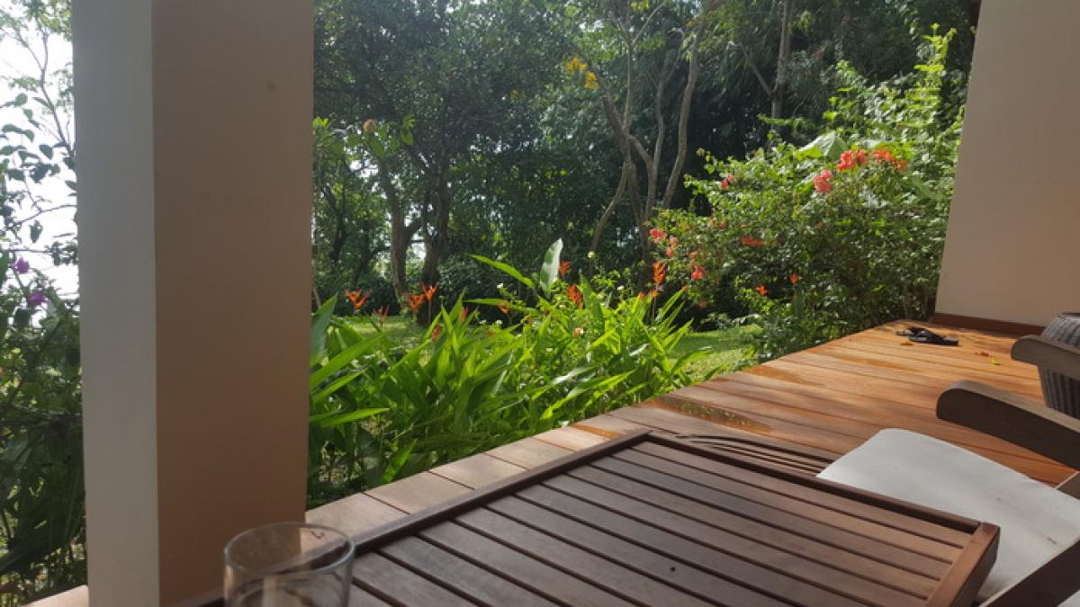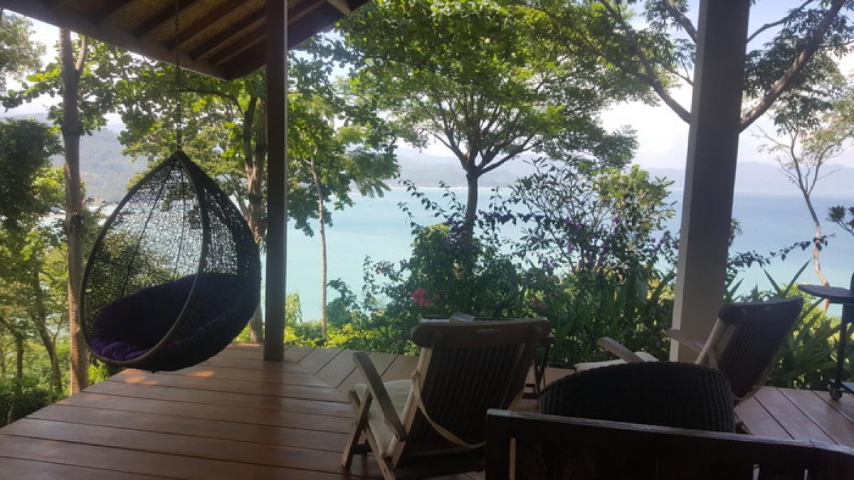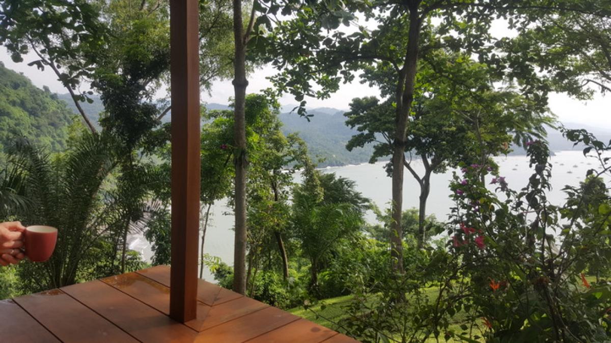Breath-taking vista of the bay below on one side and uninterrupted view of the mountain and jungle on the other