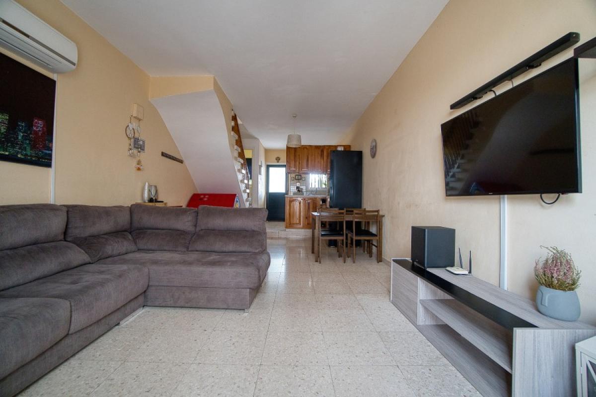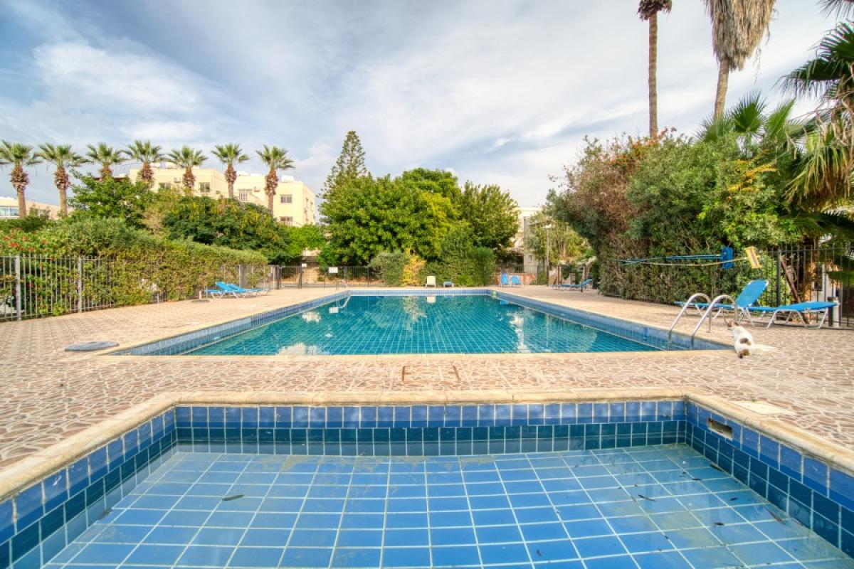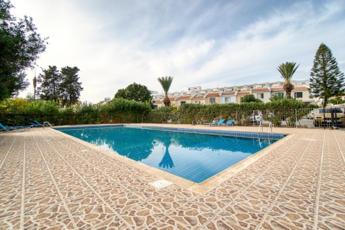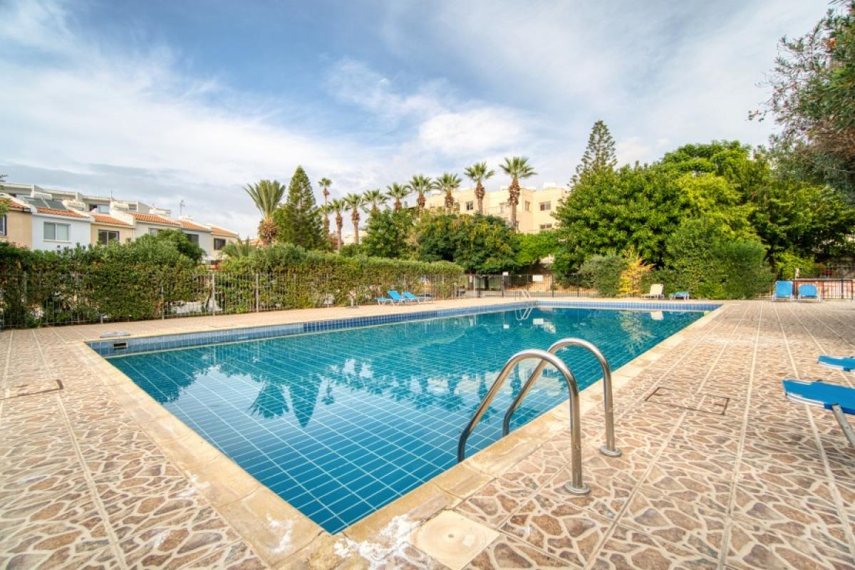 Two-bedroom townhouses in the tourist area of Paphos, in the Tombs of the Kings area. The kitchen is part of an open living room with dining area. The main bedroom has a double bed and a built-in wardrobe, the second bedroom is a children's room. In front of the front door there is a small terrace with outdoor furniture.
