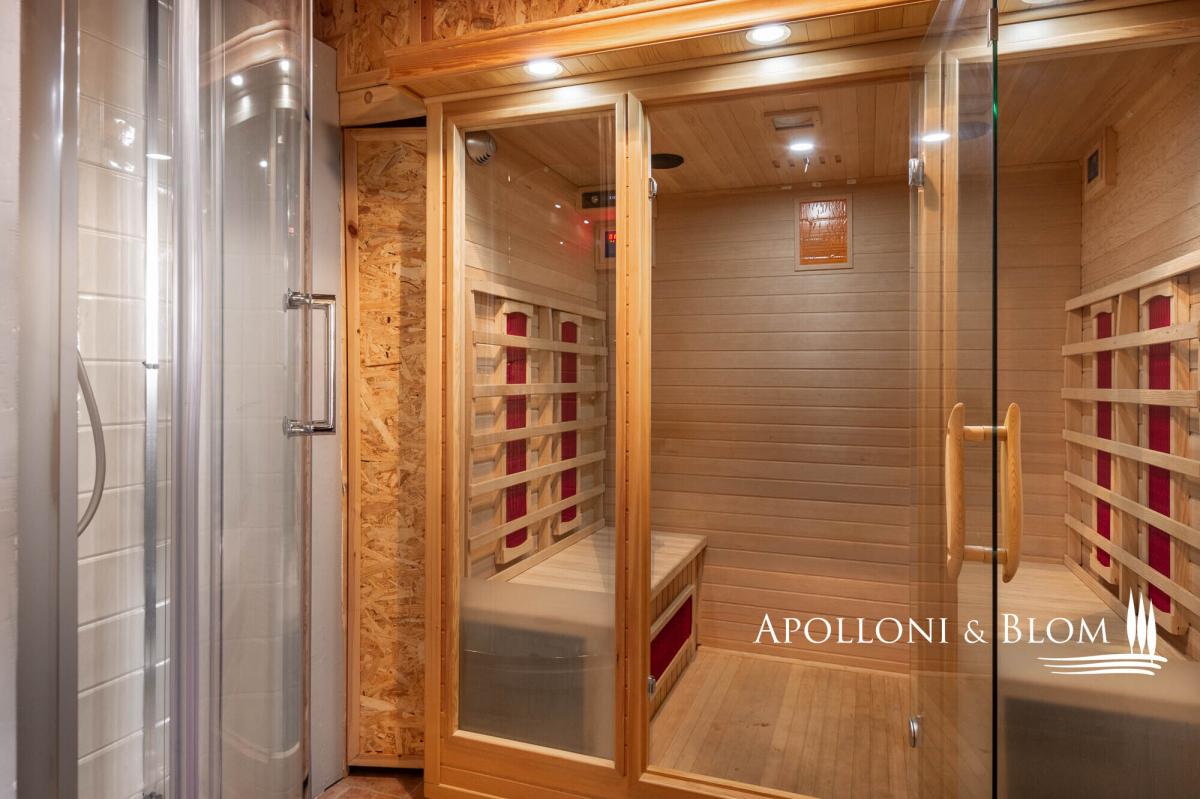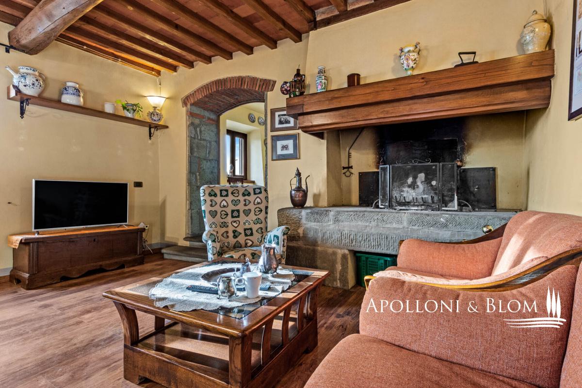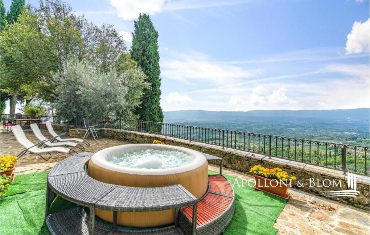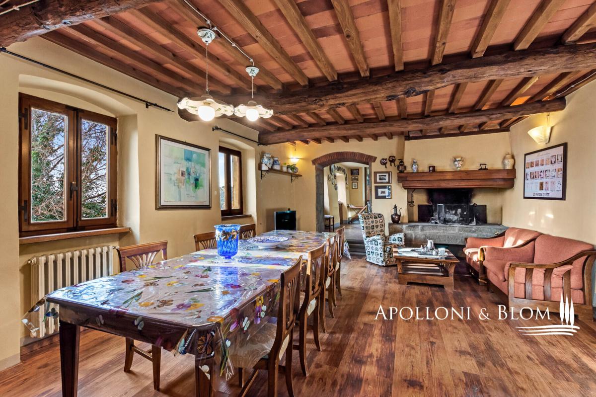 15th-century country house with annexes, detached villa, panoramic swimming pool, solar panels, and 3.9 hectares of land for sale in Loro Ciuffenna, Arezzo. In a panoramic position with breathtaking views over the Valdarno valley and the Chianti hills, at 350 metres/ 1,148 ft above sea level, La Guardiaccia is a true haven for those who love peace and nature, surrounded by ancient woodland and endless horizons. The main country house dates back to the 1400s and retains its medieval stone façades and brick arches. Spread over three levels, it features large belvedere terraces equipped with outdoor living areas and a hot tub. Recently restored into an elegant country residence in rustic style, it offers four bedrooms, together with a spa annex complete with gym and sauna room. The interiors boast evocative wooden beam ceilings, with several rooms preserving original terracotta floors and charming stone fireplaces. These historic features blend harmoniously with modern finishes including wooden double-glazed windows, parquet floors, ceramic-tiled bathrooms, and a new photovoltaic system providing electricity and hot water during the summer months. The central floor of the country house serves as the heart of the home, hosting a cosy living room with fireplace, dining room, kitchen, and terraces on both sides. The spa annexe sits in the courtyard facing the main house, alongside a wood oven with barbecue and covered portico. A short garden path leads to the pool area, beautifully set in a sun terrace paved with stone and terracotta, complete with gazebo. At the far end stands a former medieval hay barn, tastefully restored and converted into a romantic guest cottage. A cypress-lined drive leads to a two-storey villa of 136 sq m/ 1,463 sq ft, perfectly integrated into the landscape, with large windows filling every room with natural light. It features parquet flooring, solar panels, and all modern comforts. La Guardiaccia is surrounded by 1,730 sqm/18,618 sq ft of landscaped garden and 3.9 hectares of land/9.64 acres with olive groves, woodland, and three horse boxes. Nestled in the heart of the Tuscan countryside between Florence and Arezzo—both just a 30-minute drive away—it lies 15 km from the A1 motorway and only twenty minutes from Prada and The Mall Luxury Outlet. Loro Ciuffenna, just 2.5 km/1.55 miles away, is a picturesque medieval village with a charming historic centre, famous for its thousand-year-old working mill. The town offers all main amenities, including cafés, restaurants, shops, and a post office. PROPERTY Ref: ARZ2905 Location: Loro Ciuffenna, Province: Arezzo, Region: Tuscany Type: 450 sq m/4843 sq ft three-story stone country house including a separate annex with portico and bread oven, spa with gym and sauna room, spacious terraces with belvedere and Jacuzzi, pool, guest house, garden and land Year of construction: 1400 Year of restoration: 2007 Conditions: excellent Land/Garden: 3.9 ha/9.64 acres with 1,730 mq/18,618 sq ft of garden, 1.27 ha/3.14 acres of olive grove, 1.89 ha/4.67 acres of vineyard, and 7,503 mq/1.85 acres of woodland. Terrace/Balcony: 720 sq m/7750 sq ft of outdoor paved terraces Swimming pool: 12x6m, featuring Roman-style step, terracotta bordering, stone paved sundeck with gazebo Parking: outdoor parking facility Utilities: Fixed telephone network: available Internet: available Heating: LPG + pellet boiler + summer hot water with solar panels Water: natural spring for domestic use + 1 artesian well for irrigation use Electricity: available + 2 photovoltaic systems – each 6kw Waterwaste: Imhoff tank Sauna Gym/Fitness room Solar panels and photovoltaic systems Distance from services: 2,5 km/1.5 miles Distance from main airports: Florence 70km/43 miles, Perugia 130km/80 miles, Pisa 135km/83 miles, Bologna 160km/99 miles Layout: Country House of 315 sqm/3,392 sq ft over 3 levels Ground Floor: living room, kitchen, 1 double bedroom, 1 bathroom, 4 cellar and storage rooms First Floor (excluding the SPA area): living room with fireplace, 2 kitchens, dining room, 1 bedroom, 1 bathroom, habitable panoramic terrace Second Floor: master bedroom with en-suite bathroom, 2 double bedrooms, 1 guest bathroom Villa over 2 levels, 136 sqm/1,463 sq ft Ground Floor: living room with fireplace, kitchen, guest bathroom in the living area, stairs to the first floor First Floor: corridor, 2 bedrooms, 2 bathrooms Former barn / annex of approximately 50 sqm/538 sq ft over 2 levels Ground Floor: living room with kitchen and access to the swimming pool First Floor: 1 double bedroom, 1 bathroom Annex/es: 1 annex with a guest house of approximately 50 sqm over two levels, comprising living room with kitchen, 1 bedroom, and 1 bathroom 1 annex of 60 sqm with a portico featuring a wood-fired oven, spa, gym room, sauna, and 1 bathroom 2 annexes of 25 sqm with solar panels on the roof- garden