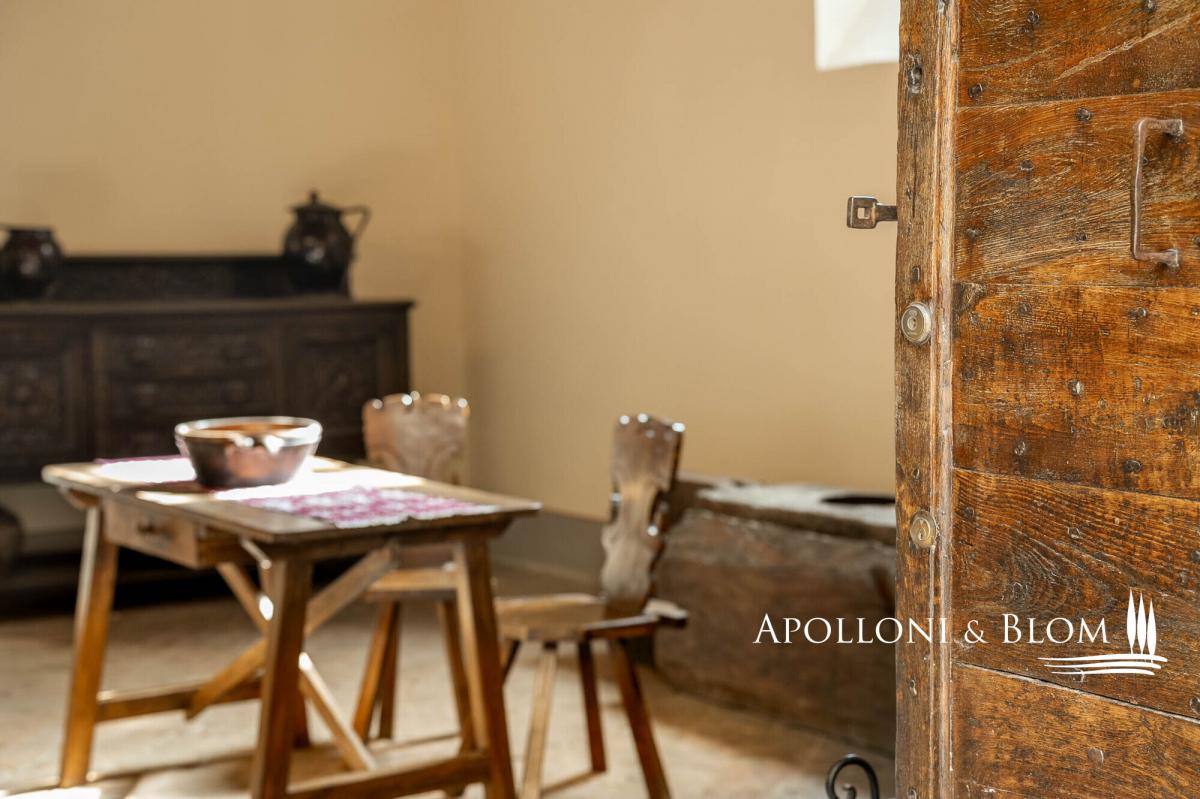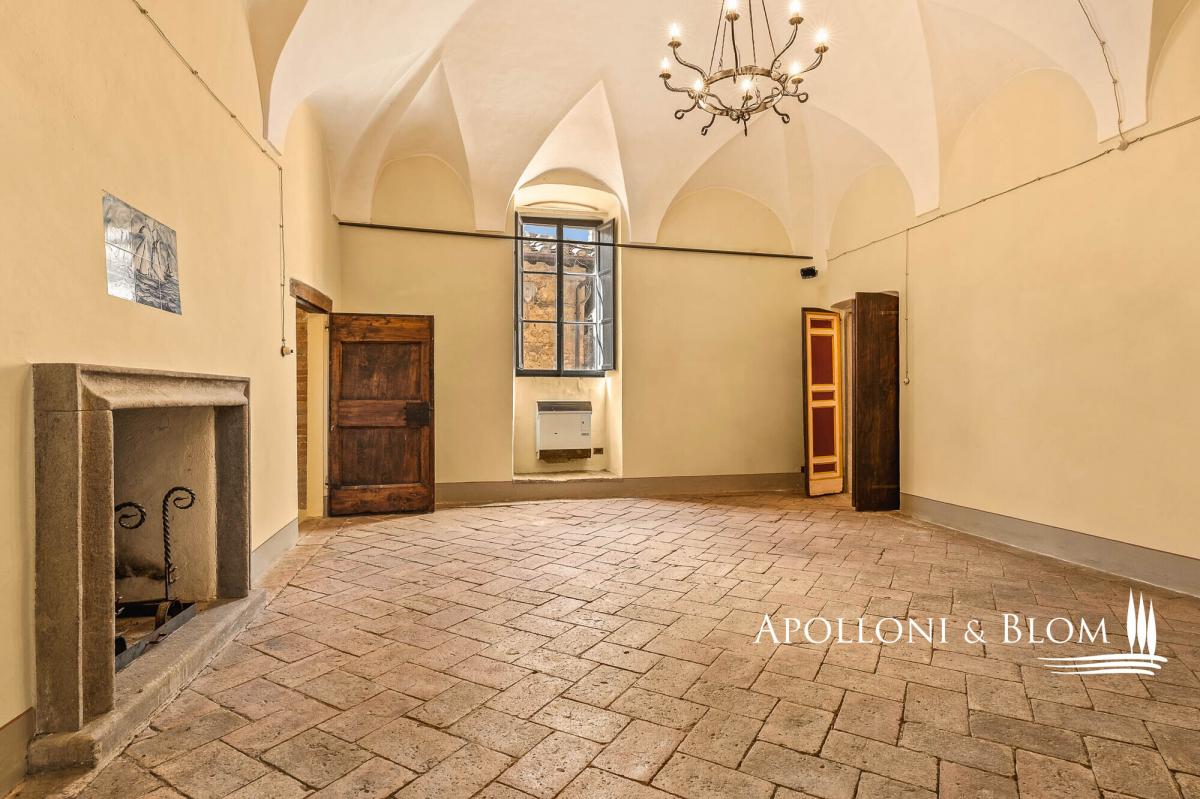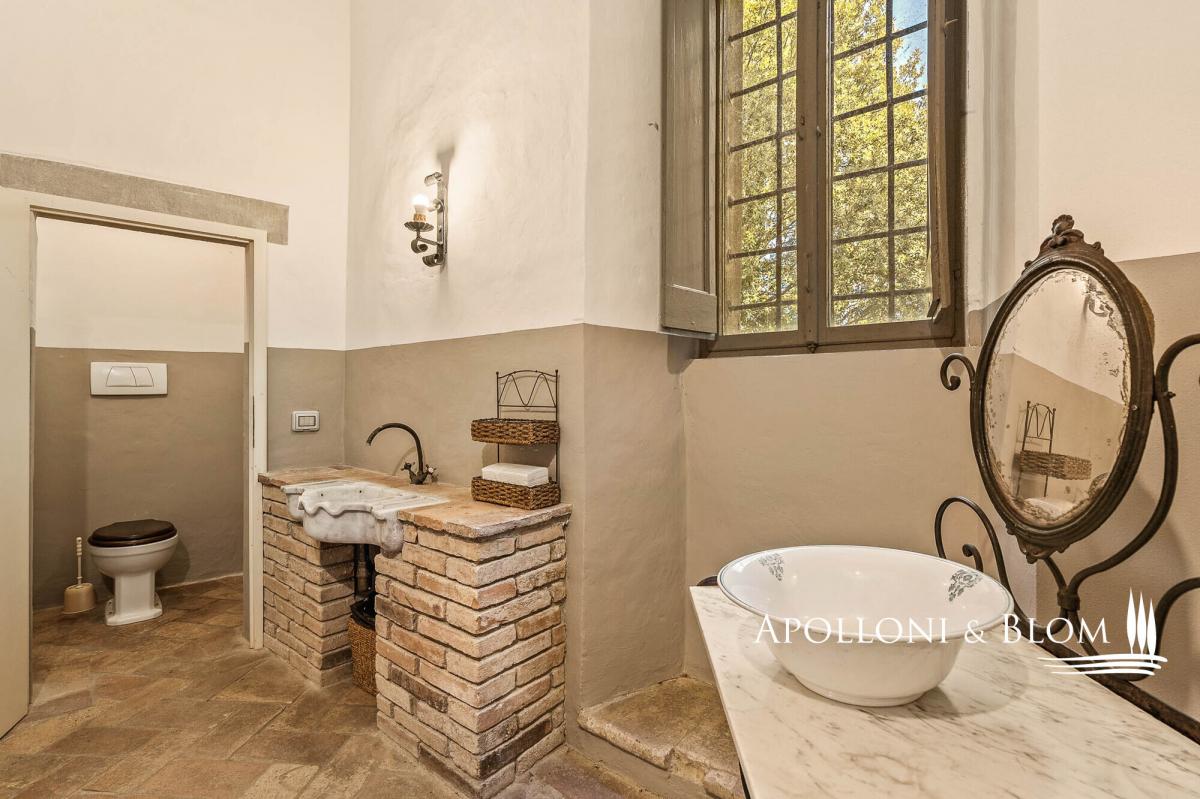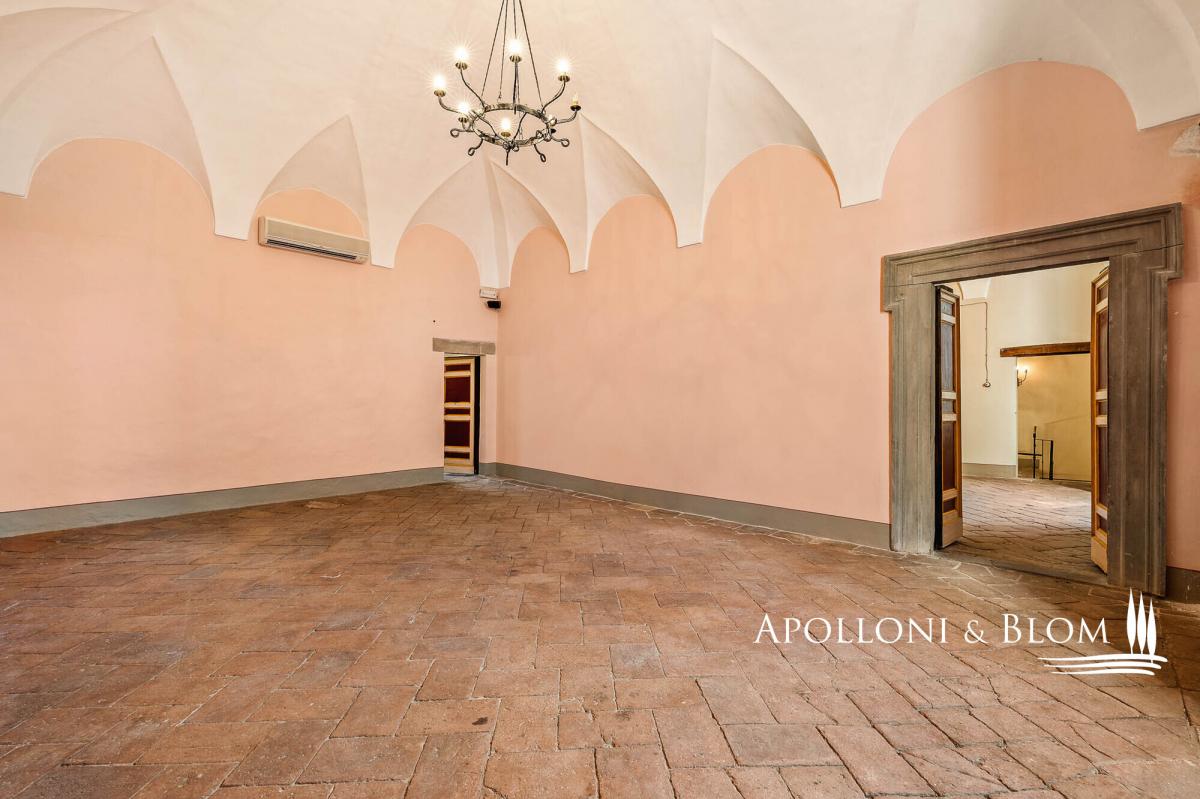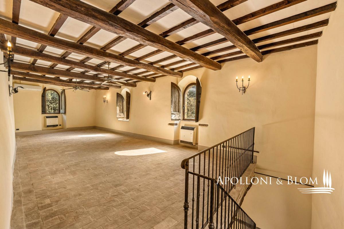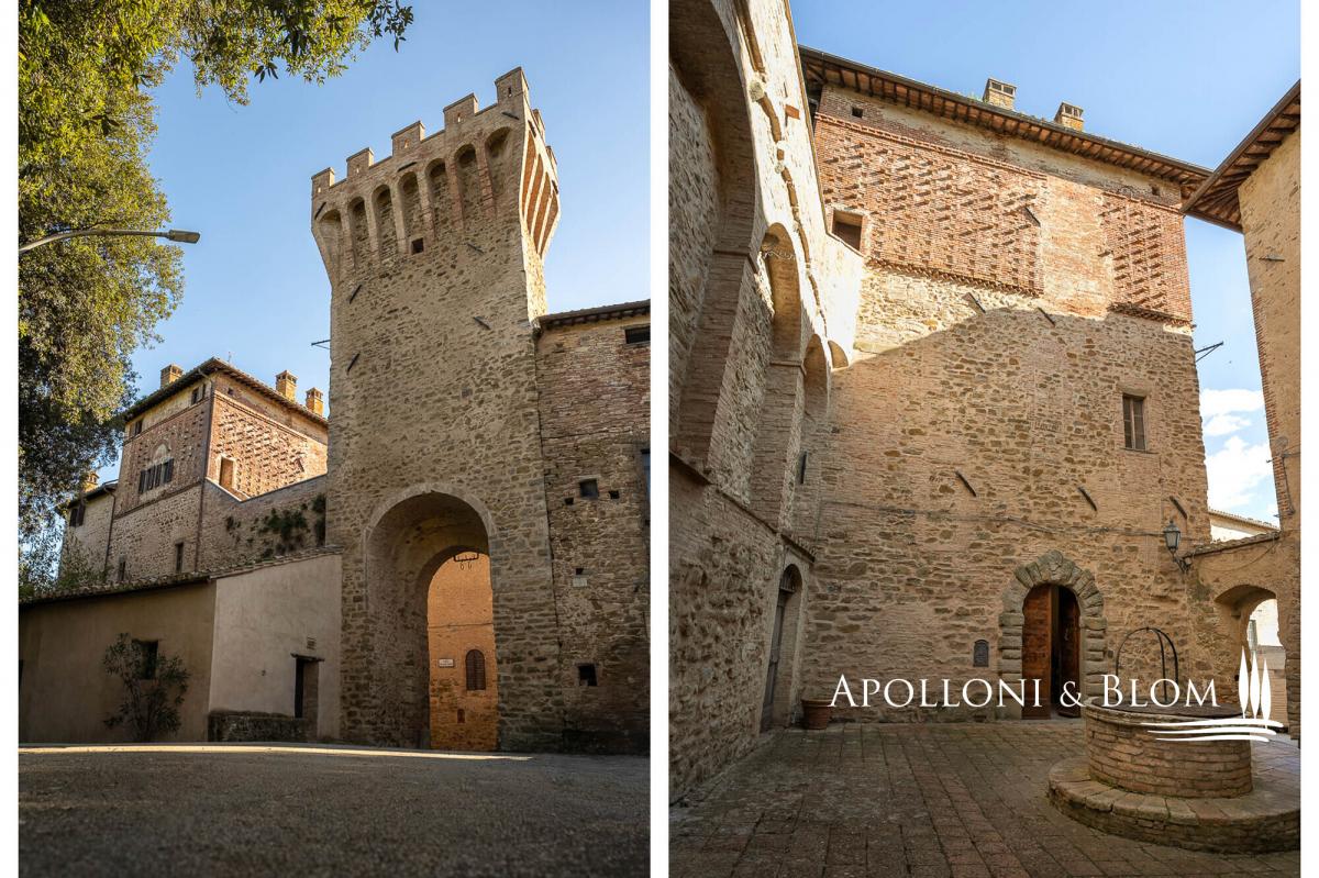 Unique 75-hectares estate with vineyards and olive grove, starring a residence in a late 10th-century castle including wall walkway, tower, grand halls, and a farmhouse to be restored, for sale in Umbria, near Perugia. Set amidst 75 hectares (185 acres) of pristine Umbrian countryside, south of Perugia, rises this timeless residence: a medieval castle, founded at the end of the 10th century and continuously inhabited ever since. This unique residence unfolds across more than 1,575 square metres and five levels in the principal wing of the castle, crowned by a 13th-century tower with its distinctive battlements and walkway. The interiors comprise over 50 rooms, including grand reception halls, ballrooms, vaulted ceilings, handmade terracotta floors, and stone fireplaces carved with noble family crests. On the first floor, a 60-sqm terrace offers breathtaking views of the surrounding landscape. This level also hosts two expansive salons, a kitchen with a fireplace, a study, and four bedrooms, each with en suite bathroom. The second floor features another elegant salon, a second kitchen, two additional en suite bedrooms, a study, and access to the historic tower and panoramic walkway along the castle walls. The top two levels house a spacious attic, truss beam ceilings, a study, and three further rooms, ideal as ateliers or bedrooms with sweeping views. On the lower ground floor significant Etruscan remains are still preserved, a further testament to the site’s millennia-old origins. Outside, a 4,250 sq m garden with mature trees and a charming bamboo grove enhances the sense of privacy and natural elegance. The estate is surrounded by 75 hectares of agricultural land, including vineyards with Colli del Trasimeno designation, century-old olive groves, arable land, forest, and a natural truffle reserve. Just a short walk from the castle’s main entrance and set in a commanding position, a stone-and-brick farmhouse of approximately 450 sqm is included to be restored into a private villa or boutique hospitality project, with uninterrupted views of the castle. A truly unique estate that effortlessly blends history, charm and future potential, ideal for both agricultural and hospitality development. A place that continues to tell its story, ready for new ones to begin. Contact us to arrange a private viewing. PROPERTY Ref: PER3341 Location: Province: Perugia, Region: Umbria Type: 1575 sq m/16953 sq ft period residence, on five levels with a crenellated tower, walls with walkway, restored with impressive reception and banqueting halls, garden and woods, and 75 hectares/185 acres of private land with 590 sq m/6350 sq ft annexes to be converted, vineyards and olive groves Year of construction: 900 D.C Year of restoration: 2005 Conditions: excellent, some rooms need final decorations, annexes to be restored Garden/Land: 4250 sq m/1 4,250 sqm of formal gardens overlooking a 1.6-hectare (3.9 acres) forest with oak, holm oak, wild cherry and turkey oak. A bamboo grove; impluvium with connecting tunnel to the courtyard well. Surrounding the castle, 75 hectares/185 acres of agricultural land comprising irrigated arable land, coppice woodland, a truffle ground, olive groves and vineyards under the Colli del Trasimeno appellation. Terrace/Balcony: on the second floor, 60 sq m/645 sq ft panoramic terrace Parking: shaded outdoor 80-seat parking facility, with paved, illuminated access suitable for disabled guests Utilities: Fixed telephone network: available Internet: available Heating: methane + LPG + wooden fireplaces Water: mains city supply + 1 well and rainwater collection tank for irrigation use + a 30-year concession for irrigation use from the Nestòre River, which borders the estate Electricity: available Waterwaste: mains city connection/ Imhoff tank Distance from services: 1.5km Distance from main airports: Perugia 31.5km, Florence 174km, Rome 195km Layout: Basement: entrance hall, 1 hall for events and banquets, kitchen, 3 bathrooms, utility room Ground Floor: 4 reception rooms, study, 2 storage rooms, 2 bathrooms, oven, laundry room, dressing room, kitchen with goods lift First Floor: 60 sq m/645 sq ft terrace, living room, dining room, kitchen with antique fireplace, 1 study, 4 bedrooms, 4 bathrooms, storage room Second Floor: living room, kitchen, 1 bedroom/study with access to the tower with walkway on the walls and spiral staircase, 2 bedrooms, 2 bathrooms, storage room, technical room in the attic Third Floor: 50 sq m/538 sq ft penthouse with truss, study/bedroom Turret Floor: 2 rooms (former water tanks) and connecting staircase Annexes: a 450 sq m/4843 sq ft two-story farmhouse to be restored, stone and brick building with a loggia; a 140 sq m/1506 sq ft building for agricultural use to be converted- garden