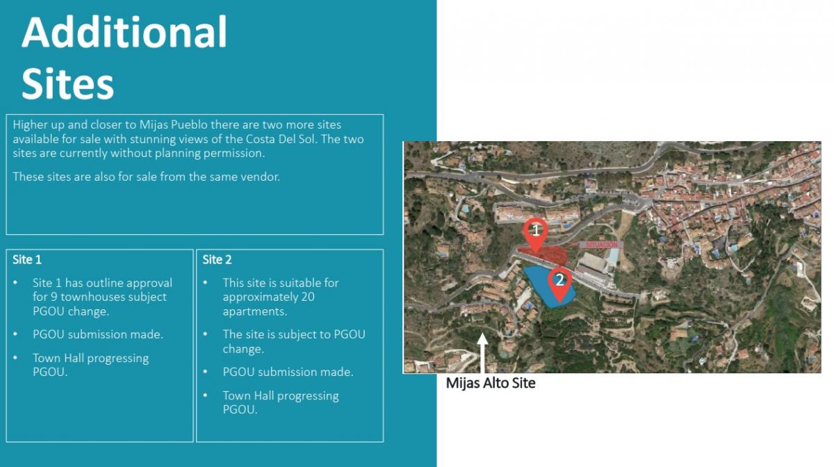 Serious Development Opportunity in Mijas Pueblo, Malaga, Spain For more detailed information on this amazing project, you can also contact Shay Moran directly at shaydmoran@gmail.com Euroresales Property iD - 9826017 Full Property Address: Huerto Los Naranjos, Mijas Pueblo, Mijas Malaga Andalucia Spain Property Overview Mijas Alto is a serious investment opportunity only 5 minutes from Mijas Pueblo. Plans are firmly in place to build a variation of two-bedroom, three bedroom and penthouse apartments. The principal will deliver his team of advisers who will bring the project to a successful conclusion. The project offers a high return for an investor when constructed or it could be held as a rental income stream in the ever expanding and buoyant rental market, thanks to its spectacular location. Mijas Pueblo is just 15 minutes away from the area's famous beaches and bars. The area has long been renowned as a golfer's paradise, and this property is surrounded by many of the area's beautiful courses such as La Cala, Mijas Golf Course, Santana and many more. This location is also the perfect base from which to discover many of Spain's other fascinating areas such as Puerto Banus, Marbella, Malaga. Property Details/Features DEVELOPMENT OPPORTUNiTY 6,678 m2 of development land with planning applied for 30 apartments across 4 blocks. Planning permit in process for 8 x Penthouses, 14 x 2 Bedroom & 8 x 3 Bedroom units. All properties will have car parking, storeroom and gym access. LOCATiON Situated in Los Naranjos Mijas Pueblo - 5 mins Airport - 20 mins Beach - 15 mins Golf Courses - 15 mins THiNGS TO DO Golf - 12 Courses Hiking Trails - Picos De Mijas Water sports White Sandy Beaches Dine Out - 100+ Restaurants Flamenco Dancing Granada - 1.5 Hours Sierra Nevada - 3 Hours NEARBY AMENETiES Hospitals Schools Community & First Aid Centres About the area The white capital of the burro-taxi. The municipality of Mijas in the Costa del Sol is one of the most beautiful villages in Andalucia, a village nestled in the mountains keeping the typical charm of the white Andalusian villages. The beautiful picture of endless white houses climbing up the slopes of the Sierra de Mijas, in contrast to the deep green of the pines, offers one of the most recognizable and picturesque images of Andalucia. The village consists of three urban centres which are: Mijas Pueblo, located at the foot of the homonymous Sierra at 430 meters above sea level, Las Lagunas, which is the modern part of the town along Fuengirola, and La Cala, located on the seafront with more than 12km of coastline. There the town offers a great number of beaches for all tastes. However, Mijas village, remains the major focus of attraction for national and international tourists because of its typical Andalusian white village beauty. Contact Euro Resales Ltd to book an inspection