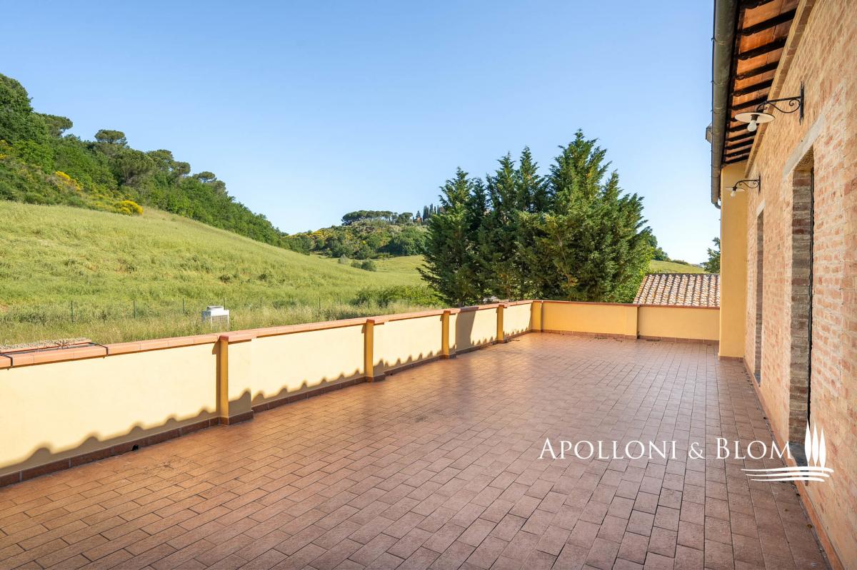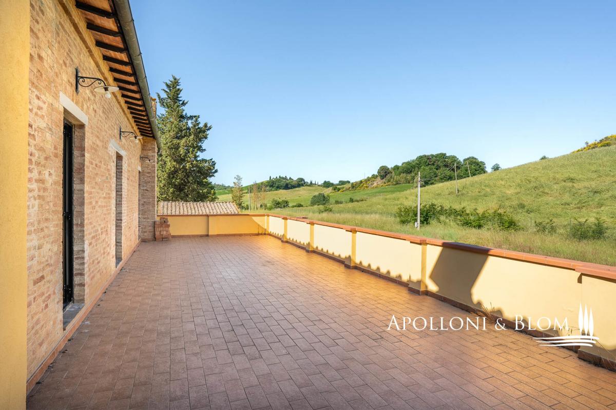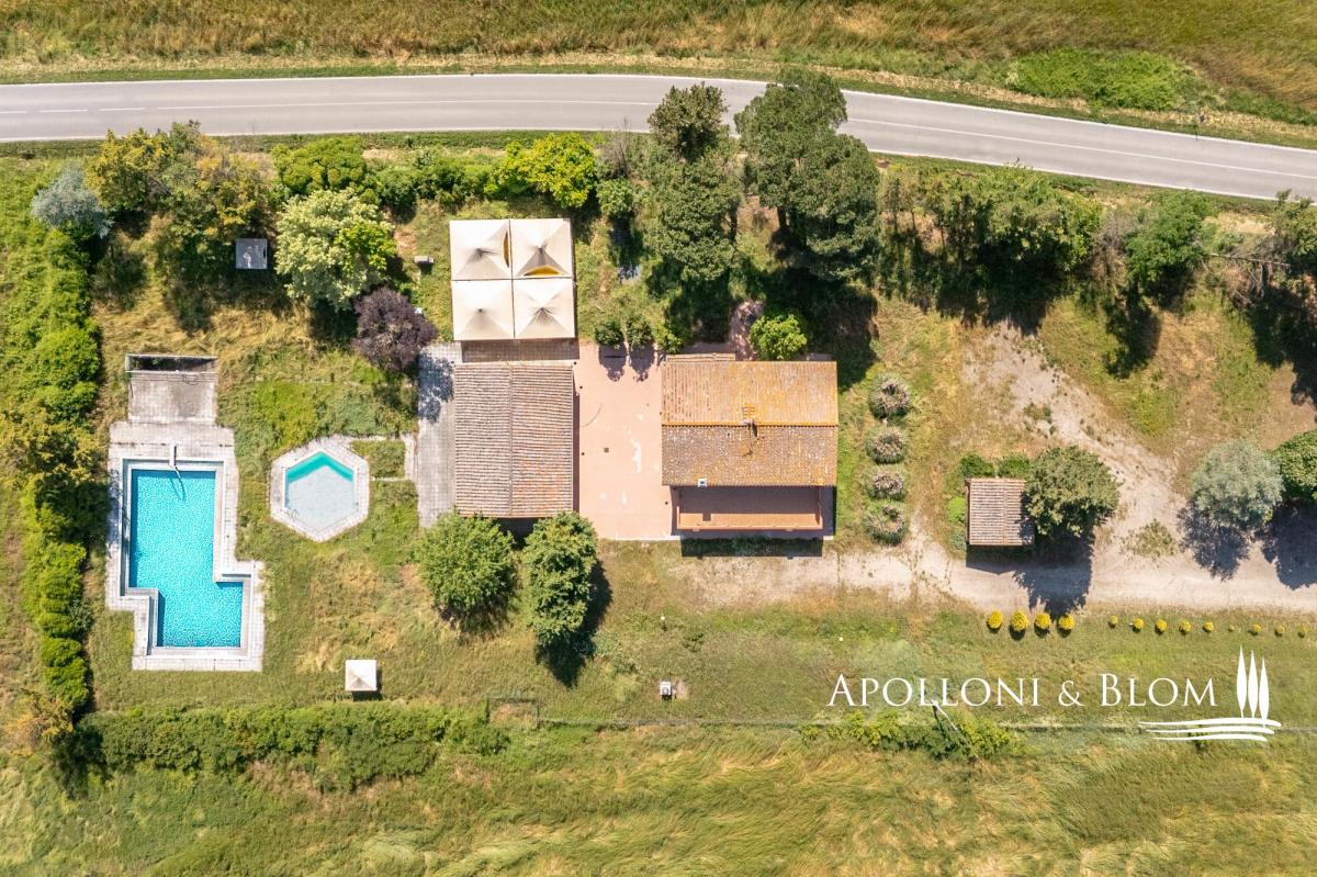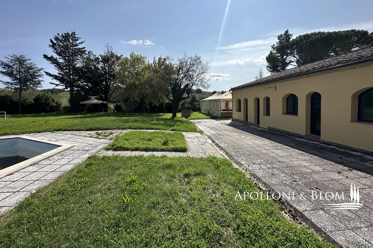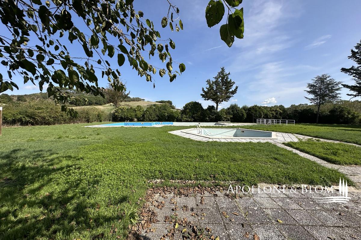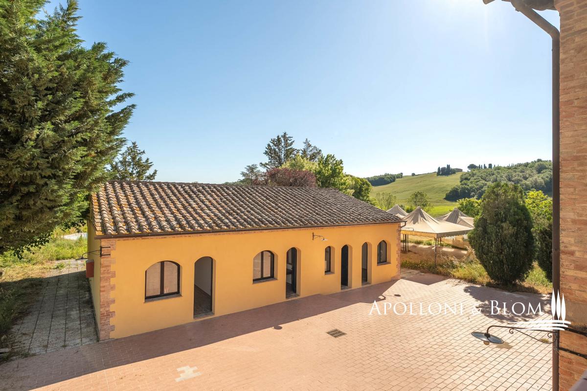 Great opportunity to tailor your Tuscan retreat, casale and annexes, pool, and scenic views for sale near Montalcino. Just a short drive from the iconic town of Montalcino and its world-renowned Brunello vineyards, this characterful Tuscan estate enjoys a privileged position on a private 3.5-hectare (8.6-acre) plot with sweeping views of the castle of San Giovanni d’Asso. Set within the gently rolling hills of one of Tuscany’s most alluring regions rich in truffle reserves, the property combines rural life style and excellent accessibility. Originally converted in 2003 from a 19th-century farmhouse into a boutique agriturismo with 15 en-suite bedrooms, the estate has since ceased commercial operations and now awaits a thoughtful restoration. It presents exceptional potential to be reimagined as a private luxury villa with guest accommodation, a refined countryside retreat, or a bespoke hospitality venture. The main residence is a classic two-storey country house, offering elegant living spaces and a former professional kitchen on the ground floor. The upper level features seven bedrooms, all with en-suite bathrooms, and some with direct access to a panoramic 60 sq m/645 sq ft terrace. A traditional terracotta courtyard, perfect for al fresco dining and entertaining, connects the main house to a charming guest cottage. This annex includes eight ground-floor bedrooms, each with its own en-suite bathroom, air conditioning, and distinctive arched windows and doors that fill the interiors with natural light. Behind the cottage lies a second terracotta-paved area, formerly used as a vibrant event space. Equipped with an open-air marquee, it can comfortably host gatherings of up to 50 guests. The garden is home to a pool area, featuring an L-shaped swimming pool alongside a smaller hexagonal pool. Set apart from the main buildings, a traditional barn with exposed brickwork known as "salti di gatto" offers excellent potential for conversion. Utilities include a heat pump system and a dedicated technical room, ensuring a sustainable foundation for future upgrades. The garden is fully fenced, gated and driveway. With its captivating views, generous layout, and outstanding potential for renovation or personalisation, this estate offers a fantastic opportunity to fully experience the timeless charm and lifestyle of Tuscany. PROPERTY Ref: MON3366 Location: San Giovanni d’Asso, Municipality: Montalcino, Province: Siena, Region: Tuscany Energy Efficiency Rating: B Type: 817 sq m/8,794 sq ft former farmstead including a two story country house with 7 bedrooms, a 8-bedrooms one level cottage, a barn and technical room, surrounded by 3.5 hectares/8.6 acres of private land with garden and 2 swimming pools Year of construction: 1800 Year of restoration: 2003 Conditions: in need of updating and re-style Land/Garden: on a 3.5 hectares/8.6 acres private plot, including 0.9 ha/2.2 acres of fully fences garden with driveway, 1.46 ha/3.6 acres of arable land and 1.1 ha/2.71 acres of forest Terrace/Balcony: 100 sq m/1,076 sq ft terracotta paved courtyard + a paved area with gazebo and a 60 sq m/645 sq ft terrace on the first floor Swimming pool: 1 L-shape pool + 1 smaller size hexagonal shape pool Utilities: Fixed telephone network: available Internet: available Heating: LPG + heat pump system fitted with hot/cold air splits Water: mains city supply Electricity: available Water waste: mains city connection/ Imhoff tank Air conditioned Distance from services: San Giovanni d'Asso 2 km/1.2 miles Distance from main airports: Firenze 134 km/83 miles, Pisa 160 km/99 miles, Roma Fiumicino 240 km/149 miles Layout: 1. Country House 607 sq m/6,533 sq ft Ground Floor: entrance with foyer, 2 dining rooms, office, 5 toilets, kitchen, technical room First Floor: 4 double bedrooms with ensuite bathrooms and access to the terrace, 3 further double bedrooms with ensuite 2. Dependance 175 sq m/1,883 sq ft - Ground Floor: 8 double bedrooms with ensuite bathrooms 3. Single barn 30 sq m/322 sq ft on one level with deposit/garage 4. Technical room- garage