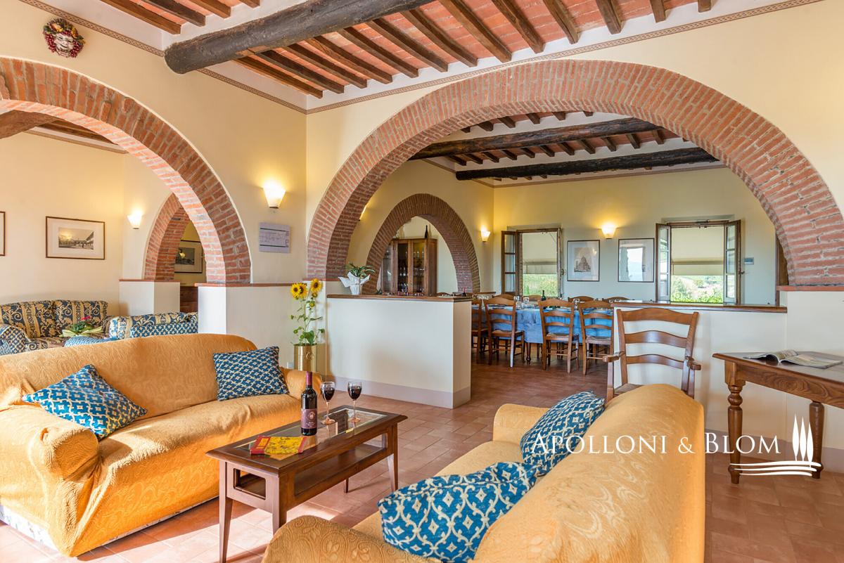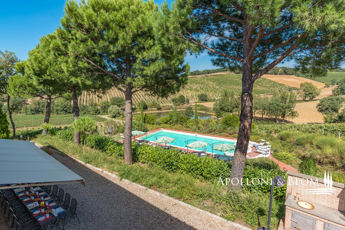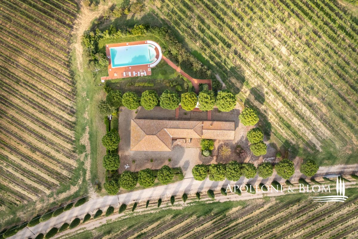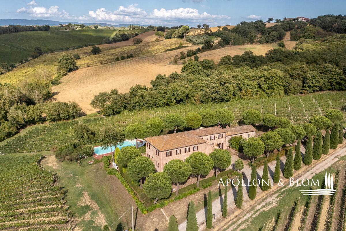 Hilltop position with endless views, agricultural land with vineyards, renovated farmhouse with pool, ready to move into, for sale in Montepulciano. Commanding a privileged hilltop position above the Valdichiana, this distinguished historic country villa offers an exceptional expression of Tuscan living. Approached by a stately cypress-lined avenue that winds gracefully to the crest of the hill, the property opens to uninterrupted, panoramic views that sweep across the rolling vineyards, medieval hilltop towns, and the distant Umbrian hills. With its timeless architecture, restored with exacting care, and its 6 hectares of private land, this is a property that embodies both rural authenticity and refined comfort. The villa extends 535 square metres over two levels, restored with traditional brick and stone façades, classic wooden shutters and surrounded by manicured gardens shaded by mature pines and aromatic hedges. The restoration combines the rustic charm of hand-crafted terracotta floors, high beamed ceilings and brick arches with the discreet presence of modern comforts such as air conditioning and double-glazed windows. The ground floor is arranged around an impressive reception hall, where four great brick arches frame a sequence of inviting sitting and dining areas, creating an atmosphere of convivial elegance. The adjoining kitchen opens directly onto the garden and a shaded dining terrace, perfectly positioned for al fresco entertaining with enchanting views over the swimming pool and the countryside beyond. From the garden, independent entrances lead to two guest bedrooms and a self-contained one-bedroom apartment, ideal for visiting friends or staff accommodation. On the upper level, four further double bedrooms, each distinguished by warm natural light, and far-reaching views over the vineyards and the Valdichiana. All 8 bedrooms enjoy ensuite bathrooms, four fitted with Jacuzzi. The landscaped grounds, graced by a swimming pool framed with terracotta sundeck, provide a seamless connection to the surrounding hills. Here, 3 hectares of productive vineyards produce the prestigious Rosso di Montepulciano DOC from Sangiovese grapes, along to the 3-hectare forest. Perfectly positioned within minutes of Montepulciano, Cortona and Lake Trasimeno, and just 20 minutes from the A1 motorway, the property enjoys excellent accessibility without compromising its secluded charm. It stands as an ideal private residence or as an exclusive retreat offering guests the quintessential Tuscan experience – fine wine, timeless landscapes and an atmosphere of effortless elegance. PROPERTY Ref: MTP3110 Location: Montepulciano, Province: Siena, Region: Tuscany Type: 535 sq m/5758 sq ft two-story country house with swimming pool, landscaped garden and agricultural land with vineyards Annex: 21 sq m/226 sq ft technical room Year of construction: 1500 Conditions: excellent Land/Garden: a total of 6,8 hecaters of private land including 3500 sq m/0.8 acres of landscaped garden featuring tall pine trees and cypress, aromatic shrubs, barbecue area and outdoor masonry kitchen, along with a further 6 hectares/14.8 acres of agricultural land, including 3 hectares/7.4 acres of vineyard producing Rosso di Montepulciano DOC and 3 3 hectares/7.4 acres of woodland Swimming pool: 10x5m with Roman-style steps and a 5x3.5 m Jacuzzi, terracotta-paved sundeck and access paths, offering enchanting views over the vineyards Utilities: Fixed telephone network: available Internet: available Heating: LPG Water: arthesian well for domestic and irrigation use Electricity: available Air conditioned Water waste: Imhoff tank Distance from services: 2,5 km Distance from main airports: Perugia 80 km, Firenze 140 km Layout: Ground Floor: large living hall with 4 arches, live-in kitchen, 1 guest toilet and 1 storage room; with separate access from the garden: 2 bedrooms with en-suite bathrooms, 1 storage/cellar room, and a 60 sq m/645 sq ft apartment comprising living room with fireplace, kitchen, 1 bedroom and 1 bathroom with Jacuzzi First Floor: accessed via external staircase, 4 bedrooms each with en-suite bathroom- garden