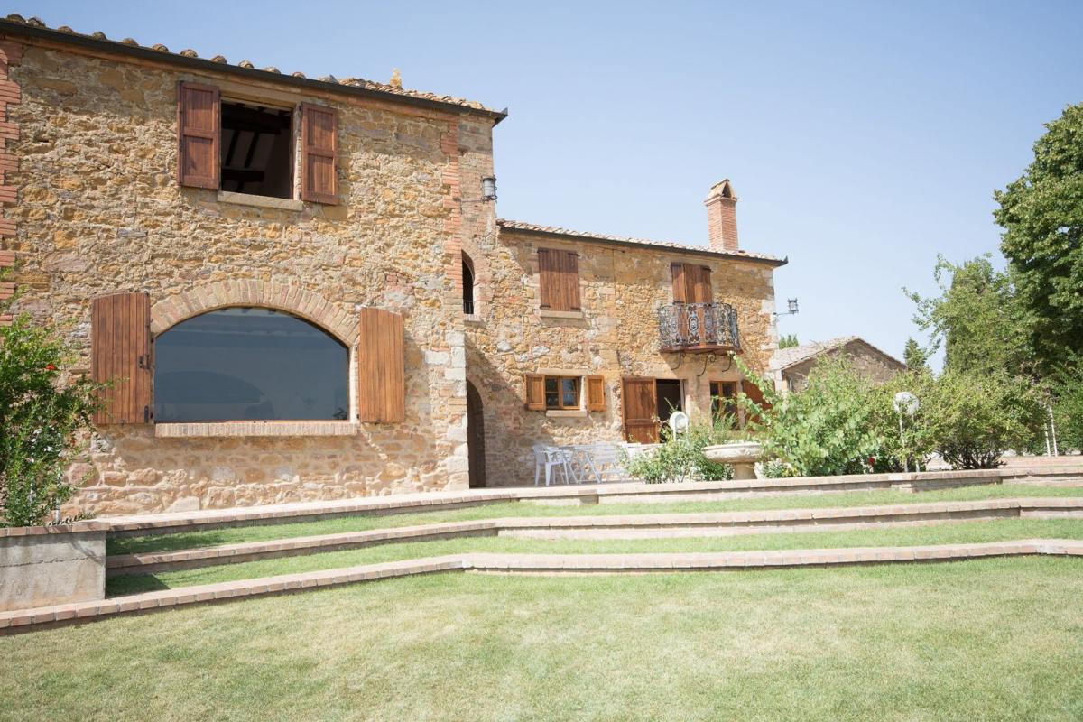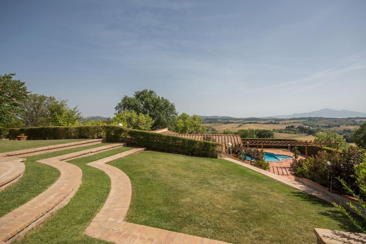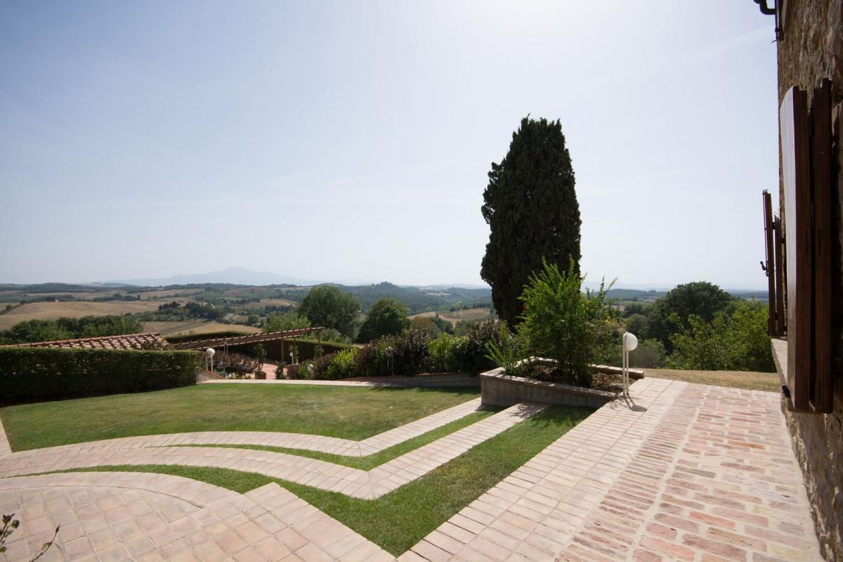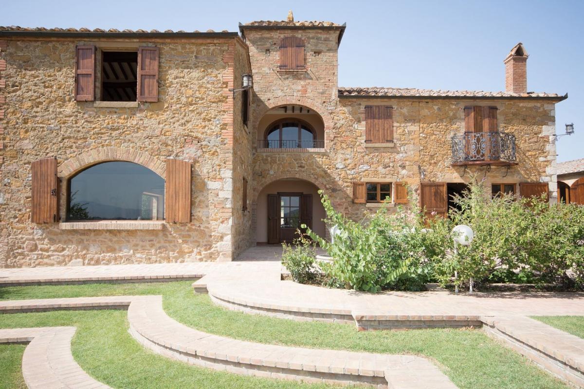 19th-century stone country house, two guest cottages, garden with pool, agricultural annexes and farmland for sale close to Pienza and Montepulciano. In the hilly region across Val d'Orcia and Valdichiana, south of Siena, between Pienza and Montepulciano, on 3.8 hectares of private land, Casale Montecchi is a former two-story farmhouse dating back to the 19th-century entirely renovated in 2017 preserving its natural stone facades, loggias, arches and a rooftop turret and housing a charming rustic Tuscan style country residence with living areas boasting traditional fireplaces, exposed wood-beam ceilings, majestic brick arches. On the first floor a master bedroom with access to a balcony has a bathroom entirely clad in marble with double sinks, bathtub and shower, wardrobe room, joined by three additional bedrooms and two bathrooms. All fixtures are double-glazed with classic wood frames, every room enjoys natural light, and grand windows open to panoramic views over the garden and the rolling hills of the Sienese countryside. The classic rustic style finishes the two guest cottages too, one set by the pool, both having two bedrooms, wide openings living areas and fireplaces. The garden was designed in brick terraces and lawn with steps leading to the pool. A shed/garage of more than 100 square meters, a second agricultural annex for storage use along with an olive grove complete Casale Montecchi, an enchanting estate in a quiet and private setting and yet close to all major art centers and amenities, ready-to-live with excellent finishes, just perfect to enjoy with family and friends or as income property and host travelers from all over the world for their vacations. PROPERTY Ref: MTP1445 Location: Montepulciano, Province: Siena, Region: Tuscany Type: 357 sq m/3842 sq ft country house with turret, two guest cottages of 270 sq m/2096 sq ft and 84 sq m/904 sq ft, swimming pool and garden, warehouse and garage buildings, land with olive grove and forest Land: 3.87 ha (9.58 acres) with garden designed with terraced areas, lawn, 3 ha (7.4 acres) olive grove, 0.49 ha arable land, and 0.3 ha woodland Swimming Pool: panoramic, 14x7 m with Roman-style staircase and terracotta-paved sundeck Utilities: Fixed telephone line: available Internet/Wi-Fi: available Heating: LPG (gas) Water: mains city supply + 1 well Electricity: connected Distance to amenities: 2 km/1 mile Distance to main airports: Florence 130 km/81 miles, Perugia 80 km/50 miles, Rome 250 km/155 miles Gravel Road: 250 m/820 ft private driveway Layout: Main country house 357 sq m/3842 sq ft: Ground floor: entrance hall, living room, hallway, 1 bathroom, 1 storage room, dining room, kitchen First Floor: hallway with access to terrace, 1 master bedroom with balcony and en suite bathroom, 3 bedrooms, 2 bathrooms Second Floor: attic Dependence 1 - 270 sq m/2906 sq ft Ground floor: entrance hall, living room, kitchen, 1 bedroom with en suite, 1 bedroom,1 bathroom, storage, cellar, wood stove First floor: technical room Dependence 2 - 84 sq m/904 sq ft Ground Floor: entrance, dining room, kitchen, storage room, 2 bedrooms, 1 bathroom, pool service rooms Year of renovation: 2017 Condition: excellent- garden