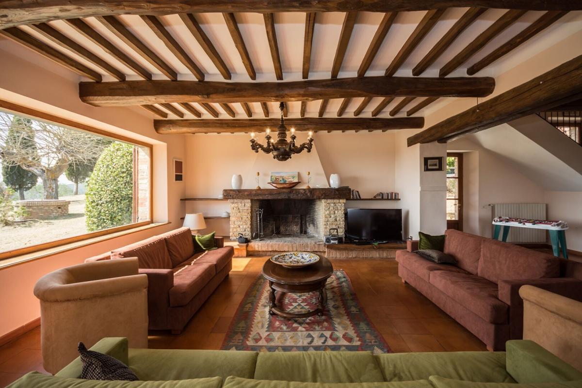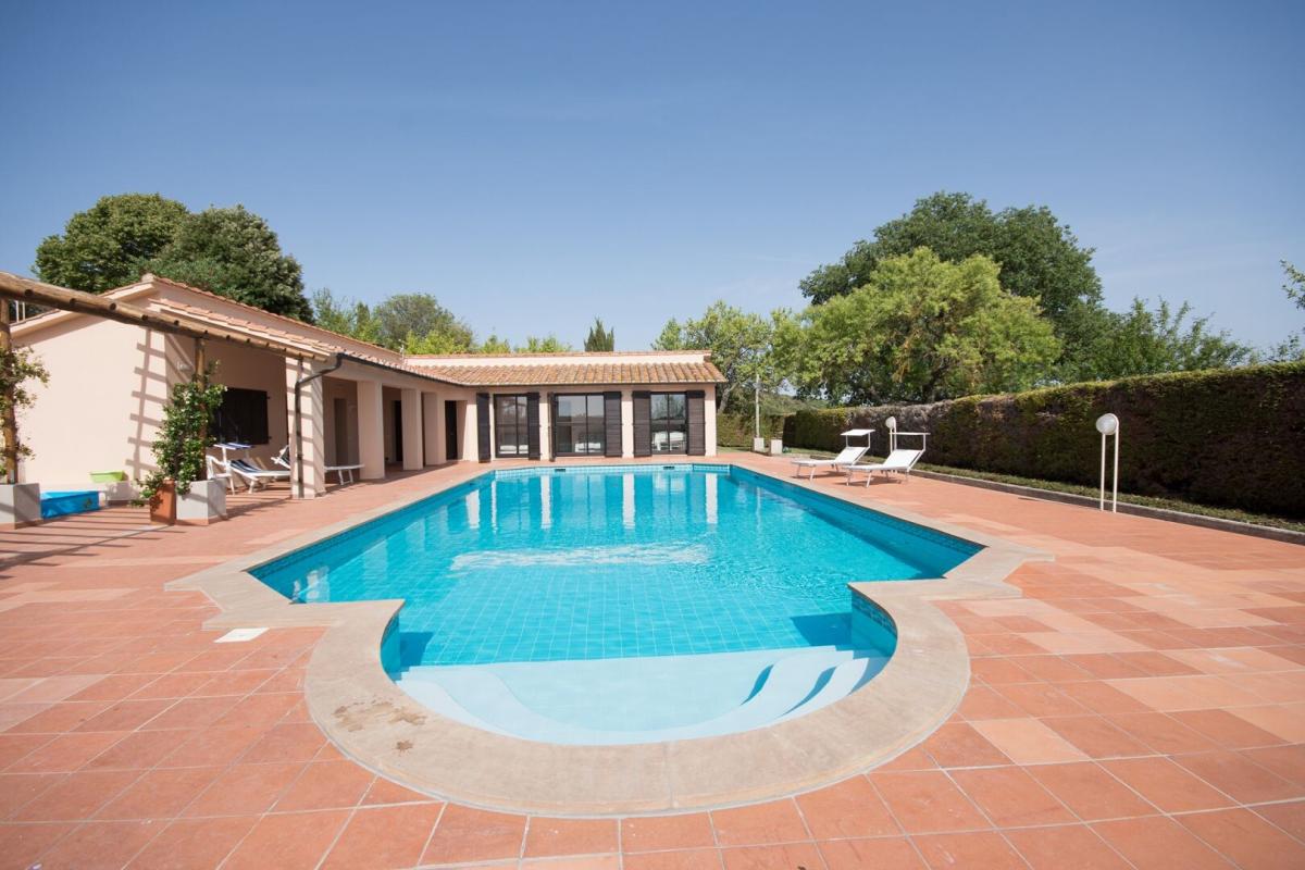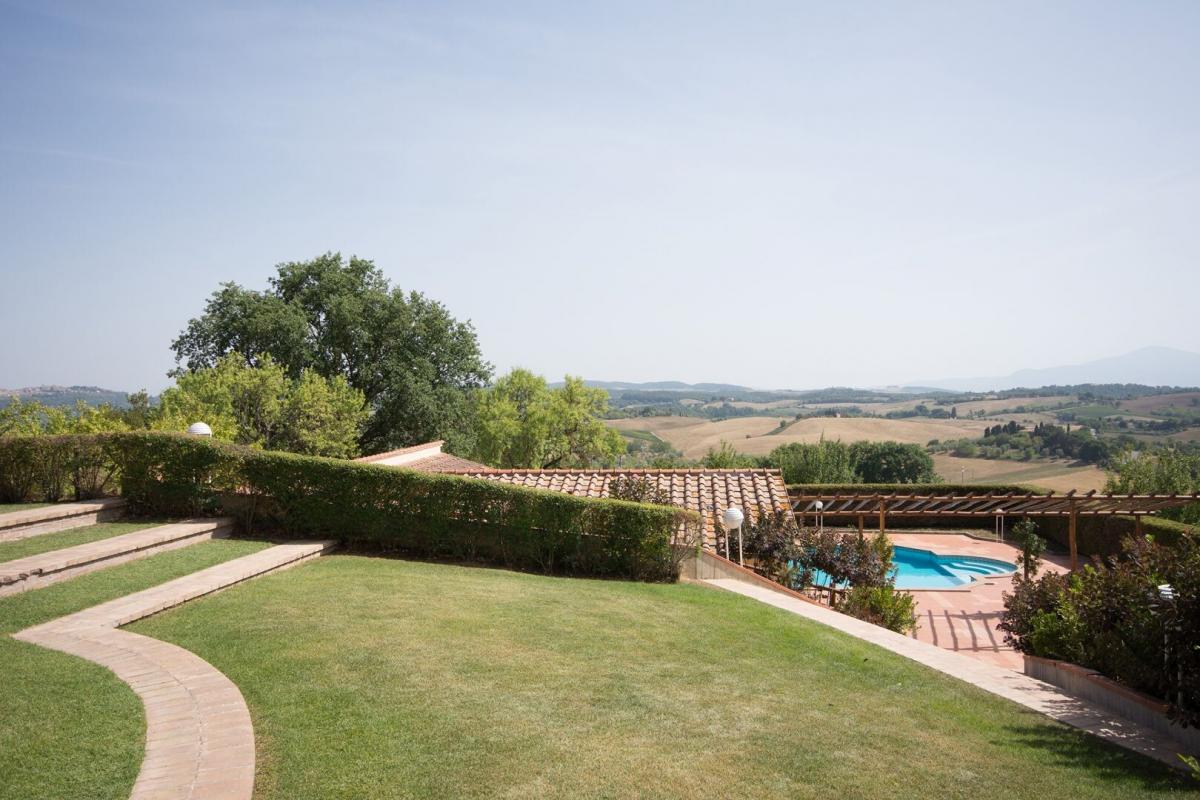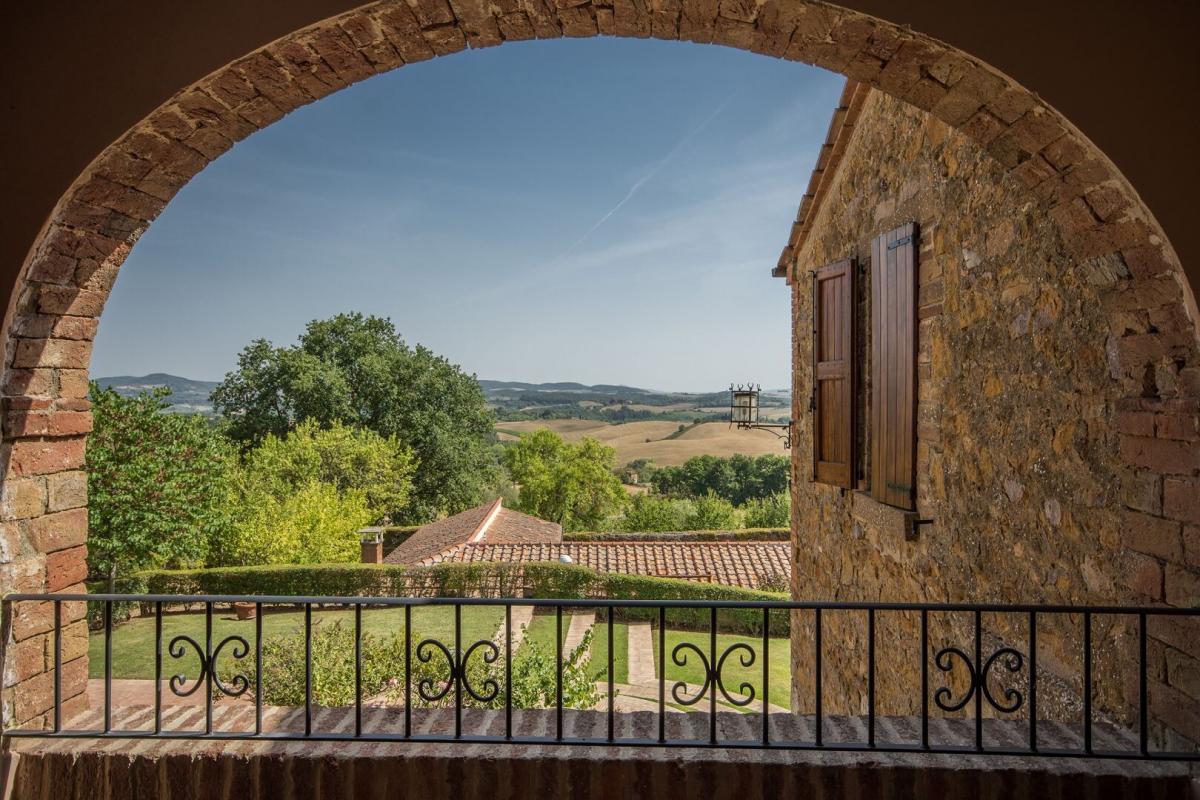 19th-century stone country house, two guest cottages, garden with pool, agricultural annexes and farmland for sale close to Pienza and Montepulciano. In the hilly region across Val d'Orcia and Valdichiana, south of Siena, between Pienza and Montepulciano, on 3.8 hectares of private land, Casale Montecchi is a former two-story farmhouse dating back to the 19th-century entirely renovated in 2017 preserving its natural stone facades, loggias, arches and a rooftop turret and housing a charming rustic Tuscan style country residence with living areas boasting traditional fireplaces, exposed wood-beam ceilings, majestic brick arches. On the first floor a master bedroom with access to a balcony has a bathroom entirely clad in marble with double sinks, bathtub and shower, wardrobe room, joined by three additional bedrooms and two bathrooms. All fixtures are double-glazed with classic wood frames, every room enjoys natural light, and grand windows open to panoramic views over the garden and the rolling hills of the Sienese countryside. The classic rustic style finishes the two guest cottages too, one set by the pool, both having two bedrooms, wide openings living areas and fireplaces. The garden was designed in brick terraces and lawn with steps leading to the pool. A shed/garage of more than 100 square meters, a second agricultural annex for storage use along with an olive grove complete Casale Montecchi, an enchanting estate in a quiet and private setting and yet close to all major art centers and amenities, ready-to-live with excellent finishes, just perfect to enjoy with family and friends or as income property and host travelers from all over the world for their vacations. PROPERTY Ref: MTP1445 Location: Montepulciano, Province: Siena, Region: Tuscany Type: 357 sq m/3842 sq ft country house with turret, two guest cottages of 270 sq m/2096 sq ft and 84 sq m/904 sq ft, swimming pool and garden, warehouse and garage buildings, land with olive grove and forest Land: 3.87 ha (9.58 acres) with garden designed with terraced areas, lawn, 3 ha (7.4 acres) olive grove, 0.49 ha arable land, and 0.3 ha woodland Swimming Pool: panoramic, 14x7 m with Roman-style staircase and terracotta-paved sundeck Utilities: Fixed telephone line: available Internet/Wi-Fi: available Heating: LPG (gas) Water: mains city supply + 1 well Electricity: connected Distance to amenities: 2 km/1 mile Distance to main airports: Florence 130 km/81 miles, Perugia 80 km/50 miles, Rome 250 km/155 miles Gravel Road: 250 m/820 ft private driveway Layout: Main country house 357 sq m/3842 sq ft: Ground floor: entrance hall, living room, hallway, 1 bathroom, 1 storage room, dining room, kitchen First Floor: hallway with access to terrace, 1 master bedroom with balcony and en suite bathroom, 3 bedrooms, 2 bathrooms Second Floor: attic Dependence 1 - 270 sq m/2906 sq ft Ground floor: entrance hall, living room, kitchen, 1 bedroom with en suite, 1 bedroom,1 bathroom, storage, cellar, wood stove First floor: technical room Dependence 2 - 84 sq m/904 sq ft Ground Floor: entrance, dining room, kitchen, storage room, 2 bedrooms, 1 bathroom, pool service rooms Year of renovation: 2017 Condition: excellent- garden