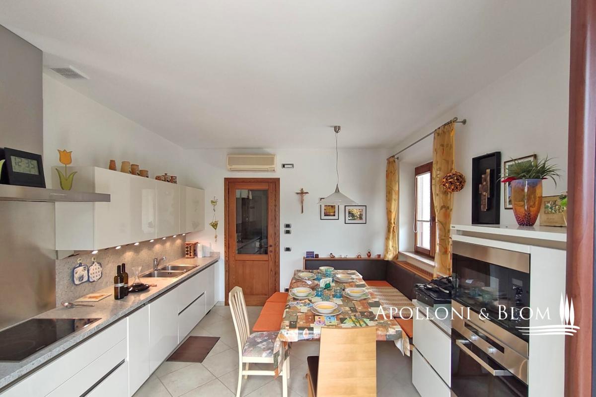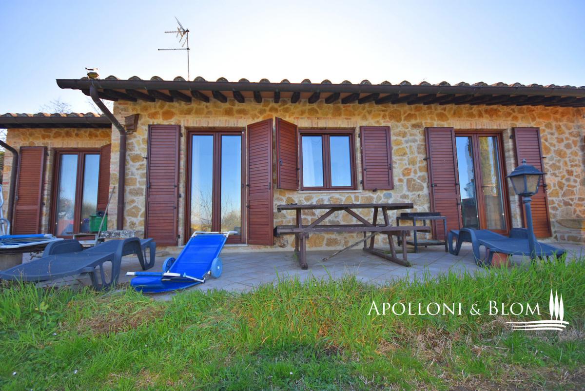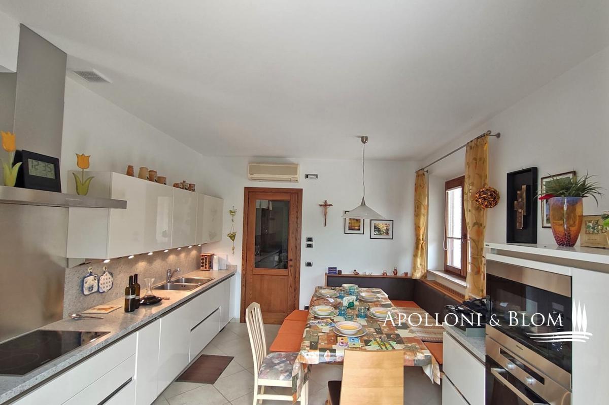 In a private setting with views, two-story single family villa with solar energy, double garage, garden and an olive grove for sale near Montepulciano. Set in a peaceful, elevated position amidst the rolling hills of the Tuscan countryside, this stone villa lies just minutes from the historic town of Montepulciano. Framed by olive trees and enjoying far-reaching rural views, the property offers both privacy and easy access to local amenities. Meticulously reconstructed in 2019 on the footprint of an original 19th-century farmhouse, the single family villa blends timeless Tuscan character with contemporary energy-efficient features and refined interiors. The living space spans approximately 159 square meters across two levels, thoughtfully designed to maximise comfort, natural light and indoor-outdoor living. On the main floor, a sitting room with fireplace and pellet stove leads to a bespoke Miele kitchen and dining area with direct access to the garden. Two bedrooms and two stylish bathrooms—one with a bathtub, the other with a shower—complete the floor. The lower level, accessible via an internal staircase, offers a second kitchen, a versatile room with skylight, an additional bathroom with shower, cellar, technical areas and a spacious double garage of approx. 44 square meters with private ramp. The landscaped garden of 1,560 square meters surrounds the house on all sides, featuring a stone-paved terrace ideal for al fresco dining beneath the Tuscan sun, and a barbecue. A typical 0.78 hectares of olive grove and a private well are also part of the property. Modern amenities include a photovoltaic system, LPG and pellet heating, air conditioning, and an advanced security system. Located just 1.2 km from daily conveniences, this is an exceptional opportunity to invest in the heart of Tuscany, whether as a primary residence or a stylish and low-maintenance second home. PROPERTY Ref: MTP3253 Type: 150 sq m/1711 sq ft stone family house with garden, double garage and land with olive grove Year of construction: fine 1800 Year of restoration: rebuilt in 2019 Conditions: excellent Land/Garden: 1560 sq m/0.43 acres garden with a paved area and barbecue, plus a 0.78 ha/1.9 acres of land with olive grove Parking: 44 sqm/473 sq ft basement garage suitable for 2/3 cars Utilities: Fixed telephone network: available Internet: available Heating: LPG + pellet stove + fireplace + solar energy for hot water Water: mains city supply + 1 well Electricity: available + photovoltaic system Water waste: Imhoff tank Air conditioning Alarm system Included MIELE kitchen complete with appliances Wooden parquet flooring in the bedrooms Location: Montepulciano, Province: Siena, Region: Tuscany Distance from services: 1,2 km Distance from main airports: Perugia 75 km, Florence 125 km Gravel road: 20 meters Layout: Ground Floor: entrance, living room with fireplace, fully fitted kitchen with dining area and French door opening onto the garden, 2 bedrooms, 1 bathroom with bathtub, 1 bathroom with shower Basement: hallway with internal staircase, 1 bathroom with shower, 1 room with skylight, second kitchen, storage room, technical room, crawl space, and garage- garage