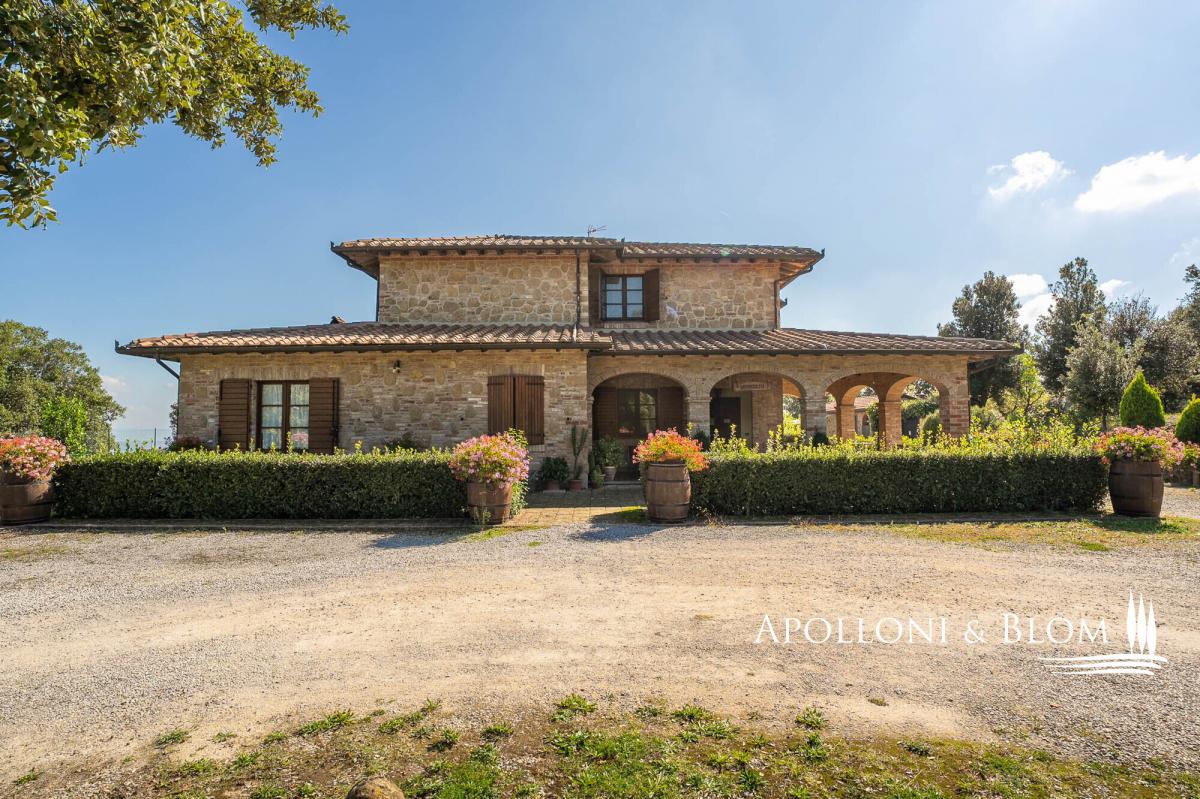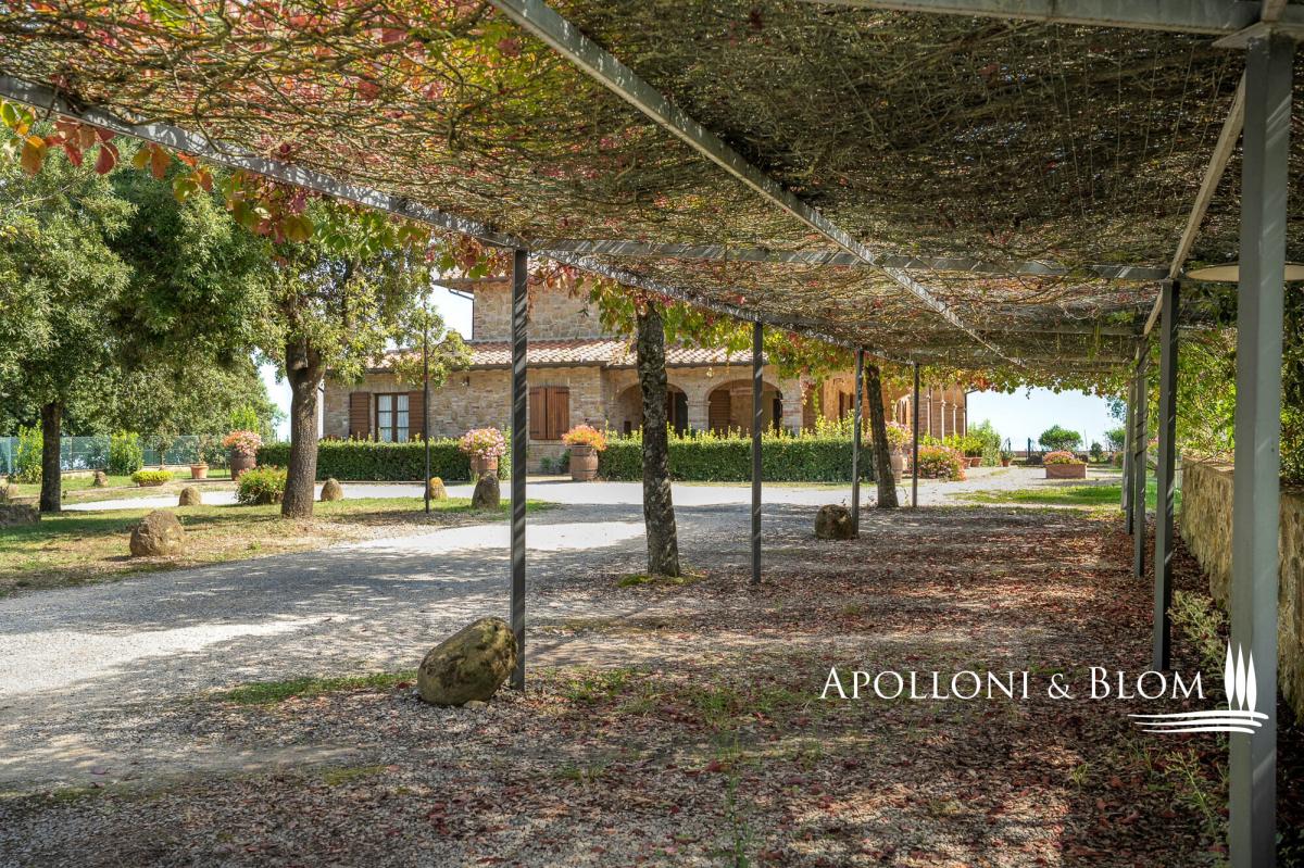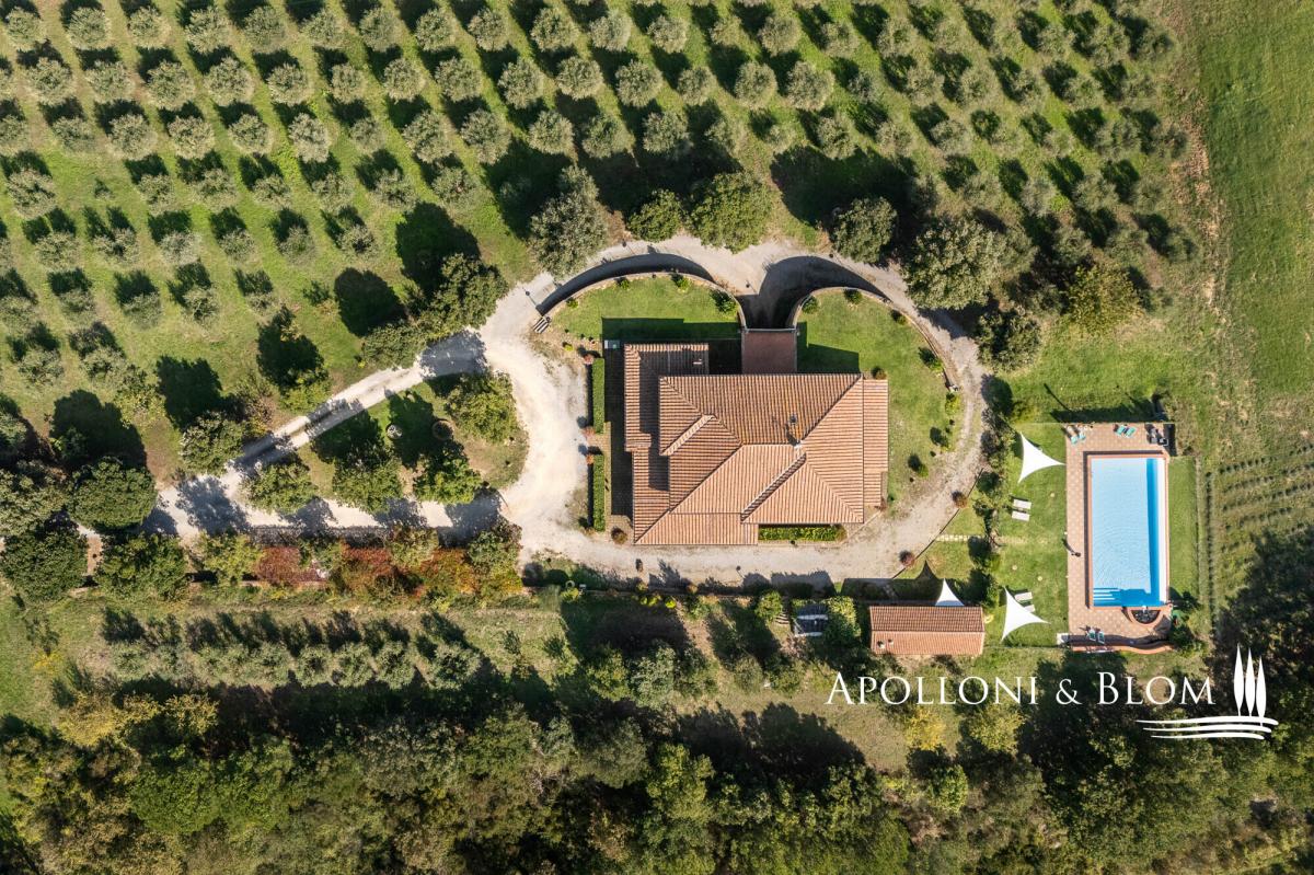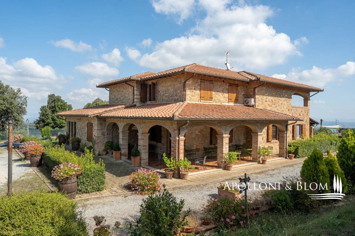 Hilltop dominant views over the Val d’Orcia, on 5.8 hectares of land, finely restored with swimming pool and guest quarters for sale in Montepulciano. Commanding a majestic hilltop position with sweeping views across the UNESCO-listed Val d’Orcia and Valdichiana, this exceptional country residence, set within 5.8 hectares (14.3 acres) of private land, is offered for sale just moments from the medieval splendour of Montepulciano. A rare opportunity to acquire an elegantly restored Tuscan estate, the property seamlessly blends traditional architectural features with refined modern comforts, all framed by the softly undulating landscape of southern Tuscany. Constructed in 2005, the main residence offers 579 square metres (6232 sq ft) of internal accommodation arranged over two floors in addition to a basement with cellar, storage, and utility rooms. The principal living quarters include multiple reception rooms, two kitchens, and six well-appointed bedrooms, each with en-suite bathroom, air conditioning, and bespoke detailing. A number of the guest suites benefit from private entrances and exclusive furnished terraces, allowing for greater privacy and direct engagement with the exceptional views. The house is set within a meticulously landscaped garden planted with mature olive and fruit trees, which gracefully encircle the panoramic swimming pool and sun deck, an inviting space that enjoys uninterrupted vistas over the surrounding countryside. Outdoor living is further enhanced by shaded dining areas and tranquil seating spaces, creating a seamless connection between architecture and nature. Complementing the main residence are two single-storey annexes, currently serving as additional storage but offering scope for further adaptation subject to the relevant consents. The wider estate encompasses a richly cultivated olive grove of 1.7 hectares (4.44 acres), featuring prized native varietals as Leccino, Frantoio, and Moraiolo, producing a distinguished DOP extra virgin olive oil. Additional land includes 2.4 hectares (5.94 acres) of arable terrain and an orchard, supporting both agricultural and recreational use. At present, the property successfully operates as a boutique agriturismo, offering a well-established income stream with high-end accommodation. However, the estate would lend itself equally well to transformation into a distinguished private residence or indeed a refined hospitality venture, capitalising on its unrivalled location near cultural jewels such as Pienza, Montalcino, and Bagno Vignoni. Discreet yet highly accessible, only 3 km (1.9 miles) from local amenities, this is an estate of rare character and enduring appeal, perfectly poised at the intersection of Tuscan tradition and contemporary rural luxury. PROPERTY Ref: MTP3327 Location: Montepulciano, Province: Siena, Region: Tuscany Type: 600 sq m/6458 sq ft country house on two levels with 16 rooms, currently run as a hospitality business, with annex and cellar Annex/es: one measuring 45 sq m and one of 16 sq m used as a storage room Year of construction: 2005 Conditions: good Land/Garden: 4,831 sq m/1.19 acres of landscaped garden, a total of 5.8 hectares/14.3 acres of agricultural land including 1,7 ha/4.44 acres olive grove in full production with Leccino, Frantoio and Moraiolo varieties, 2.4 ha/5.94 acres arable land, 367 sq m/0.09 acres of pasture 416 and sq m/0.10 acres of orchard Terrace/Balcony: 45 sq m/484.3 sq ft Swimming pool: 14x7m, panoramic with sundeck Parking: 5 outdoor parking spaces Utilities: Fixed telephone network: available Internet: broadband active Heating: LPG Water: mains city supply Electricity: available Water waste: Imhoff tank Distance from services: 3 km/1.9 miles Distance from main airports: Perugia 82 km/51 miles, Florence 126 km/78 miles, Rome Fiumicino 203 km/178 miles Gravel road: 150 mt/492 ft Layout: Country House 579 sq m/6232 sq ft: Basement: 170 sq m/1829 sq ft storage and utility rooms, cellar Ground Floor: entrance hall, 4 corridor, guest bathroom, two living rooms, two kitchens, 4 bedrooms with bathrooms (one of which is a service room), utility room First Floor: corridor, living room, veranda, office, bathroom, kitchen, 2 bedrooms with bathrooms Annexes 1 - 45 sq m/484 sq ft: one-level building used as storage Annexes 2 - 16 sq m/172 sq ft: one-level building used as storage- garden