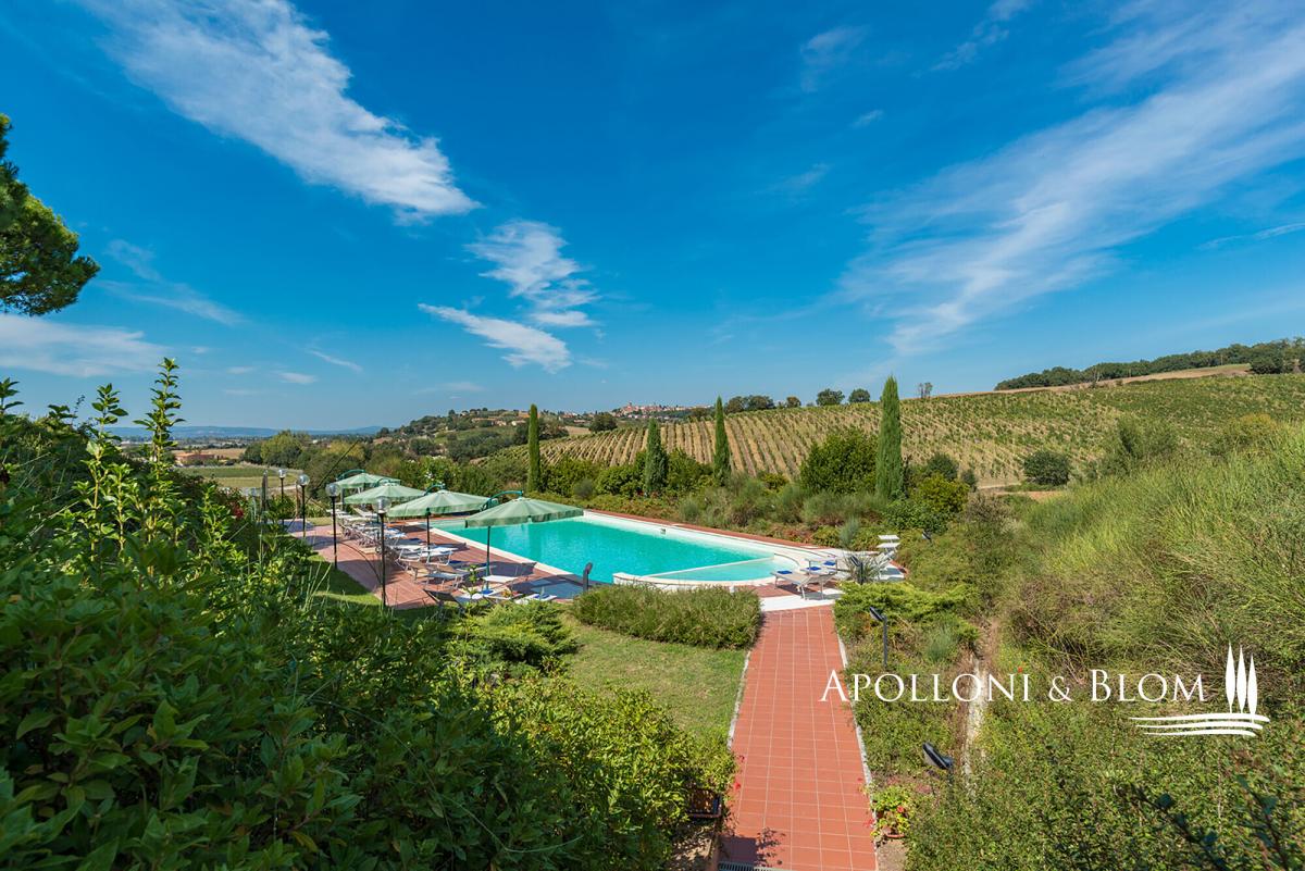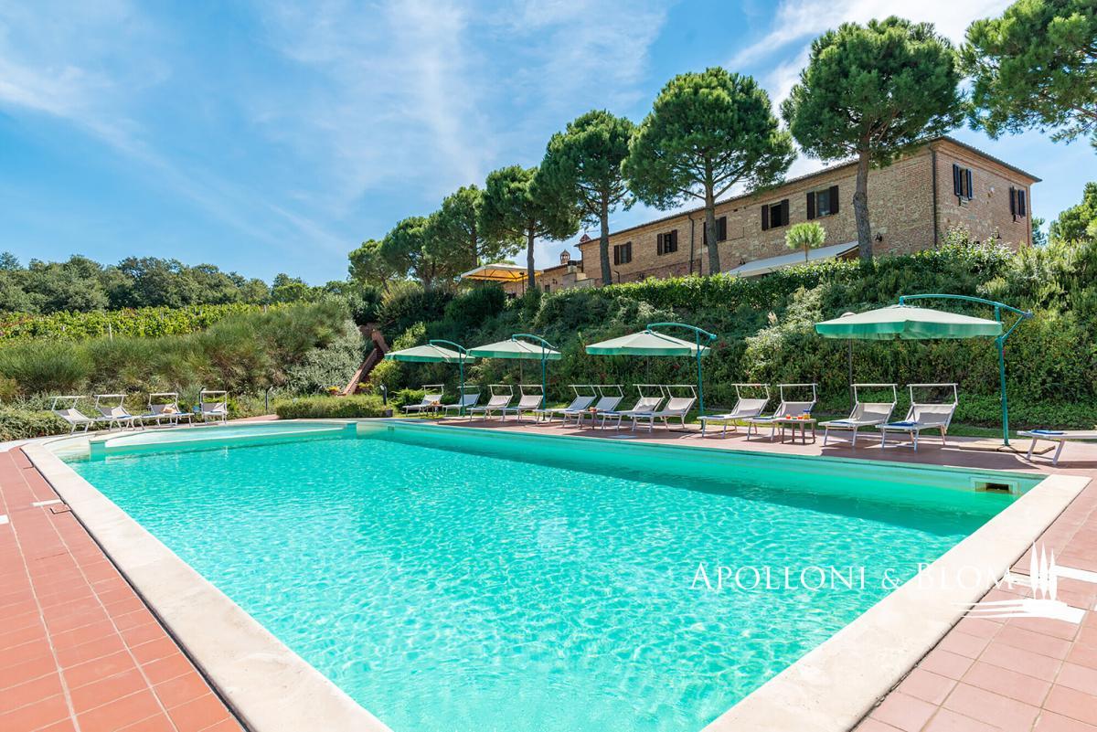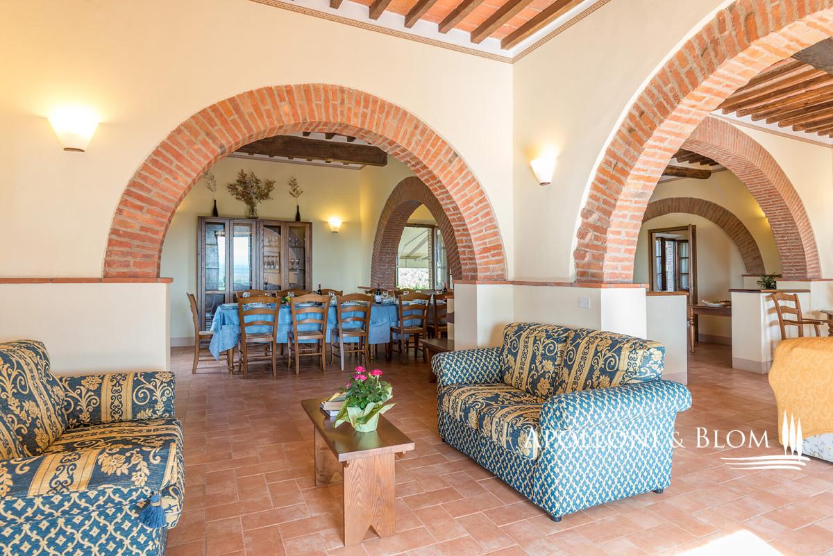 Hilltop position with endless views, agricultural land with vineyards, renovated farmhouse with pool, ready to move into, for sale in Montepulciano. Commanding a privileged hilltop position above the Valdichiana, this distinguished historic country villa offers an exceptional expression of Tuscan living. Approached by a stately cypress-lined avenue that winds gracefully to the crest of the hill, the property opens to uninterrupted, panoramic views that sweep across the rolling vineyards, medieval hilltop towns, and the distant Umbrian hills. With its timeless architecture, restored with exacting care, and its 6 hectares of private land, this is a property that embodies both rural authenticity and refined comfort. The villa extends 535 square metres over two levels, restored with traditional brick and stone façades, classic wooden shutters and surrounded by manicured gardens shaded by mature pines and aromatic hedges. The restoration combines the rustic charm of hand-crafted terracotta floors, high beamed ceilings and brick arches with the discreet presence of modern comforts such as air conditioning and double-glazed windows. The ground floor is arranged around an impressive reception hall, where four great brick arches frame a sequence of inviting sitting and dining areas, creating an atmosphere of convivial elegance. The adjoining kitchen opens directly onto the garden and a shaded dining terrace, perfectly positioned for al fresco entertaining with enchanting views over the swimming pool and the countryside beyond. From the garden, independent entrances lead to two guest bedrooms and a self-contained one-bedroom apartment, ideal for visiting friends or staff accommodation. On the upper level, four further double bedrooms, each distinguished by warm natural light, and far-reaching views over the vineyards and the Valdichiana. All 8 bedrooms enjoy ensuite bathrooms, four fitted with Jacuzzi. The landscaped grounds, graced by a swimming pool framed with terracotta sundeck, provide a seamless connection to the surrounding hills. Here, 3 hectares of productive vineyards produce the prestigious Rosso di Montepulciano DOC from Sangiovese grapes, along to the 3-hectare forest. Perfectly positioned within minutes of Montepulciano, Cortona and Lake Trasimeno, and just 20 minutes from the A1 motorway, the property enjoys excellent accessibility without compromising its secluded charm. It stands as an ideal private residence or as an exclusive retreat offering guests the quintessential Tuscan experience – fine wine, timeless landscapes and an atmosphere of effortless elegance. PROPERTY Ref: MTP3110 Location: Montepulciano, Province: Siena, Region: Tuscany Type: 535 sq m/5758 sq ft two-story country house with swimming pool, landscaped garden and agricultural land with vineyards Annex: 21 sq m/226 sq ft technical room Year of construction: 1500 Conditions: excellent Land/Garden: a total of 6,8 hecaters of private land including 3500 sq m/0.8 acres of landscaped garden featuring tall pine trees and cypress, aromatic shrubs, barbecue area and outdoor masonry kitchen, along with a further 6 hectares/14.8 acres of agricultural land, including 3 hectares/7.4 acres of vineyard producing Rosso di Montepulciano DOC and 3 3 hectares/7.4 acres of woodland Swimming pool: 10x5m with Roman-style steps and a 5x3.5 m Jacuzzi, terracotta-paved sundeck and access paths, offering enchanting views over the vineyards Utilities: Fixed telephone network: available Internet: available Heating: LPG Water: arthesian well for domestic and irrigation use Electricity: available Air conditioned Water waste: Imhoff tank Distance from services: 2,5 km Distance from main airports: Perugia 80 km, Firenze 140 km Layout: Ground Floor: large living hall with 4 arches, live-in kitchen, 1 guest toilet and 1 storage room; with separate access from the garden: 2 bedrooms with en-suite bathrooms, 1 storage/cellar room, and a 60 sq m/645 sq ft apartment comprising living room with fireplace, kitchen, 1 bedroom and 1 bathroom with Jacuzzi First Floor: accessed via external staircase, 4 bedrooms each with en-suite bathroom- garden