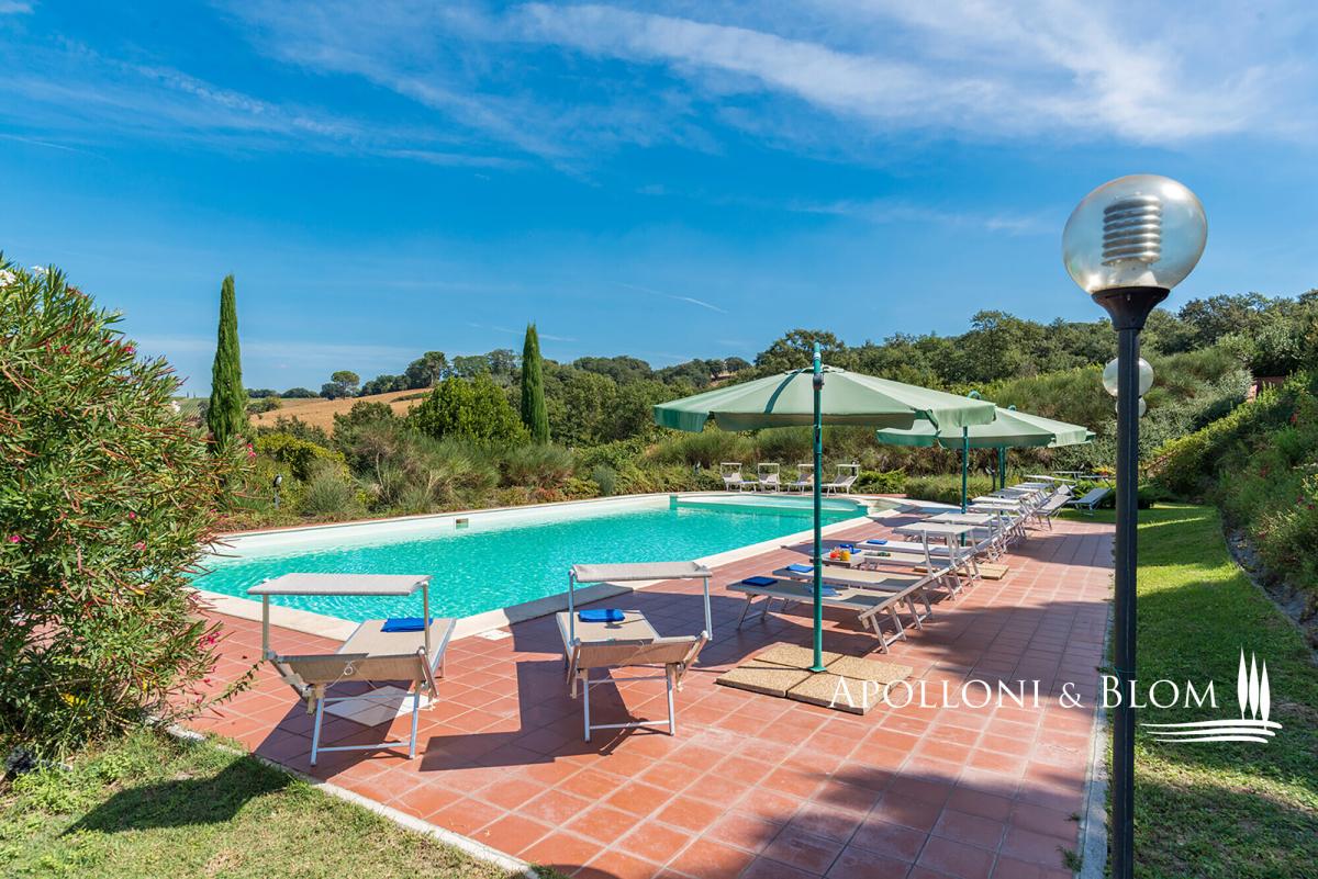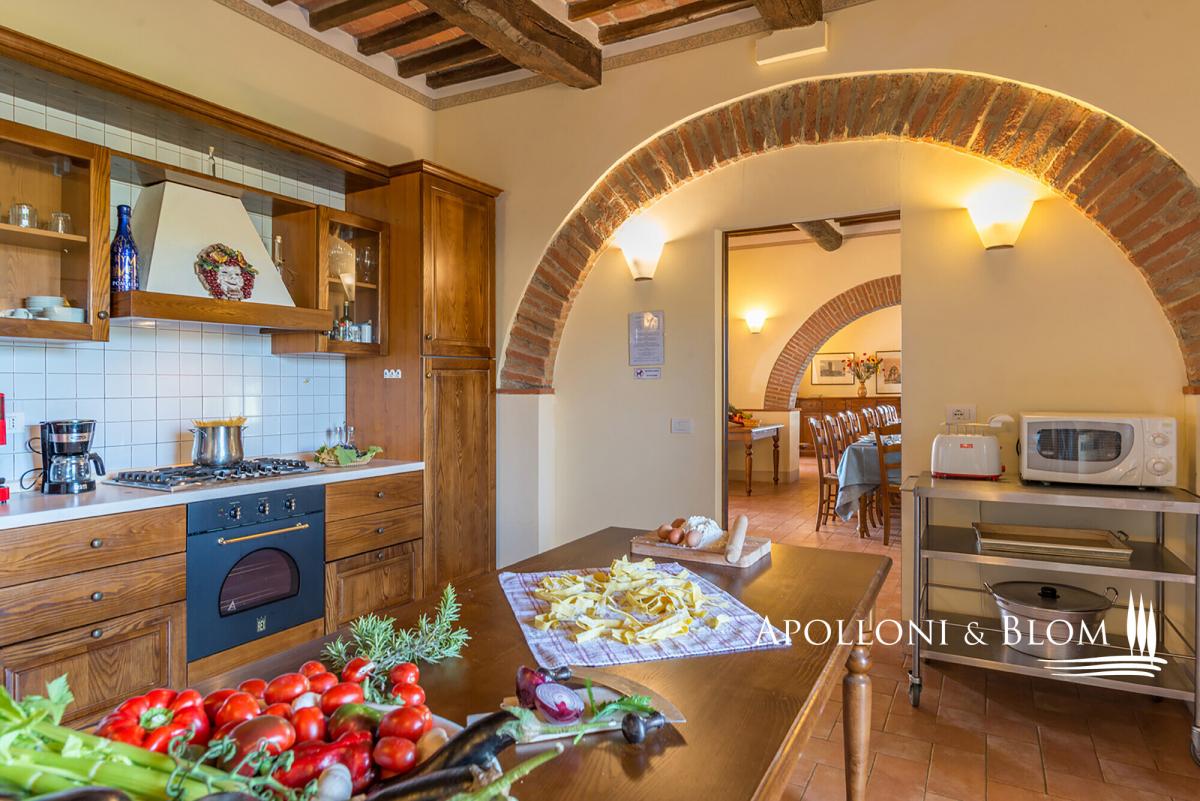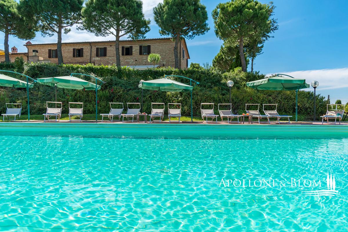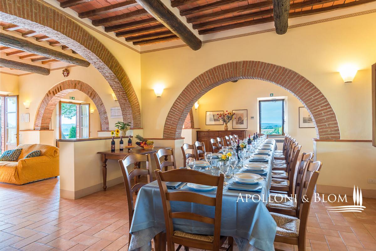 Hilltop position with endless views, agricultural land with vineyards, renovated farmhouse with pool, ready to move into, for sale in Montepulciano. Commanding a privileged hilltop position above the Valdichiana, this distinguished historic country villa offers an exceptional expression of Tuscan living. Approached by a stately cypress-lined avenue that winds gracefully to the crest of the hill, the property opens to uninterrupted, panoramic views that sweep across the rolling vineyards, medieval hilltop towns, and the distant Umbrian hills. With its timeless architecture, restored with exacting care, and its 6 hectares of private land, this is a property that embodies both rural authenticity and refined comfort. The villa extends 535 square metres over two levels, restored with traditional brick and stone façades, classic wooden shutters and surrounded by manicured gardens shaded by mature pines and aromatic hedges. The restoration combines the rustic charm of hand-crafted terracotta floors, high beamed ceilings and brick arches with the discreet presence of modern comforts such as air conditioning and double-glazed windows. The ground floor is arranged around an impressive reception hall, where four great brick arches frame a sequence of inviting sitting and dining areas, creating an atmosphere of convivial elegance. The adjoining kitchen opens directly onto the garden and a shaded dining terrace, perfectly positioned for al fresco entertaining with enchanting views over the swimming pool and the countryside beyond. From the garden, independent entrances lead to two guest bedrooms and a self-contained one-bedroom apartment, ideal for visiting friends or staff accommodation. On the upper level, four further double bedrooms, each distinguished by warm natural light, and far-reaching views over the vineyards and the Valdichiana. All 8 bedrooms enjoy ensuite bathrooms, four fitted with Jacuzzi. The landscaped grounds, graced by a swimming pool framed with terracotta sundeck, provide a seamless connection to the surrounding hills. Here, 3 hectares of productive vineyards produce the prestigious Rosso di Montepulciano DOC from Sangiovese grapes, along to the 3-hectare forest. Perfectly positioned within minutes of Montepulciano, Cortona and Lake Trasimeno, and just 20 minutes from the A1 motorway, the property enjoys excellent accessibility without compromising its secluded charm. It stands as an ideal private residence or as an exclusive retreat offering guests the quintessential Tuscan experience – fine wine, timeless landscapes and an atmosphere of effortless elegance. PROPERTY Ref: MTP3110 Location: Montepulciano, Province: Siena, Region: Tuscany Type: 535 sq m/5758 sq ft two-story country house with swimming pool, landscaped garden and agricultural land with vineyards Annex: 21 sq m/226 sq ft technical room Year of construction: 1500 Conditions: excellent Land/Garden: a total of 6,8 hecaters of private land including 3500 sq m/0.8 acres of landscaped garden featuring tall pine trees and cypress, aromatic shrubs, barbecue area and outdoor masonry kitchen, along with a further 6 hectares/14.8 acres of agricultural land, including 3 hectares/7.4 acres of vineyard producing Rosso di Montepulciano DOC and 3 3 hectares/7.4 acres of woodland Swimming pool: 10x5m with Roman-style steps and a 5x3.5 m Jacuzzi, terracotta-paved sundeck and access paths, offering enchanting views over the vineyards Utilities: Fixed telephone network: available Internet: available Heating: LPG Water: arthesian well for domestic and irrigation use Electricity: available Air conditioned Water waste: Imhoff tank Distance from services: 2,5 km Distance from main airports: Perugia 80 km, Firenze 140 km Layout: Ground Floor: large living hall with 4 arches, live-in kitchen, 1 guest toilet and 1 storage room; with separate access from the garden: 2 bedrooms with en-suite bathrooms, 1 storage/cellar room, and a 60 sq m/645 sq ft apartment comprising living room with fireplace, kitchen, 1 bedroom and 1 bathroom with Jacuzzi First Floor: accessed via external staircase, 4 bedrooms each with en-suite bathroom- garden