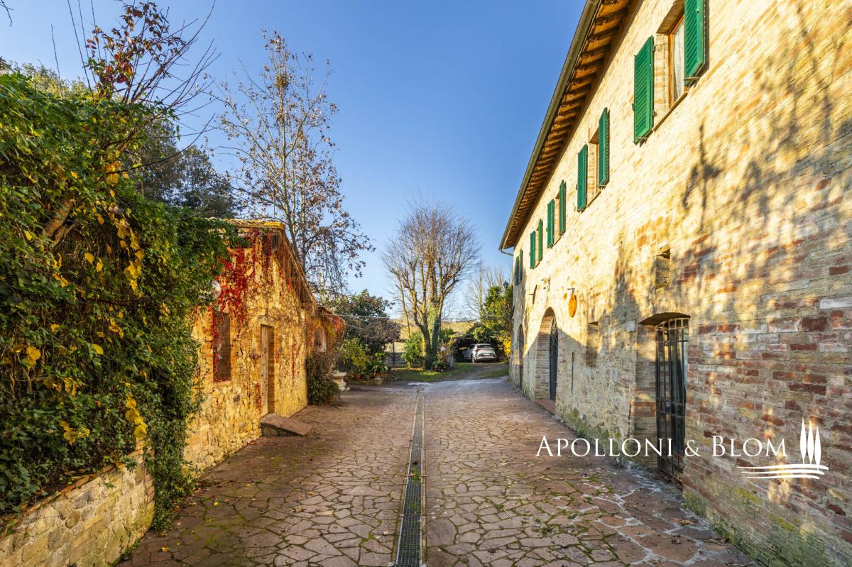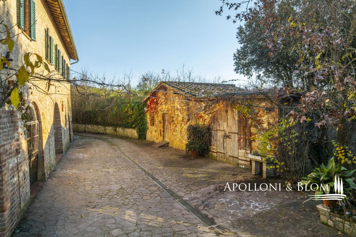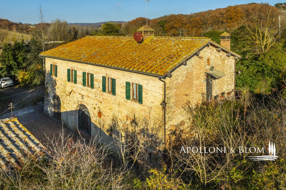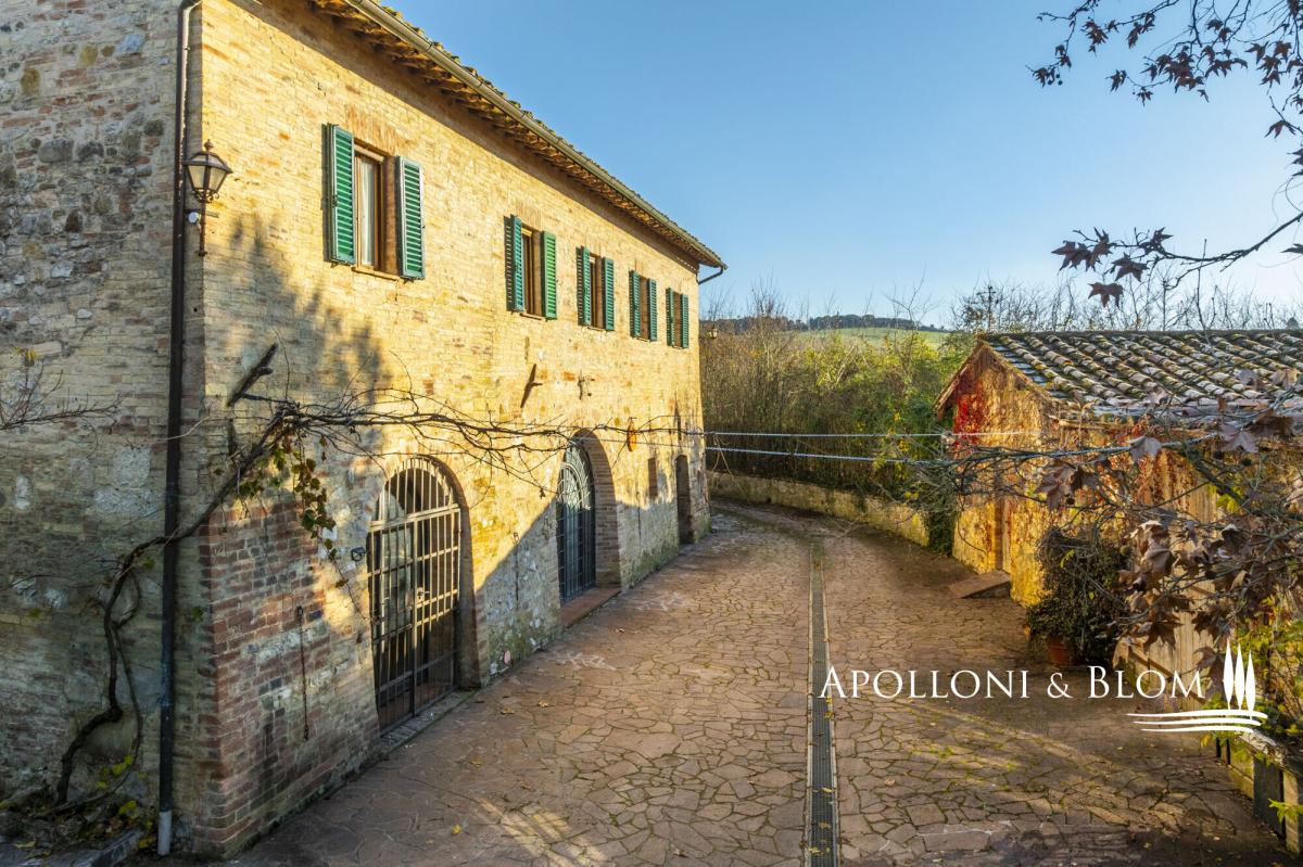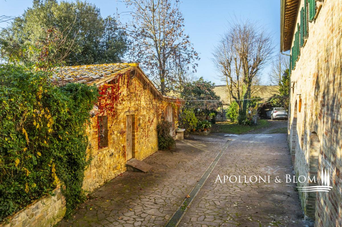 For horse lovers, a two-story country house on a farm with riding stables, available for sale exclusively in Siena. This is a timeless Tuscan old mill dating back to the 1500s, offered in an exceptional location close to Siena. Positioned a mere 5 kilometers from the city gates of Siena, this refined 16th-century former mill occupies a strategic vantage point within a traditional Tuscan farm, offering immediate access to professional riding stables. The two-story house extends to approximately 337 square metres, surrounded by 0.38 hectares of fully fenced land with three gates, one of which is automatic, creating a private and secure setting. Interiors are warm and atmospheric, defined by terracotta floors throughout, featuring striking vaulted ceilings, exposed wooden beams and brick arches. The ground floor opens into a generous living space with fireplace and kitchen, designed for convivial living, while the upper floor offers a relaxed layout with a sitting room and fireplace, a kitchen with dining area, a study, two bedrooms and two bathrooms. The house is presented in good condition and is partly furnished, allowing for immediate enjoyment while leaving scope for personal refinement. Two annexes, a barn and a smaller outbuilding, complement the main residence and offer further potential, whether for storage, studio space or future enhancement. Set amid classic Tuscan scenery and riding stables, the property enjoys a rare balance of rural tranquillity and accessibility. PROPERTY Ref: SIE3437 Location: Monteriggioni, Province: Siena, Region: Tuscany Type: 337 sq m/3627 sq ft two-story classic country house with 2 annexes and garden, within a traditional Tuscan farm Annexes: a 55 sq m/592 sq ft barn and a 18 sq m/193 sq ft annex Year of construction: 1800 Year of restoration: 1995 Conditions: good Land/Garden: 0,38 hectares/0.94 acres fully fenced land with three gates, one of which is automatic Utilities: Fixed telephone network: available Internet: available Heating: LPG Water: mains city supply Electricity: available Water waste: Imhoff tank Partly furnished Terracotta flooring throughout Distance from services: 5 km Distance from main airports: Florence 70 km Layout: Ground Floor: large open-plan living area featuring striking vaulted ceilings, brick arches, fireplace and a kitchen, 1 courtesy bathroom First Floor: sitting room with fireplace, kitchen with dining area, high ceilings with wooden beams, study, 2 bedrooms and 2 bathrooms- garden