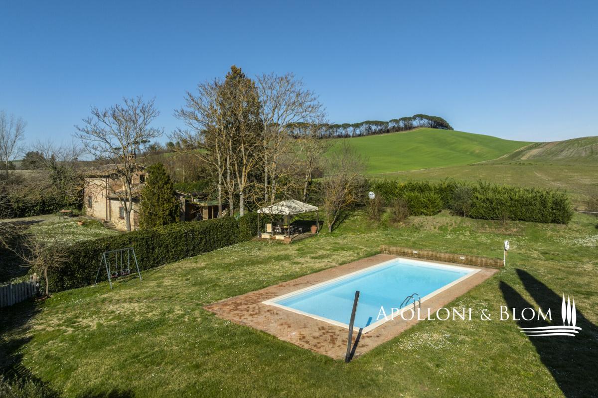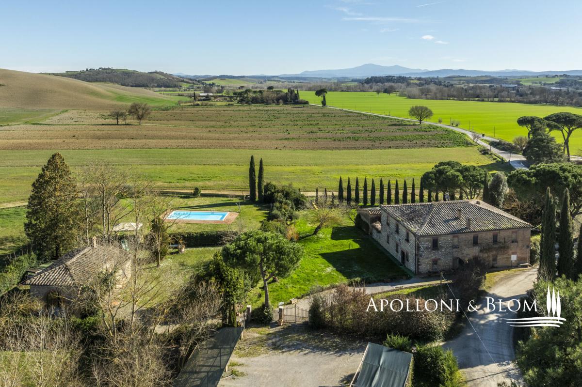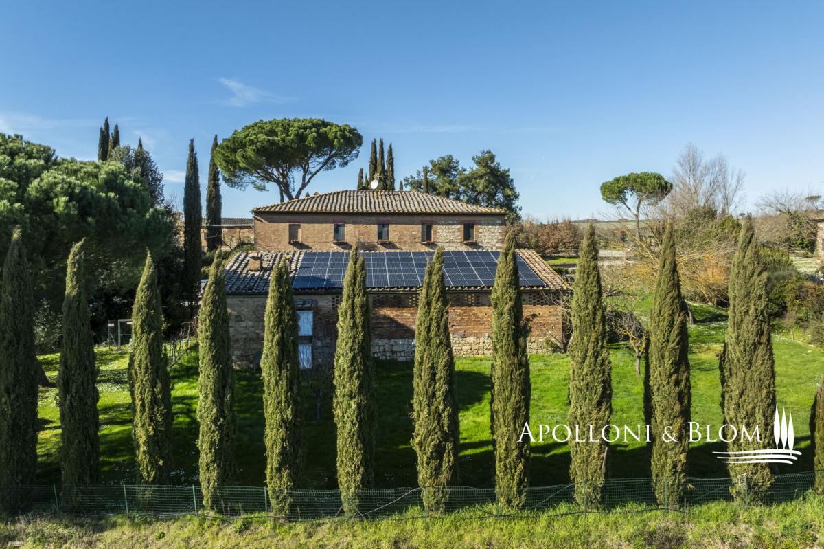Authentic hunting lodge, historic features, guest house, air conditioning, electric car station, white truffle reserve, for sale south of Siena. Prime setting, just ten minutes south of Siena, in the heart of the Val d’Arbia and within easy reach of the Crete Senesi, Montalcino and the Val d’Orcia, this distinguished mid-18th-century country residence stands in a private yet convenient position, moments from local shops and amenities. Formerly the hunting lodge of a noble Sienese family, the estate enjoys views across the Tuscan countryside, framed by cypress avenues and Mediterranean planting. Extending to approximately 800 sq m (8611 sq ft), it features a casale arranged around an internal courtyard paved in natural stone, paired with a graceful three-arched former barn, and a two-story guest cottage. The casale ground floor retains magnificent vaulted terracotta ceilings, while the upper level is characterised by exposed timber beams. The accommodation is presently configured as five independent apartments within the main house, each offering one or two bedrooms, complemented by a charming two-storey guest cottage with a further two bedrooms. In addition, ancillary living areas and a traditional bread oven. The estate holds an agriturismo licence for 20 guests and benefits from an established international clientele with a weekly renting rate of 12.000 USD. The property is equipped with a 20 kW photovoltaic system providing sustainable energy and hot water production, alongside air conditioning, and an electric vehicle charging station. A panoramic heated swimming pool with jacuzzi, sun terraces and a volleyball court complete the leisure amenities. Of particular distinction is the private white truffle reserve within the woodland. The landscaped grounds extend to 4 hectares (10 acres), comprising formal gardens, pasture, woodland, and organically cultivated arable land. An estate of notable heritage and environmental sensitivity, combining renewable energy, agricultural potential and refined hospitality, all within immediate proximity to one of Tuscany’s most celebrated cultural centres. PROPERTY Ref: SIE3554 Location: Val d'Arbia, Province: Siena, Region: Tuscany Type: 570 sq m/6135 sq ft two-story 18th-century country house plus inner courtyard, 2 annexes for a further 230 sq m/2475 sq ft including a former barn with living area, bread oven, and a two-story guest house, surrounded by landscaped gardens, heated swimming pool, volleyball court, solar energy, farmland with white truffle reserve Year of construction: 1750 Year of renovation: 2000 and 2023 Condition: excellent Land: 4.07 hectares/10 acres consisting of approx. 2460 sq mt/0.6 acres of garden, approx. 3.6 ha/9 acres of arable land with organic production, 880 sq mt/0.2 acres of pasture land and 0.67 ha/1.6 acres of woodland with a white truffle reserve Swimming Pool: 12x5 mt heated pool featuring a solar shower and a shaded area sundeck, an underground technical room with a heat pump Parking: 8 shaded parking spaces Utilities: Fixed telephone line: available Internet/Wifi: available broadband Heating: LPG with in-ground tank + solar energy for hot water Water: mains city supply for domestic use + 1 well + authorised irrigation from nearby river and underground tank Electricity: available + 20 kW photovoltaic system Air conditioning Jacuzzi Electric vehicle charging station Solar panels Centralized drip irrigation system Agritourism license for a total of 20 pax Distance from amenities: 500 mt. Distance from main airports: Florence 95km, Perugia 105km, Pisa 135km Access: private 160 mt driveway Layout Main Country House: Ground Floor: Living room with fireplace dining and kitchen, office/reception room, bathroom Apartment 1: living room with kitchen, 2 bedrooms, 1 bathroom with shower Apartment 2: living room with kitchenette, 1 bedroom, 1 bathroom with shower First Floor: Apartment 3: living room with fireplace, kitchen, 1 master bedroom with walk-in closet and bathroom, second bedroom and 1 family bathroom Apartment 4: living room with kitchenette, 1 bedroom, 1 bathroom with shower Apartment 5: living room with kitchenette, 1 bedroom, 1 bathroom with shower Attic space of 20 sq mt/215 sq ft with a pull-out staircase used as a storage area Annexes: 1. two-storey guest house of 83 sq m with living room, kitchen, 1 double bedroom with en suite bathroom and fireplace, 1 bedroom and bathroom with Jacuzzi; 2. old barn with three arches, of 115 sq m on one level, with summer living area featuring travertine slab flooring and solar panels on the roof, a room with an original bread oven, 1 staff bathroom, 2 rooms for technical use with boiler and technological systems; 1 wooden annex for storing garden equipment.- garden