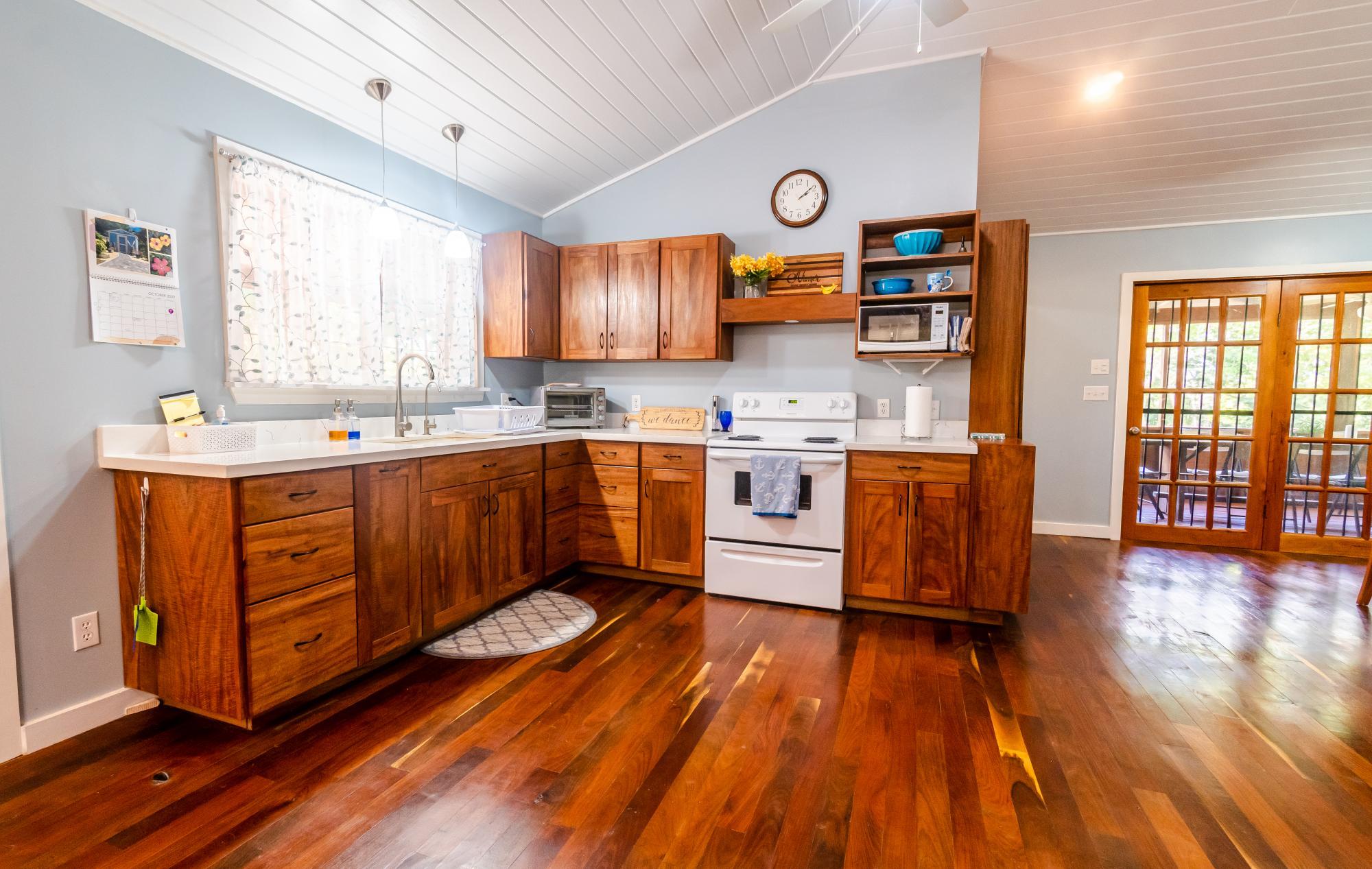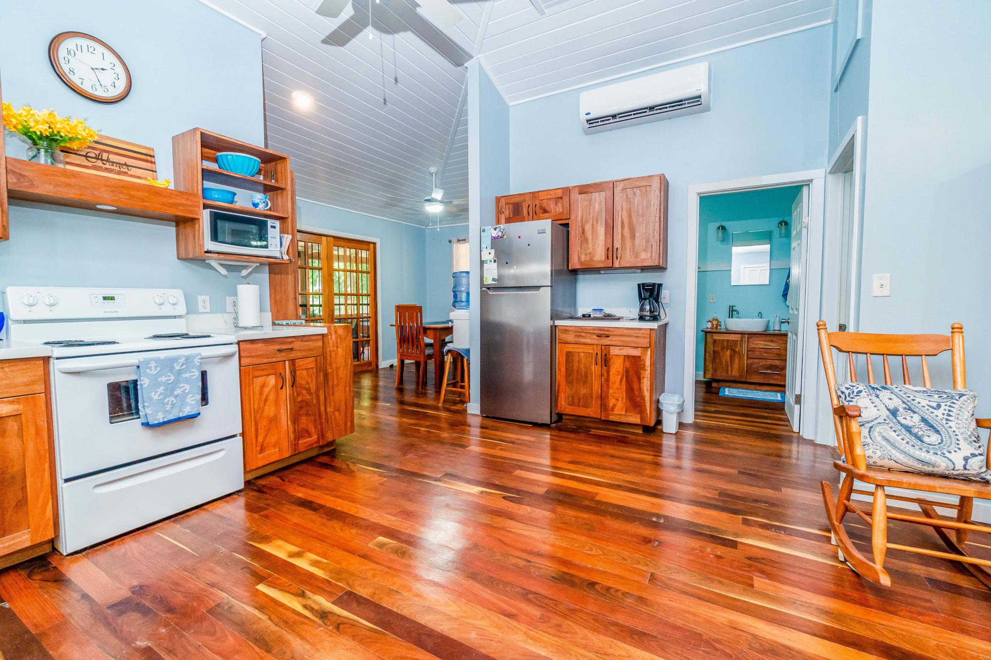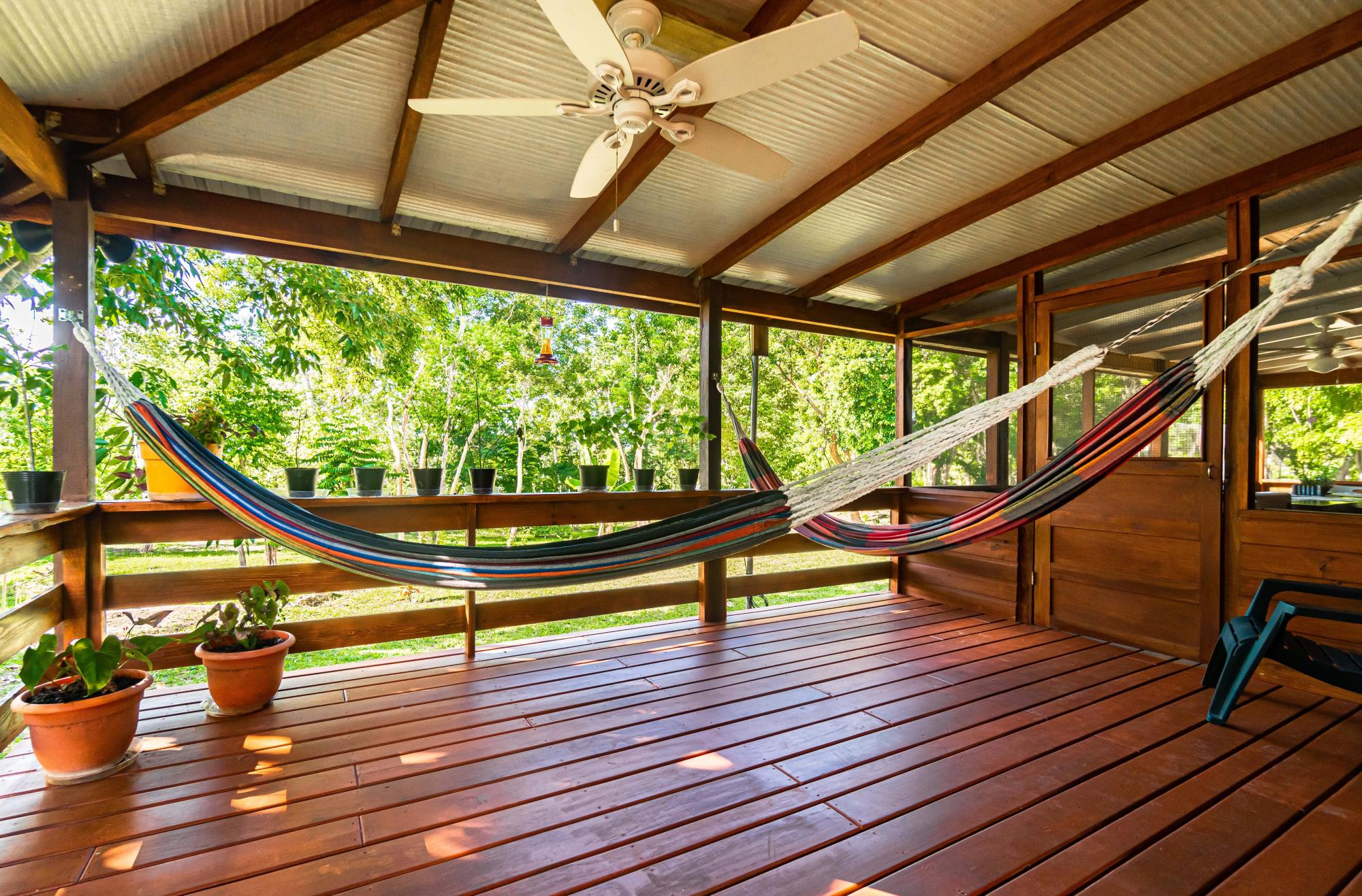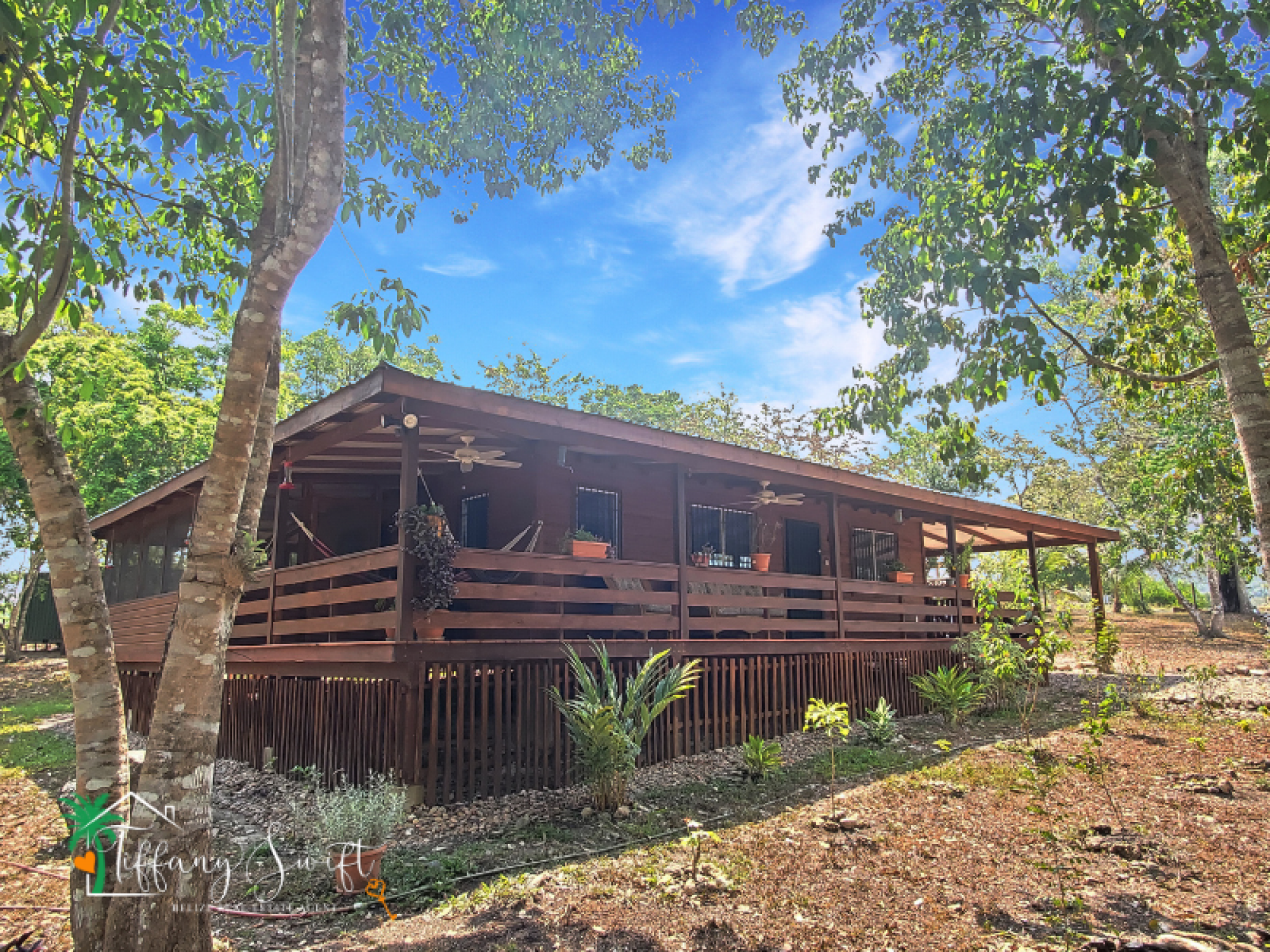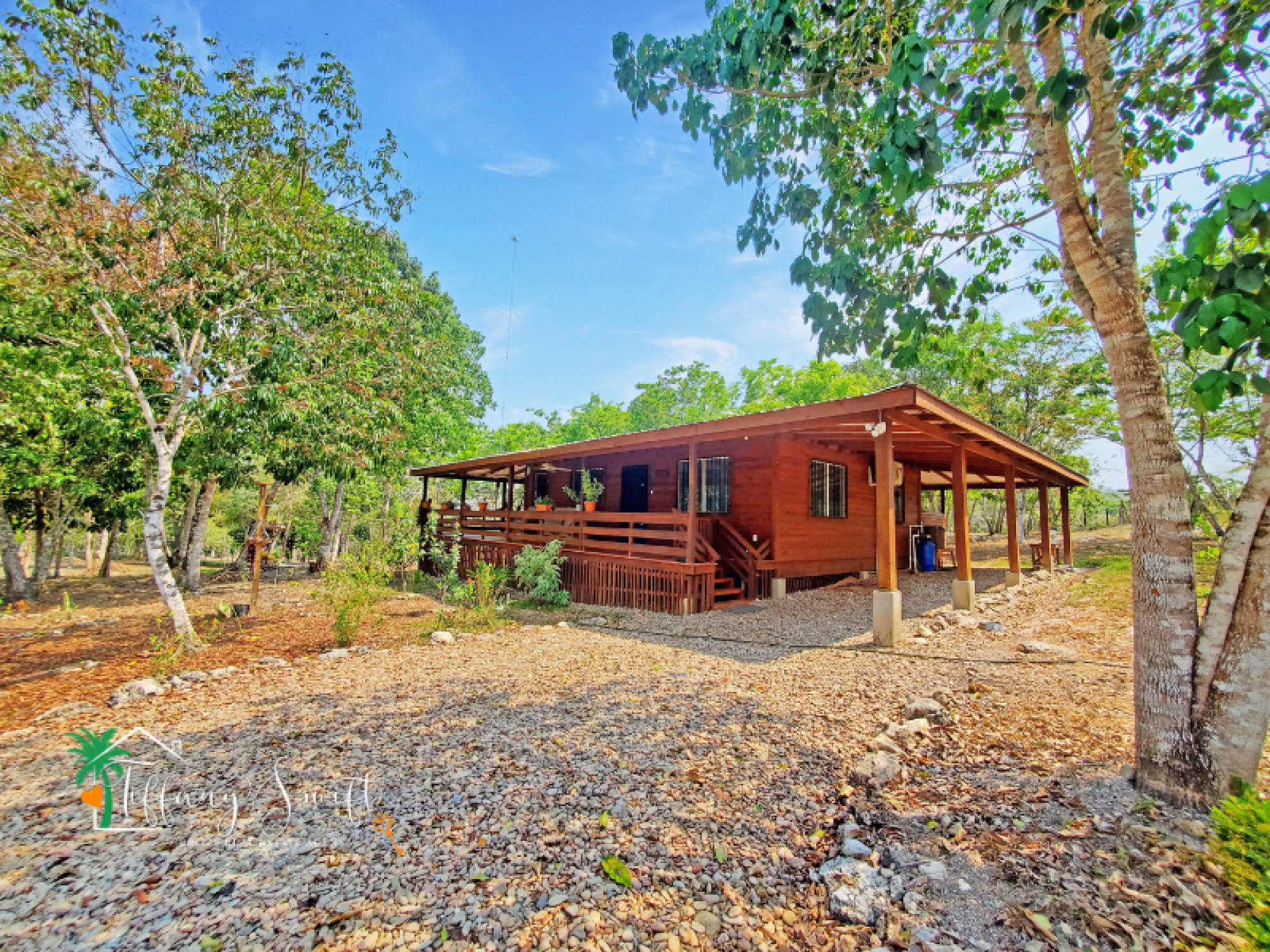 Palm Cottage is ideally situated 10 minutes from the large Mennonite community of Spanish Lookout, 15 minutes from the tourist town of San Ignacio, and 15 minutes from Belize's capital, Belmopan. The property offers convenience and ample space for various activities. The home features just under 800 sq. ft. of interior living space and nearly 900 sq. ft. of shaded and covered exterior space, frequented by hummingbirds.The interior boasts exotic Belizean hardwood floors and high, vaulted wooden ceilings, enhancing its spacious feel. The open floor plan includes a roomy living room with recliner sofas, a chef’s kitchen with ample countertop space and cabinets, a separate dining area, a master bedroom with an open-door closet, a large bathroom, and a small guest bedroom or office. Two energy-efficient air conditioners and ceiling fans throughout complete the comfort package.