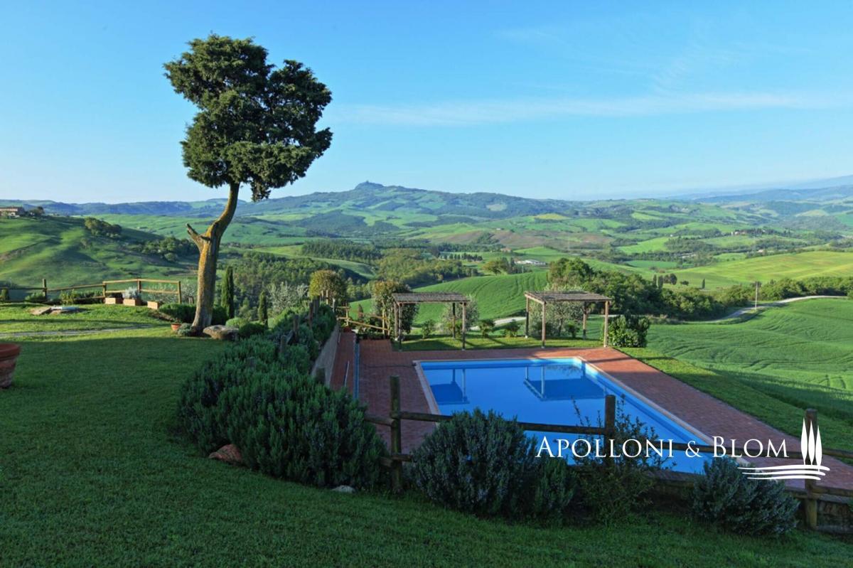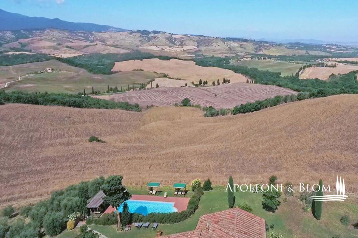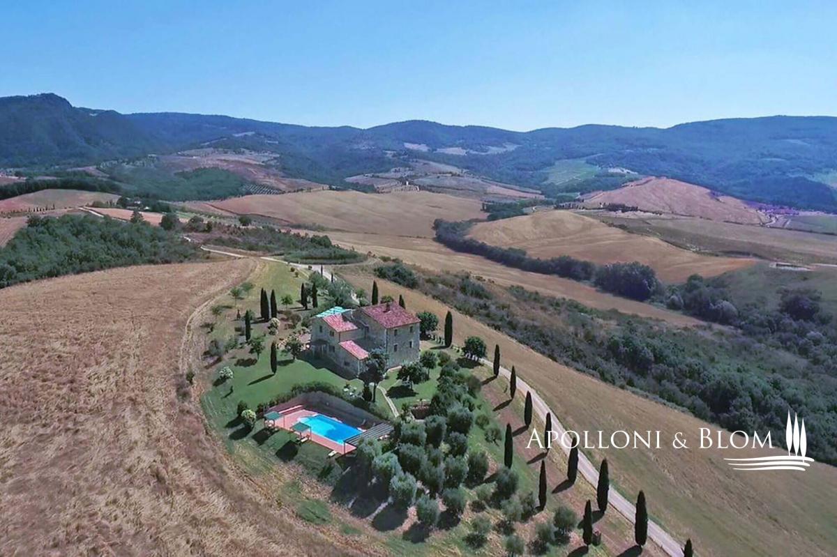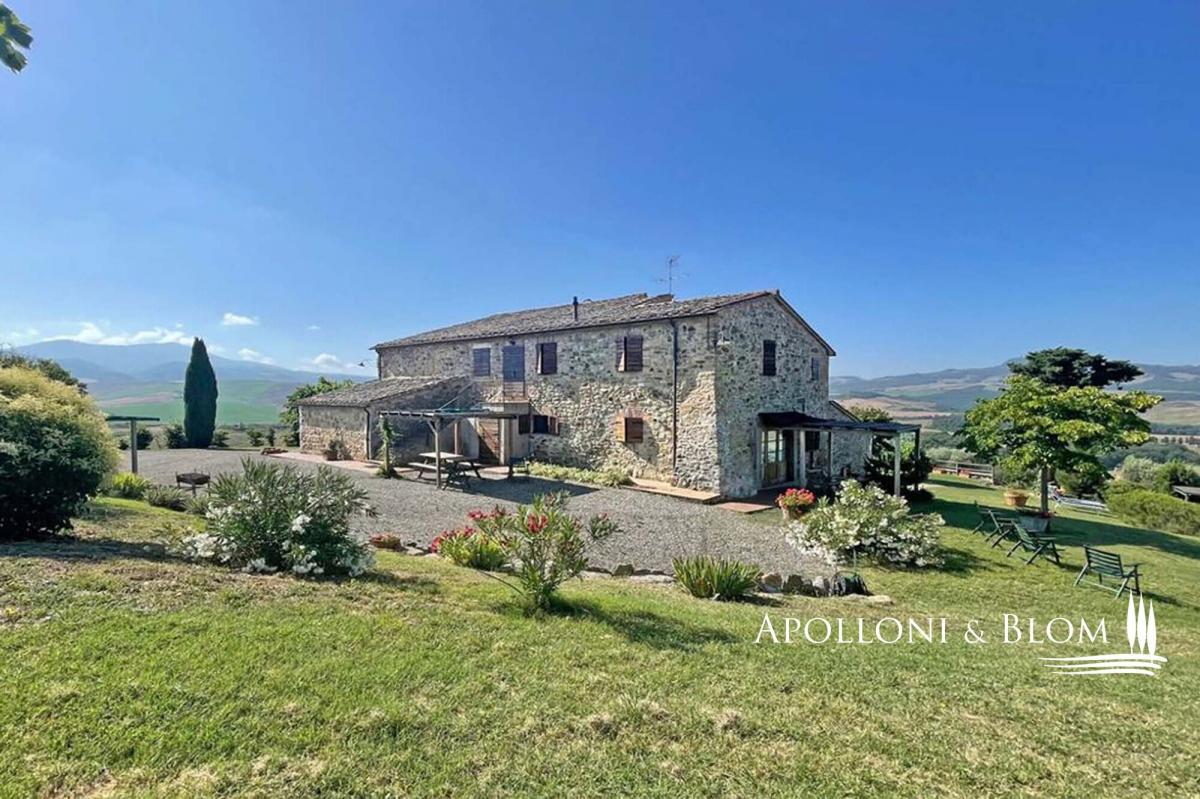 On the Tuscan hills, in a privileged position, a country house with a wide panoramic view is for sale near Sarteano. It includes an old farmhouse, a swimming pool, and 160 hectares of land. On two levels and 496 sq m/5338 sq ft is divided into five independent apartments, all well-furnished and very spacious, equipped with every comfort in compliance with the rustic Tuscan style. The farmhouse, with an articulated shape and stone structure, dates back to 1700 and was expertly renovated around 2000, maintaining the original characteristics, both in shape and materials. The roof has been duly insulated. The property, about 6 km from the nearest town and about 20 km from Pienza, can be reached after traveling about 1 km of dirt road in good condition. The facades are in stone and exposed brick, and the internal floors have wooden beams and tiles. The stable has also been renovated, with typical vaulted ceilings, while the old manger is now a lovely bench. In this farmhouse, we also find an external stone staircase that culminates in the typical loggia. The fixtures are in fine chestnut wood, the heating is powered by LPG. In the well-kept garden, you can enjoy a panoramic swimming pool, overlooking the Val d'Orcia with Mount Amiata, which stands out on the horizon in all its magnificence, with Roman steps, hydro massage, and a large paved solarium. For its generous surface and incomparable view, the farmhouse is an enviable holiday home in one of the most beautiful valleys in the world. PROPERTY Ref: VAL1216 Location: Val d'Orcia, Province: Siena, Region: Tuscany Type: 496 sq m/5338 sq ft two-story stone country house divided into 5 apartments with pool and 160 ha/395 acres land Year of construction: 1700 Year of restoration: 2003 Conditions: excellent Garden: spacious park with bbq and swimming pool; a 30-tree olive grove Land: 160 ha/395 acres, of which 110 ha/271 acres arable land, garden and roads, 25 ha/61 acres pasture, 25 ha/61 acres woods Swimming Pool: 12 x 6, in panoramic position with whirlpool and roman stair, paved solarium; chlorine Utilities: Fixed telephone line: present Internet: present Heating: Gpl + heat pump Water: mains city supply + 16.8-liter rainwater collection tank, of which 8 liters is drinkable Electricity: available Sewerage: Imhoff pit Energy Efficiency Rating: G Distance from services: 6 km Distance from main airports: Perugia 99km, Firenze 137km, Roma 194 km Gravel road: 1km Layout: Ground Floor: Apartment 1: living room with kitchenette, 2 bedrooms, 2 bathrooms Apartment 2: living room with kitchenette, bedroom, bathroom Apartment 3: studio apartment with bathroom and mezzanine First Floor: Apartment 4: living room with kitchenette, 2 bedrooms, 2 bathrooms Apartment 5: living room with fireplace, 2 bedrooms, bathroom- garden